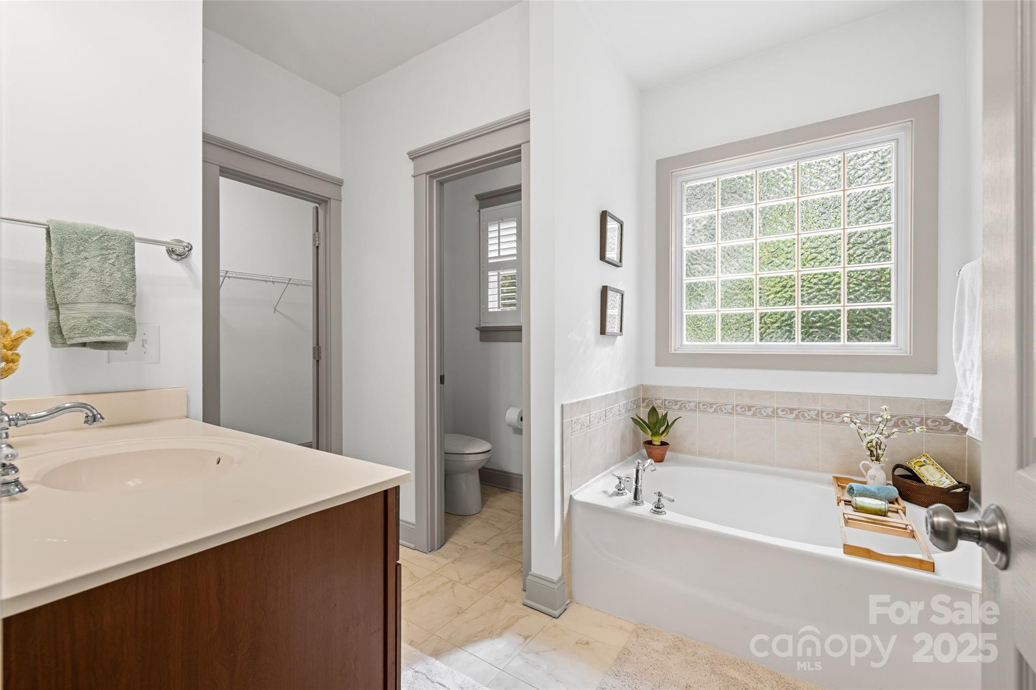 The primary suite is located on the main level and features a soaking tub, dual vanities, tiled shower, and walk-in closet.