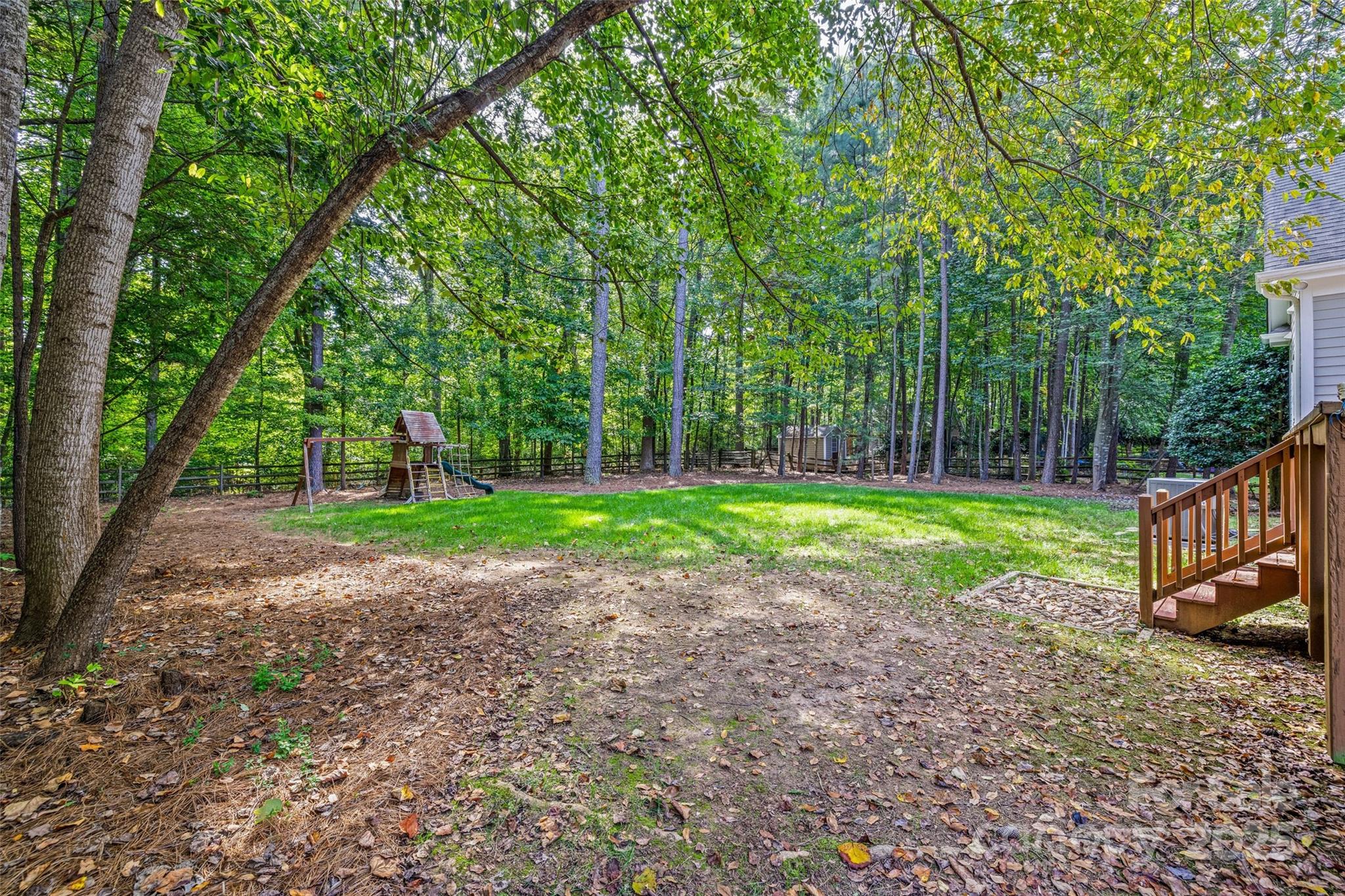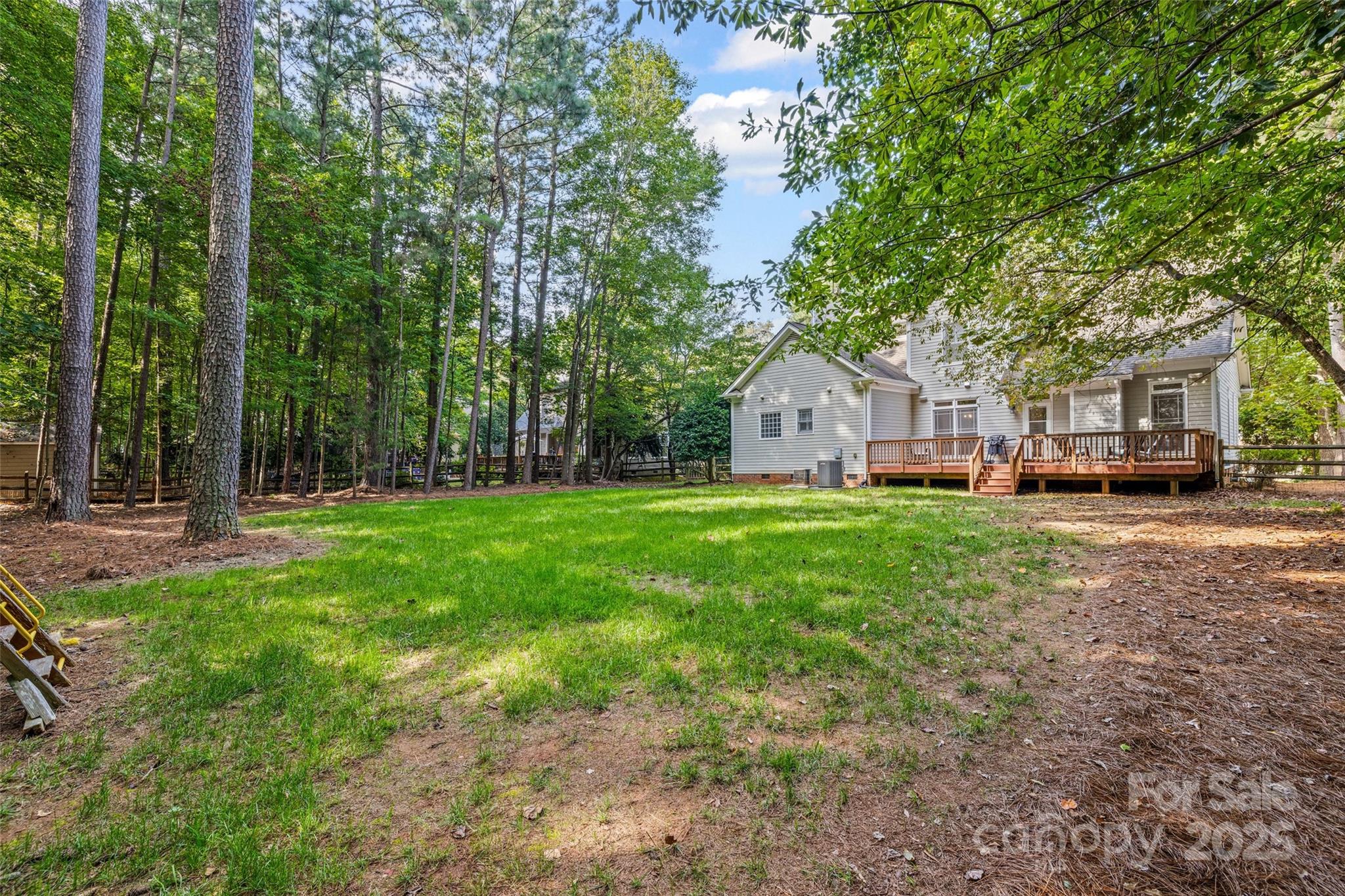 The outdoor living area includes a spacious fenced backyard and deck perfect for grilling and entertaining. Two-car garage provides additional storage.