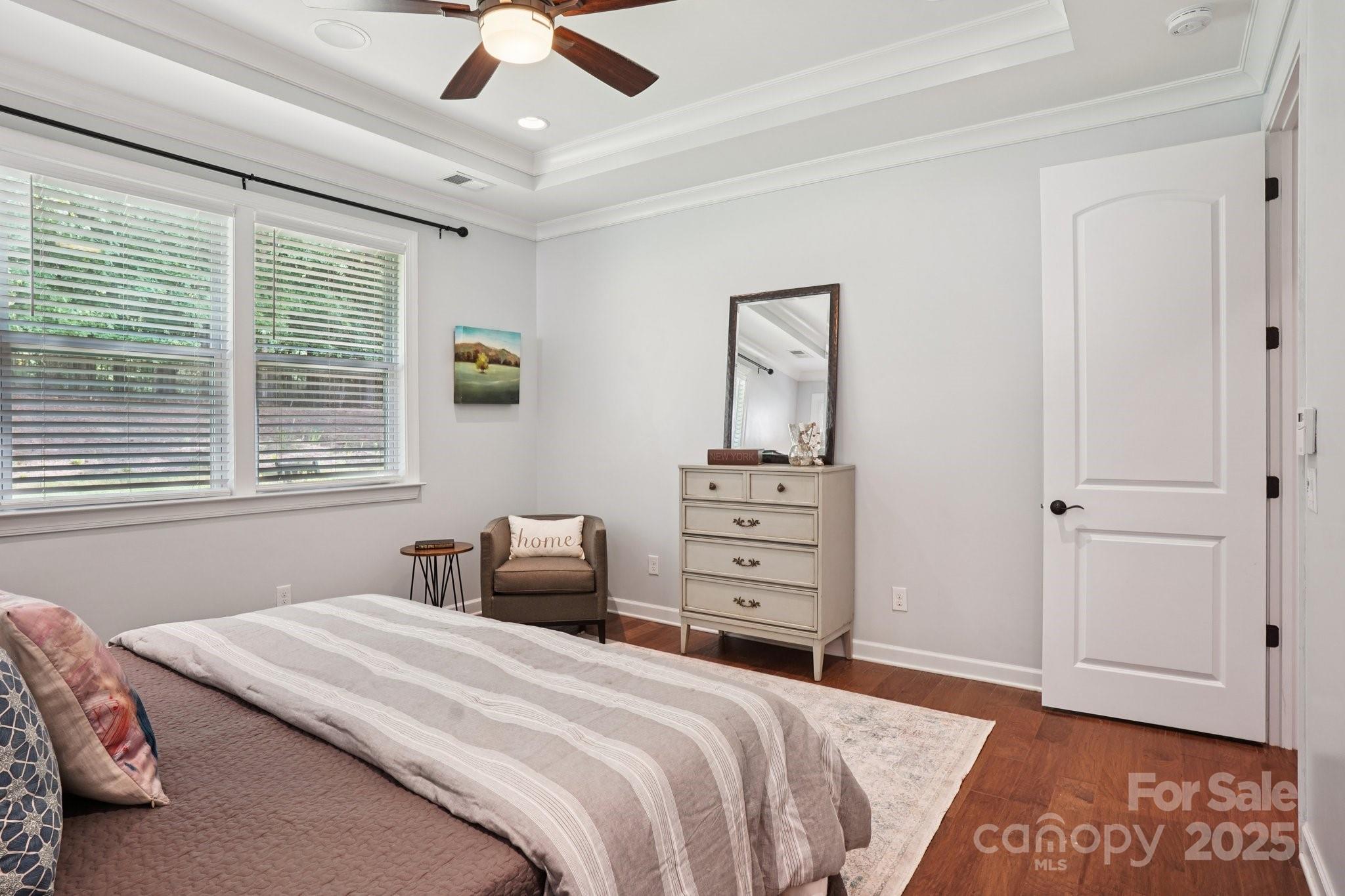 Refined designer living awaits in this former model home at Ridgewater, just minutes from all that Lake Wylie has to offer. Perfectly positioned on a quiet cul-de-sac lot, 15316 Red Canoe features a sought-after 1.5 story layout with two bedrooms on the main level. The spacious primary suite sits at the back of the home with a tray ceiling, spa-like bath, and walk-in closet. A second bedroom is tucked privately near the laundry and drop zone. The foyer opens to a French-doored home office/study and a formal dining room with tray ceiling. The upgraded kitchen shines with soft-close cabinetry, under-cabinet lighting, and stainless KitchenAid appliances. It flows seamlessly to the breakfast area and fireside living room, complete with a built-in desk/study alcove. Upstairs, you’ll find an oversized bonus/loft space plus another bedroom and full bath—ideal for guests or flex living. Outdoor living is a dream with a rocking chair front porch, screened back porch, and a large stamped concrete patio overlooking the fully fenced backyard. The 2-car garage boasts an epoxy floor, and the neighborhood offers a community pool.Welcome home!