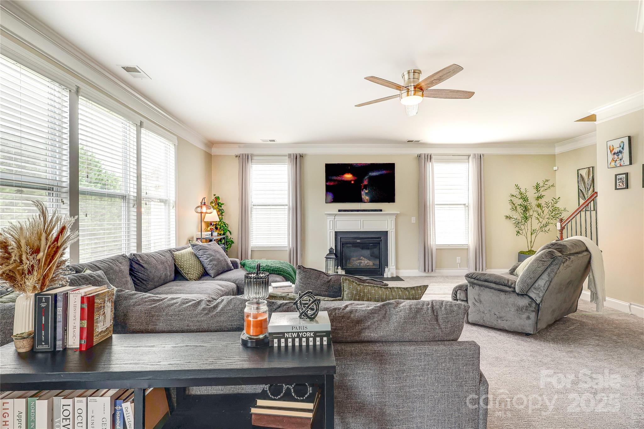 Fresh carpet and newly updated light fixtures brighten the space. A gas fireplace and abundant natural light add warmth and charm.