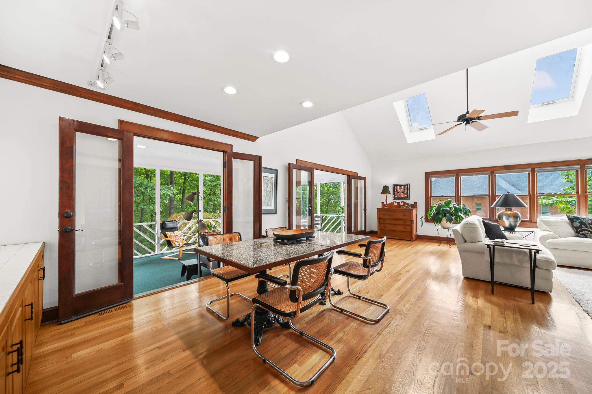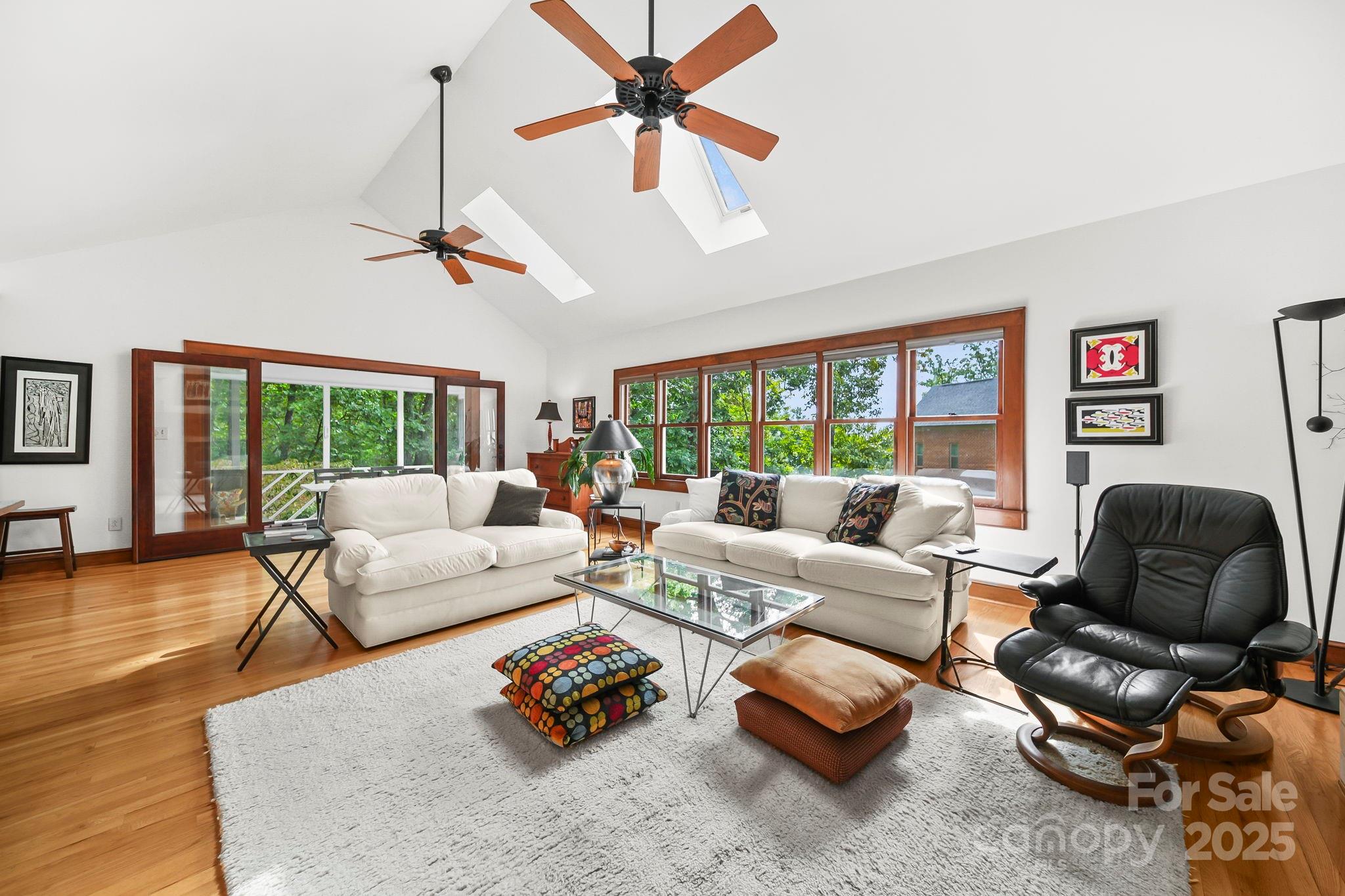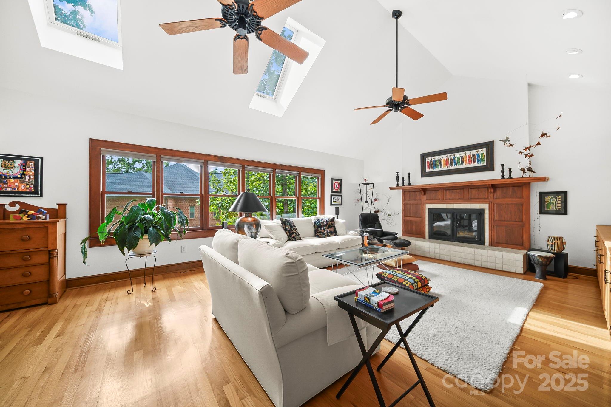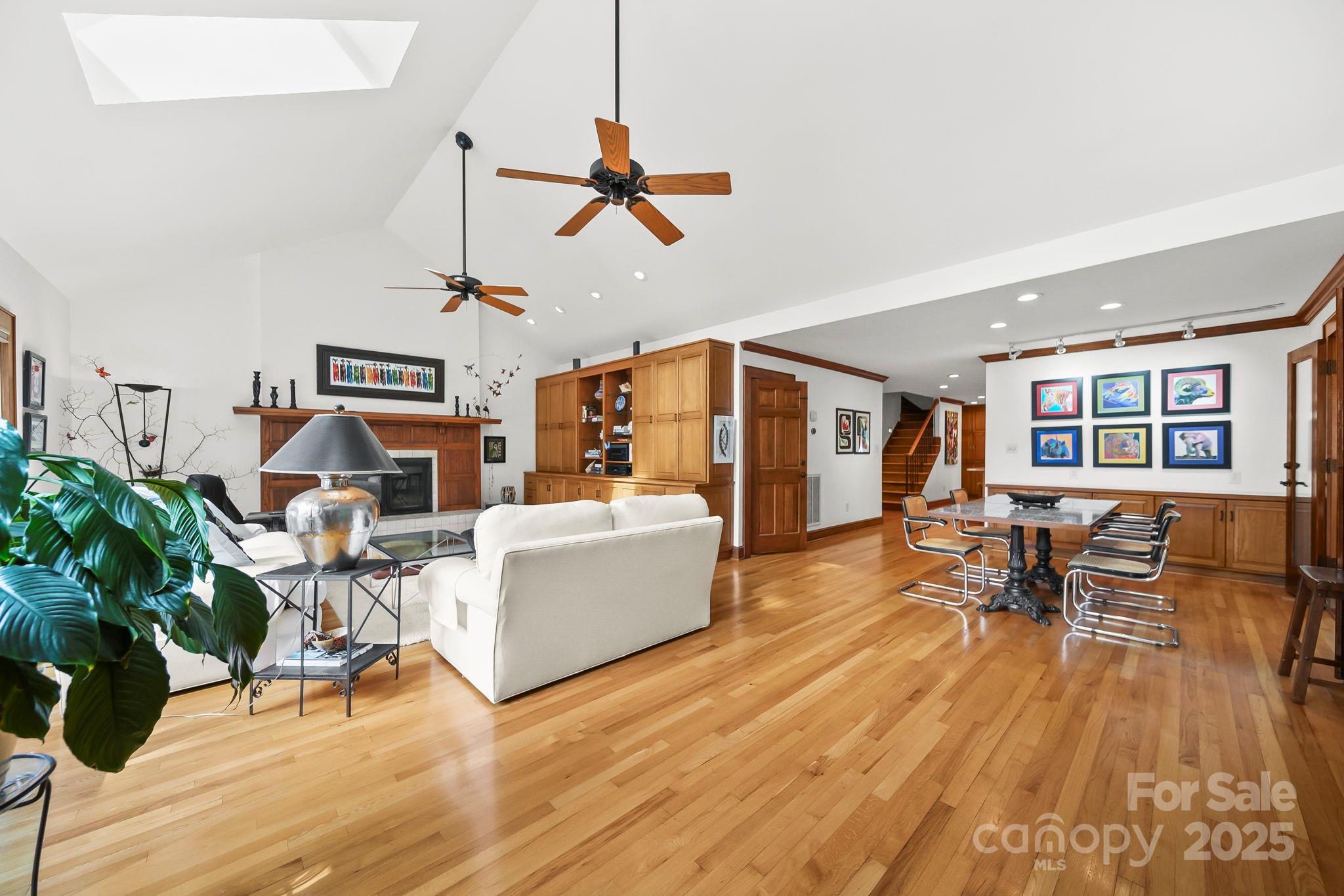 Inside the home find, rich hardwood floors, custom wood finishes, and abundant natural light create a warm and inviting atmosphere. The spacious living area with vaulted ceilings, skylights, and dual ceiling fans provides an ideal setting for relaxing or entertaining by the fireplace.