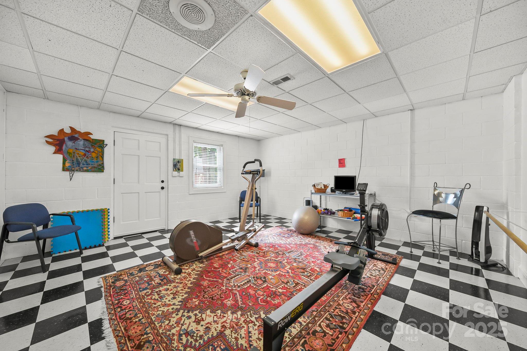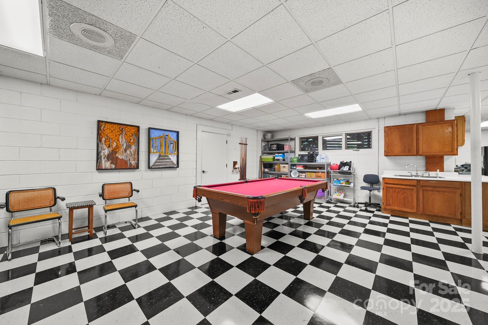 The primary suite offers a tranquil retreat with plantation shutters and a luxurious spa-inspired bathroom complete with dual vanities and a soaking tub. A versatile lower-level recreation room, with distinctive checkered flooring and ample space for games or fitness, adds flexibility for work or leisure.