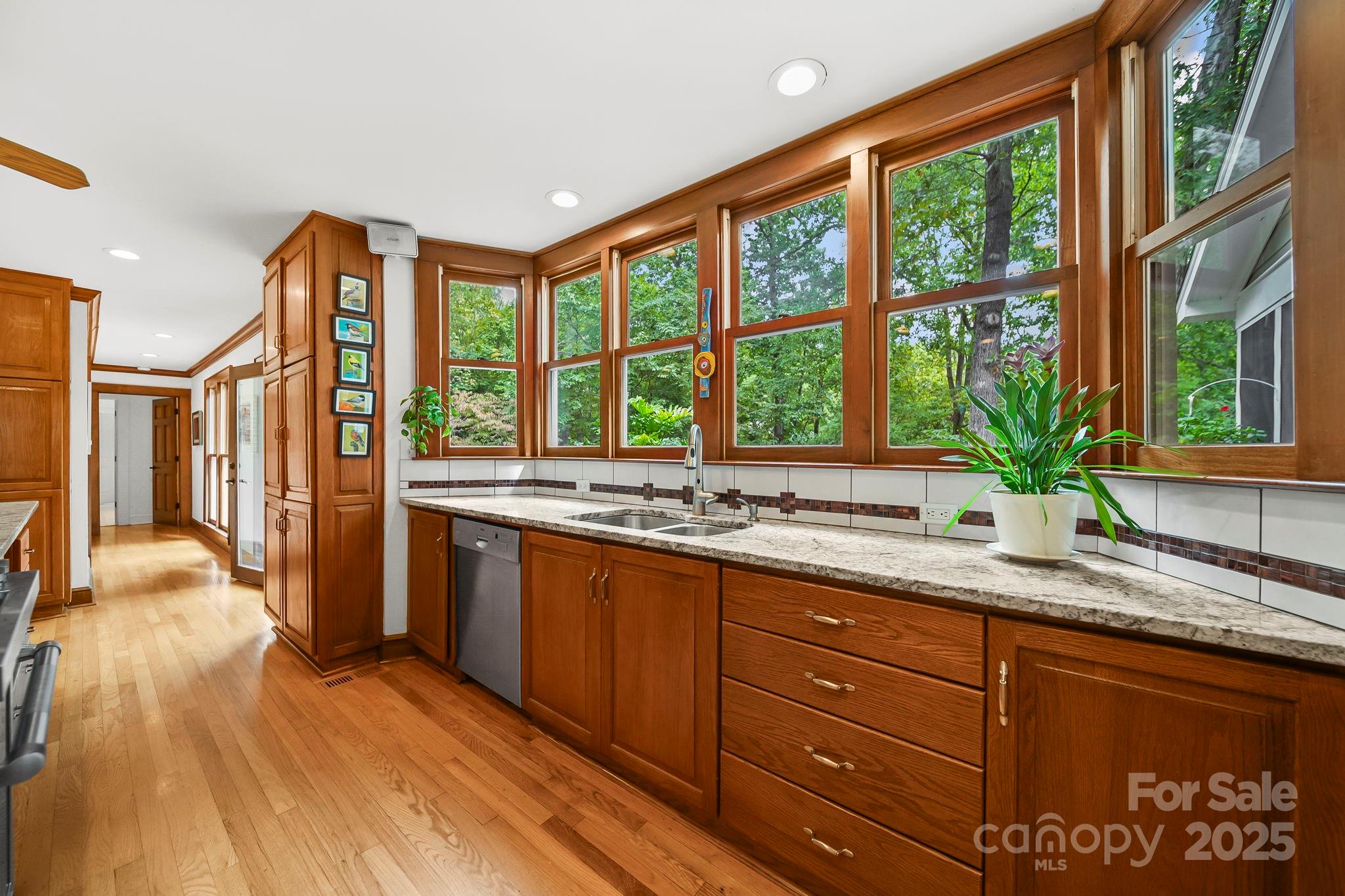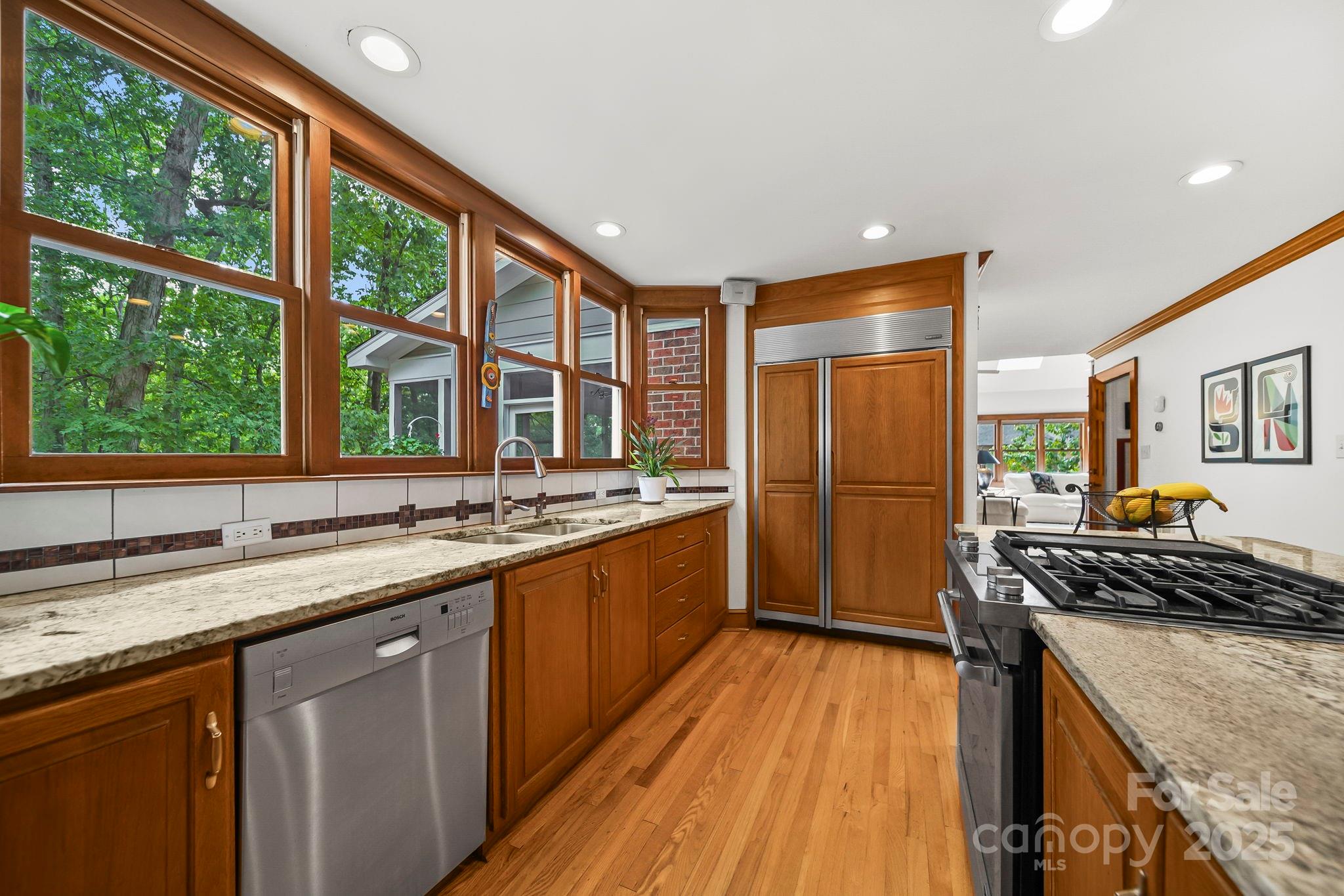 The kitchen blends seamlessly with the home’s classic design, featuring a built-in refrigerator, elegant cabinetry, and views of the surrounding greenery.