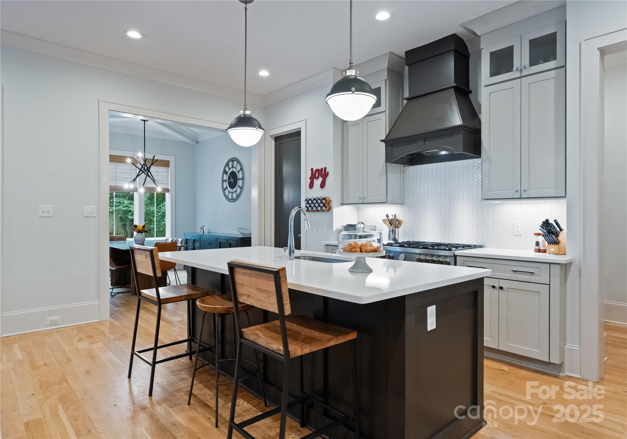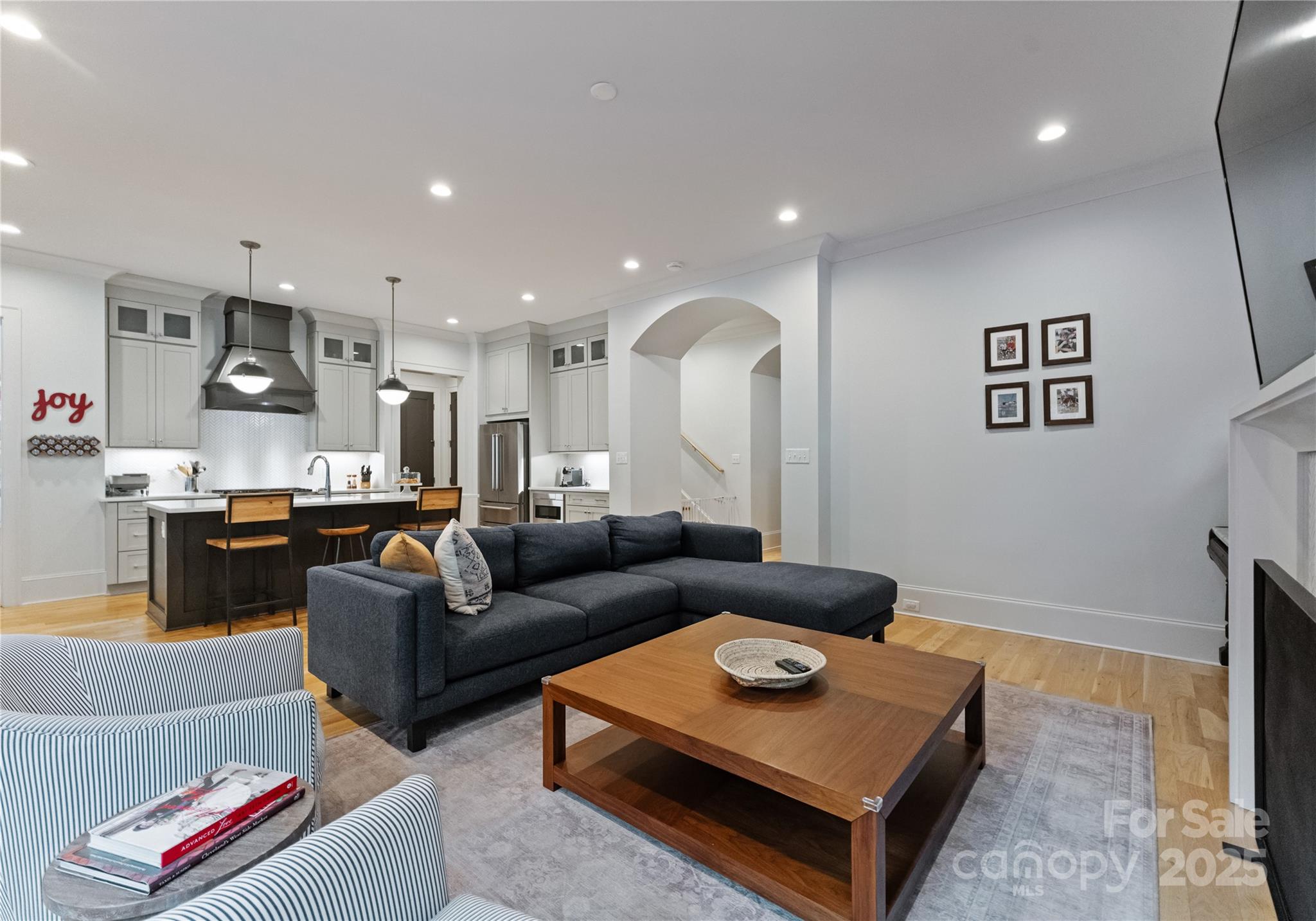 Enjoy a massive, flat fenced backyard designed for entertaining, complete with a hardscaped patio, built-in firepit, outdoor kitchen with grill, and lush professional landscaping. Inside, elegant details shine—site-finished white oak floors, arched openings, custom trim, coffered ceilings, and a custom carpet runner on the stairs. The chef’s kitchen impresses with quartz counters, a herringbone backsplash, Bertazzoni 5-burner gas range, and walk-in pantry.