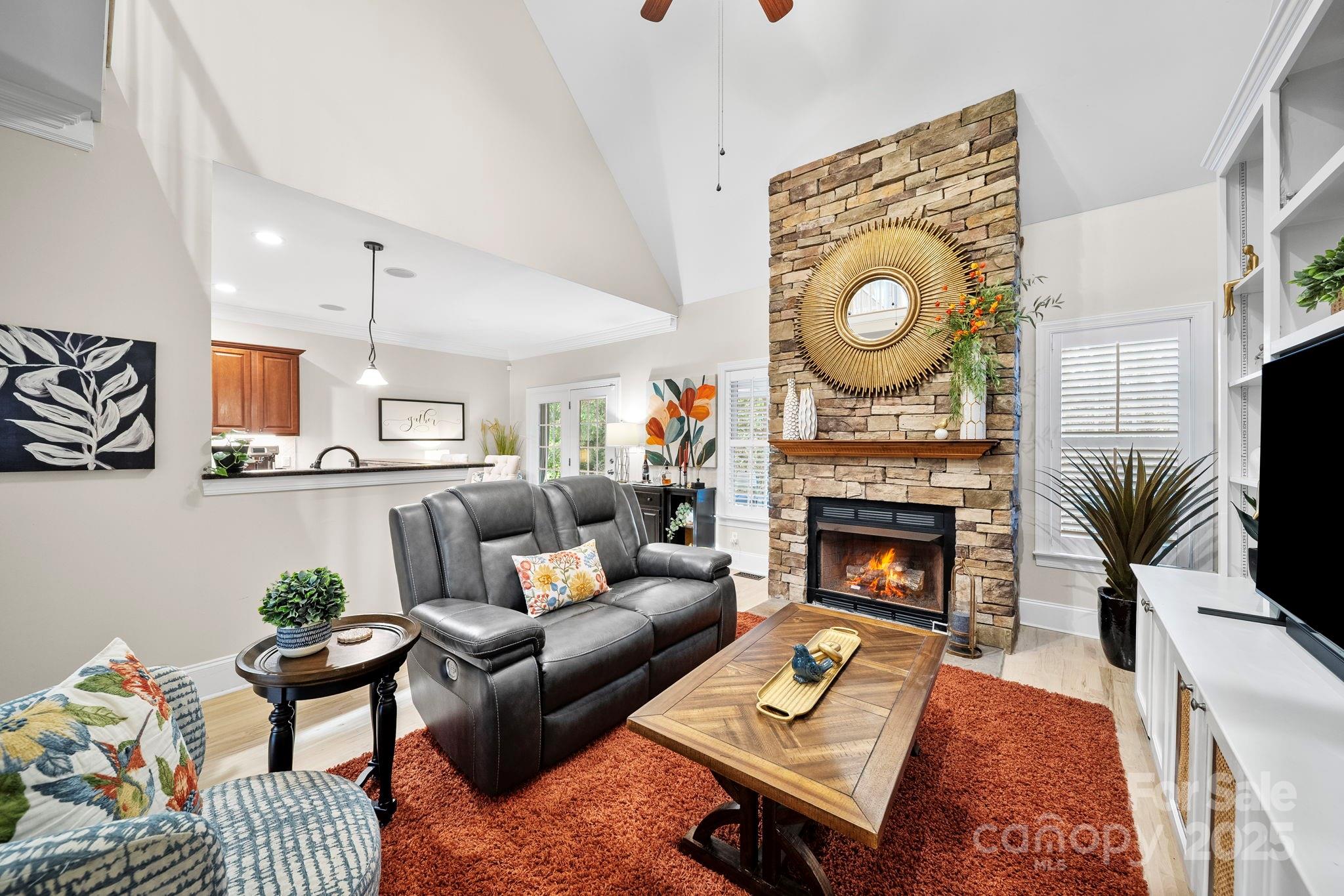 The open-concept design connects the breakfast nook and bar to a soaring two-story living room accented by custom built-ins and a striking stone fireplace.