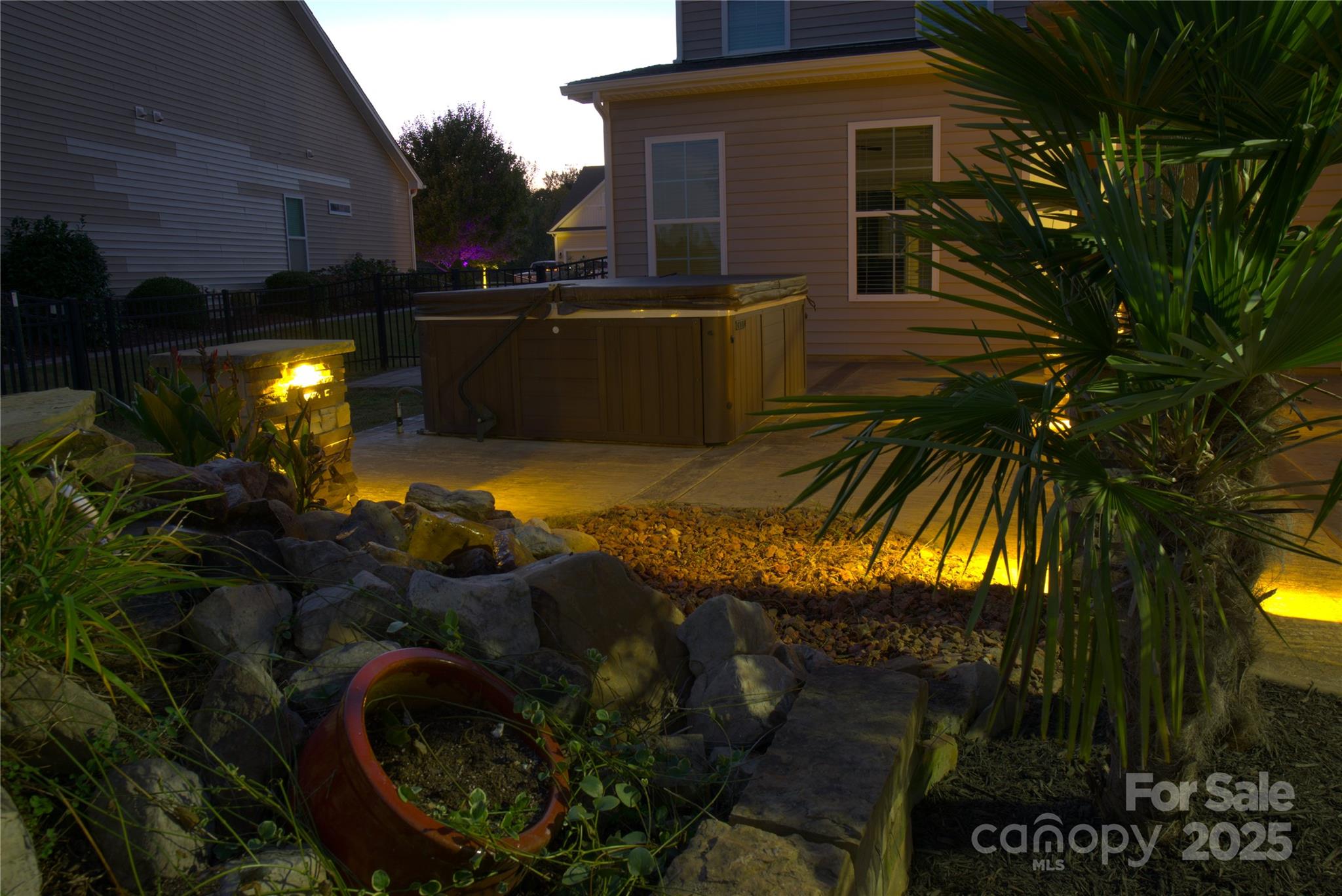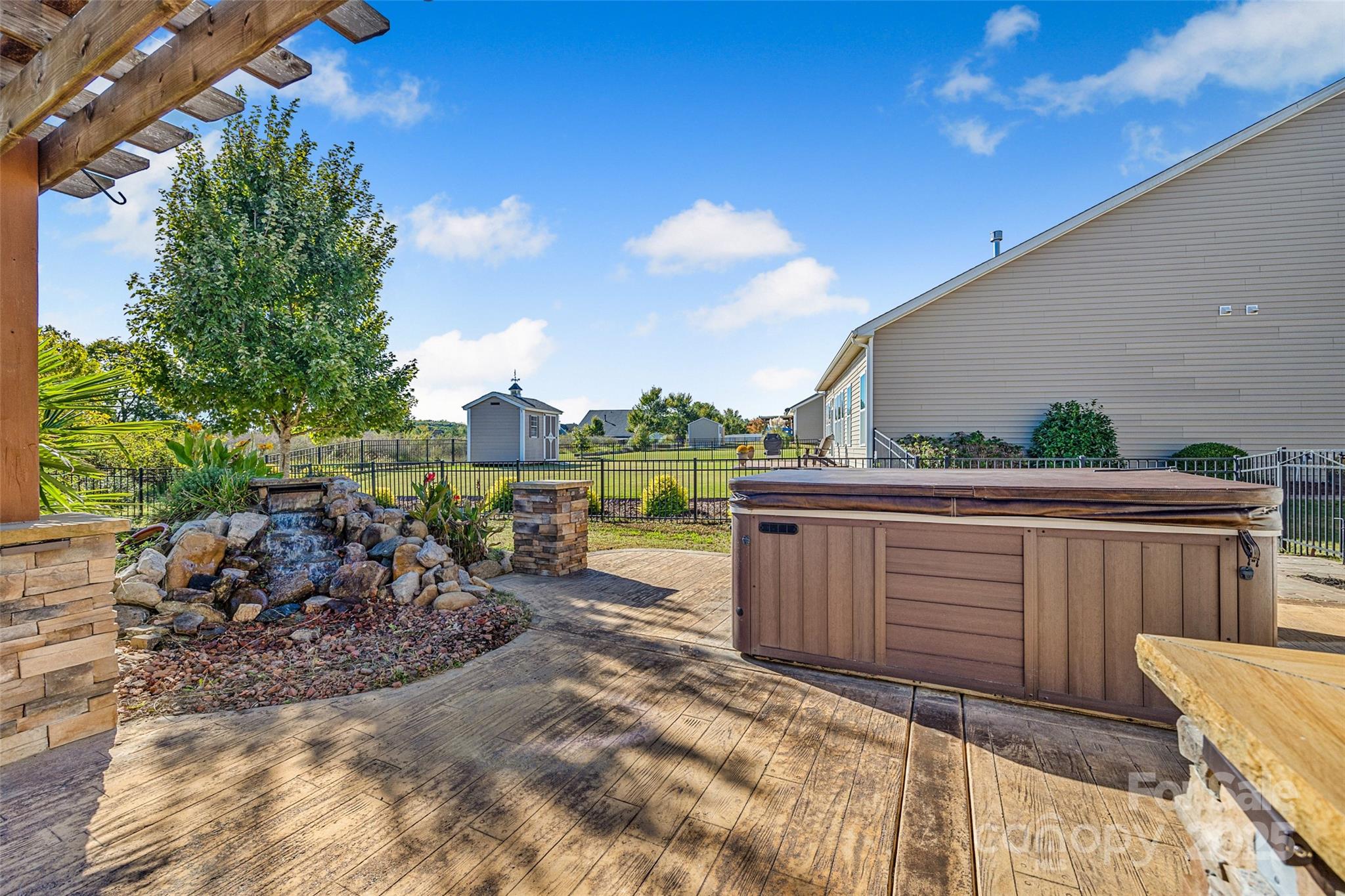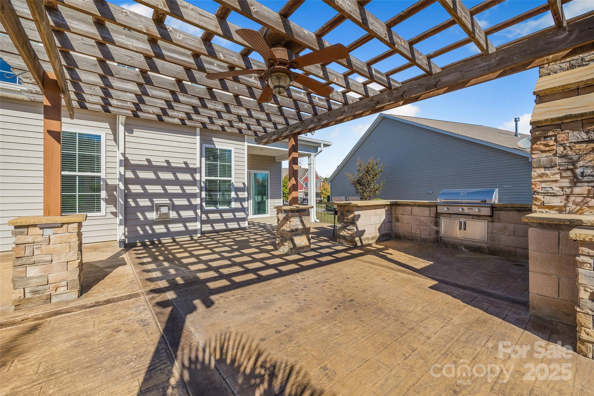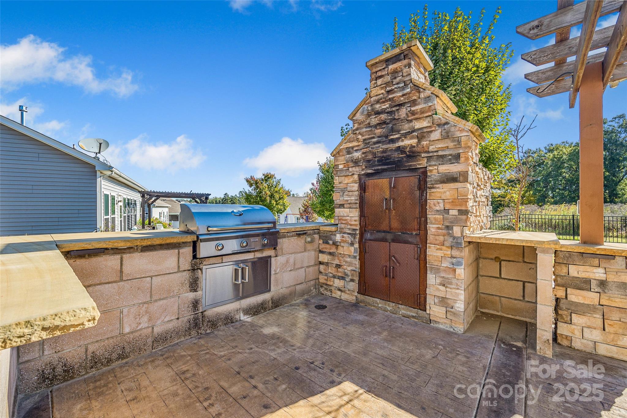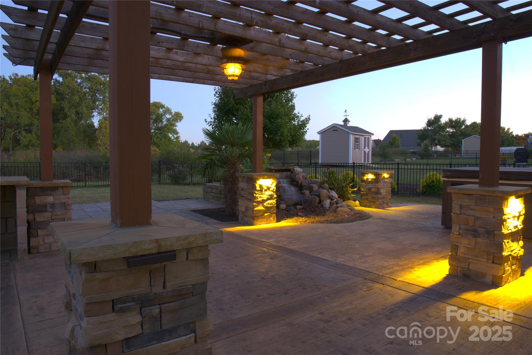 This backyard was made for memories. Fire up the built-in stainless steel grill, slide a pizza into the custom stone oven, and dine under the pergola-covered patio, surrounded by the glow of soft lighting and stone accents. There’s even a paved area perfect for a fire pit, where you can gather with friends and family, share stories, and enjoy the stars. With stamped concrete flooring and a beautifully designed layout, the outdoor space feels like a natural extension of the home — cozy in the winter, vibrant in the summer, and completely unforgettable year-round.