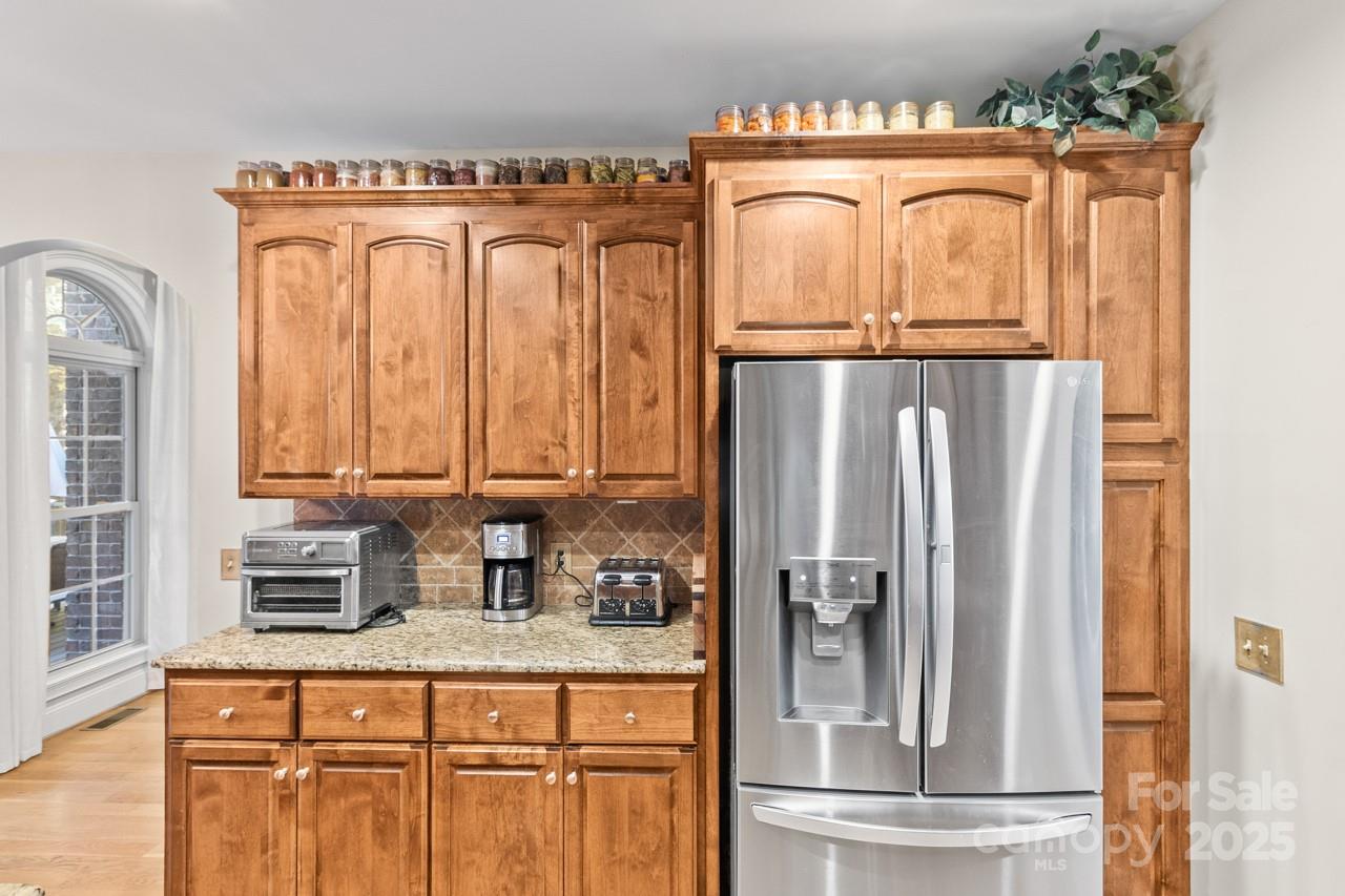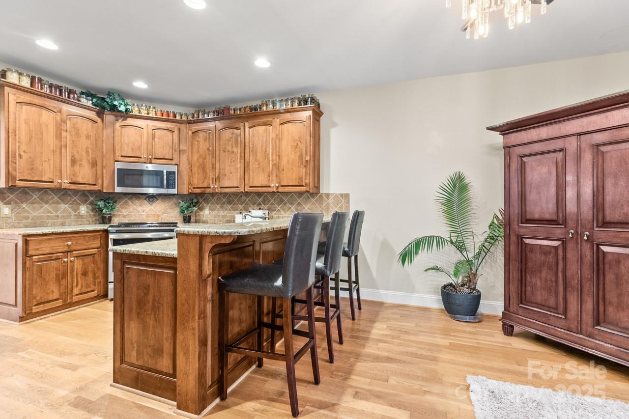 The main level also includes two additional bedrooms that share a full bath, a well-appointed laundry room, pantry, and an open dining area designed for easy entertaining. The gourmet kitchen offers abundant storage, stainless appliances, and beautiful wood cabinetry that anchors the warm, inviting aesthetic of the home.