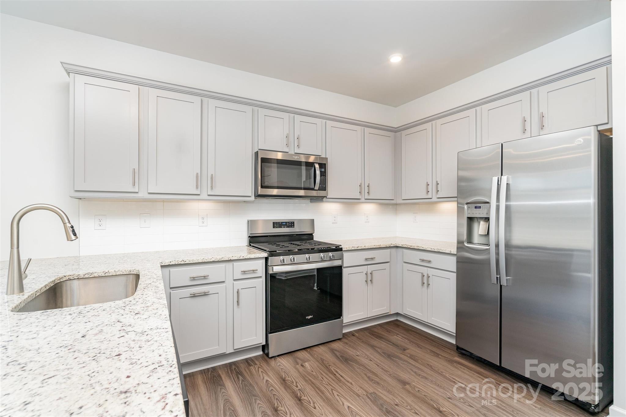 The modern kitchen is a true standout, featuring granite countertops, stainless steel appliances including a 5-burner gas range, under-cabinet lighting, high end soft-close cabinets, a built-in microwave, garbage disposal, and designer-inspired finishes.