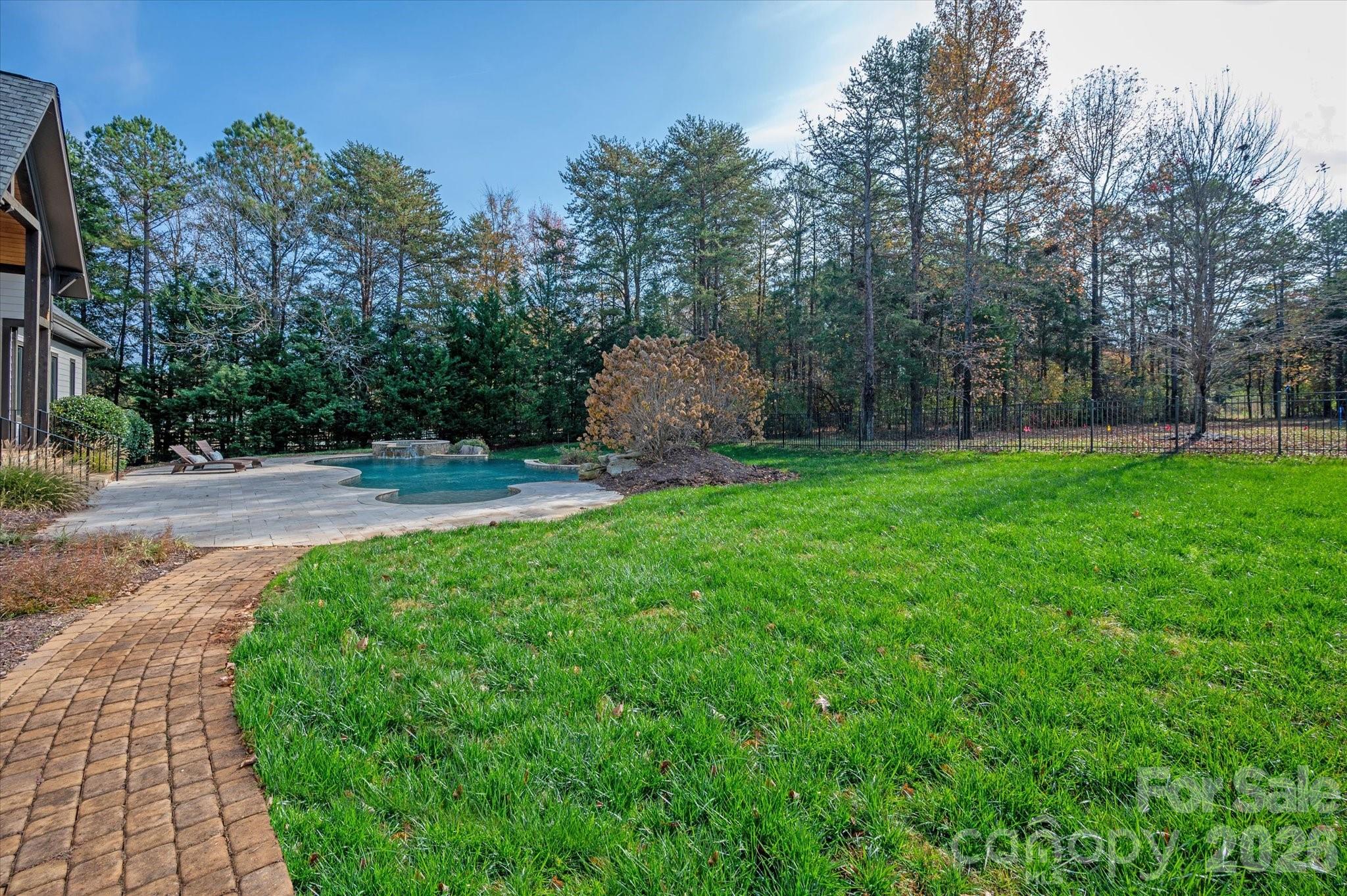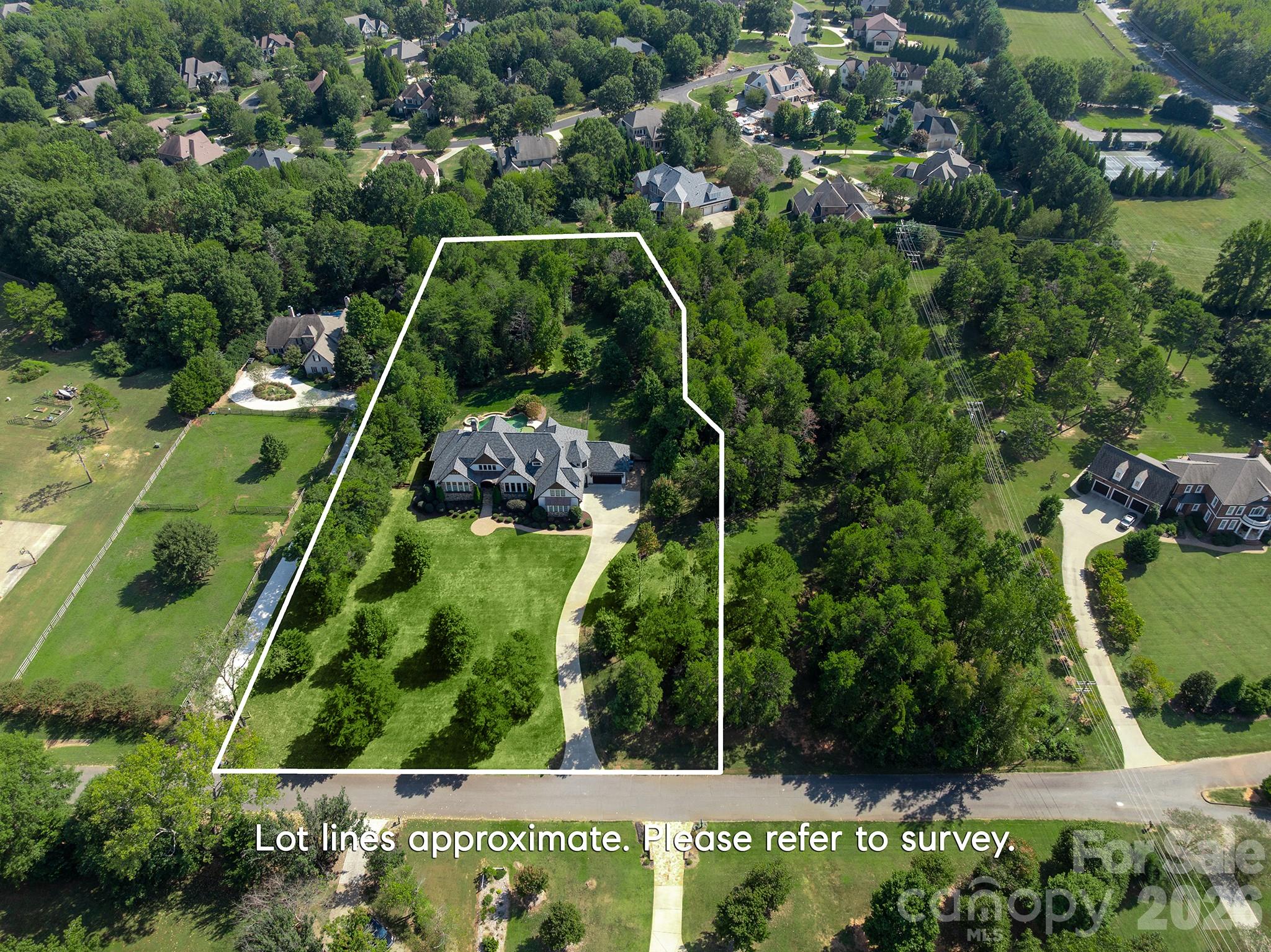 Beautiful luxury ranch home with 4 car garage and salt water pool situated on almost 3 acres in the heart of Marvin. This 2014 build offers a total of 4300sf with over 3500sf of living space on the main floor including a spacious primary suite plus 3 additional ensuite bedrooms. Luxury interior features a gorgeous Great Room with 26 foot vaulted ceiling and cedar beams plus a beautiful 2 story stone fireplace. Light and Bright kitchen features a wall of counter to ceiling height windows and cedar beam ceiling detail. Kitchen has a great appliance package including a 6 burner Viking gas range with double ovens, commercial hood, built in Viking Fridge, pot filler faucet, separate microwave and extra counter beverage fridge. Don't miss the large walk in pantry! Floor plan also features a 770sf second floor with generously sized bonus room + an office and full bath. Don't miss the expansive walk in attic! Home also includes a great drop zone with custom cabinetry, conveniently located cabana bath with direct access to outdoors, plus a dog washing station. Outside, take in the great North Carolina weather on the beautiful screened porch or covered terrace. Resort backyard also features a heated salt water pool with tanning shelf. Along with offering the feeling of privacy, this home is located close to Blakeney Shopping, The Bowl and Waverly shopping. Location also provides easy access to walking trails. BRAND NEW roof with 50 year GAF shingles and all new copper flashing installed in 2025! Great property for privacy or hobby farm! No HOA! Community is animal friendly!