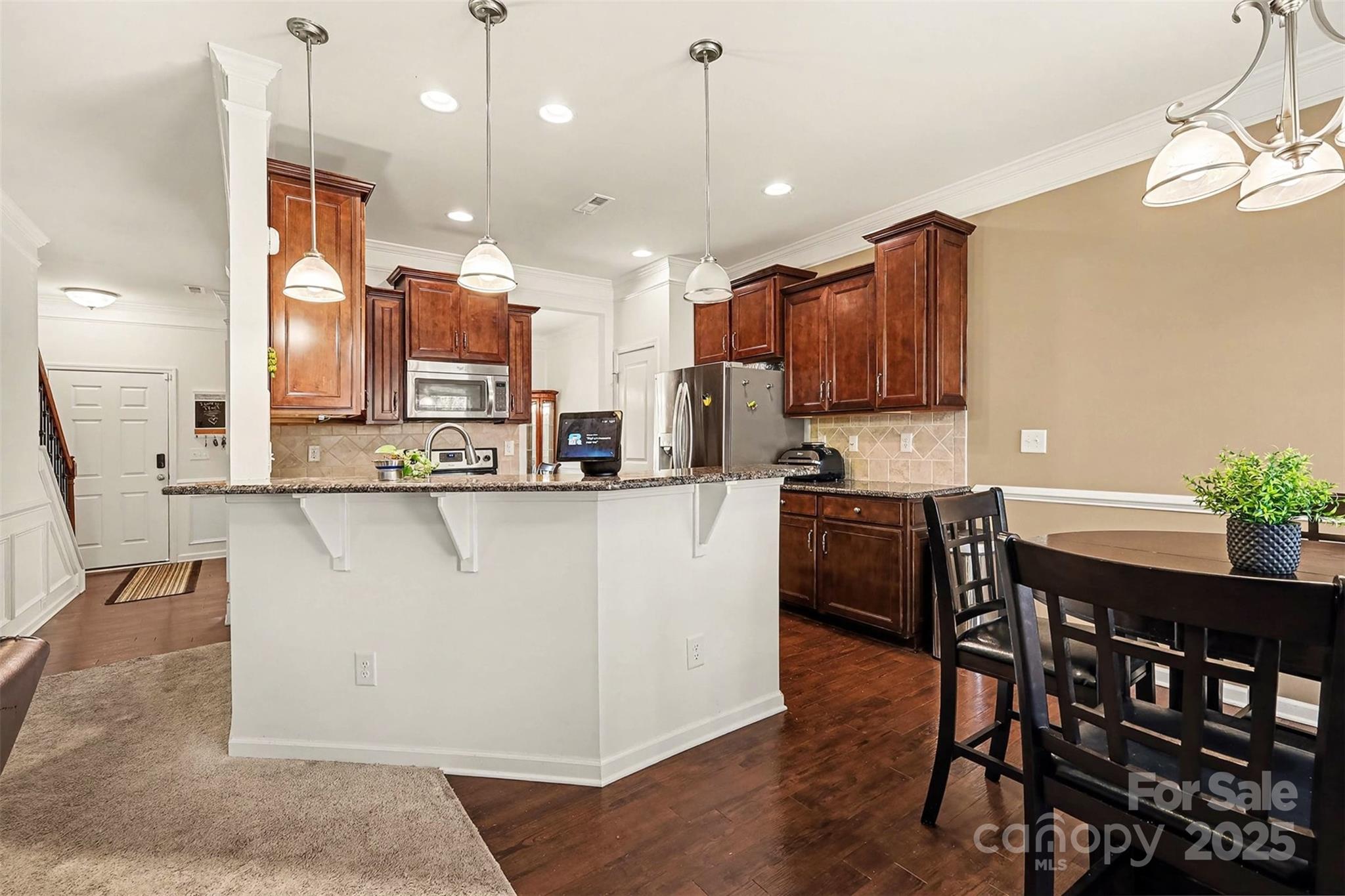 The main floor offers an open living space filled with natural light and anchored by a cozy fireplace—perfect for everyday living or relaxed evenings at home. The kitchen opens to the living and dining areas and features granite countertops, stainless steel appliances, warm wood cabinetry, and a breakfast bar that works well for casual meals or entertaining.