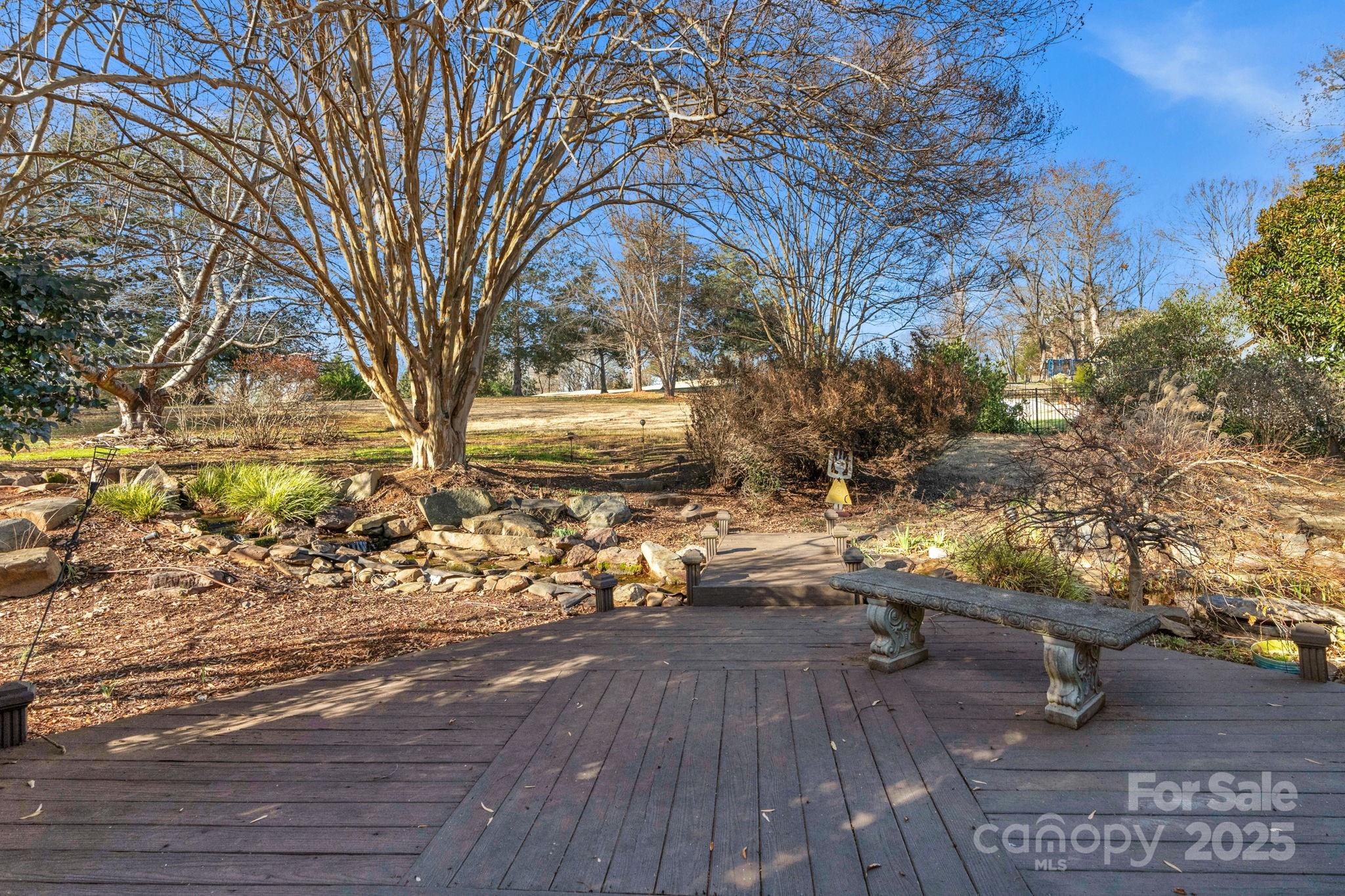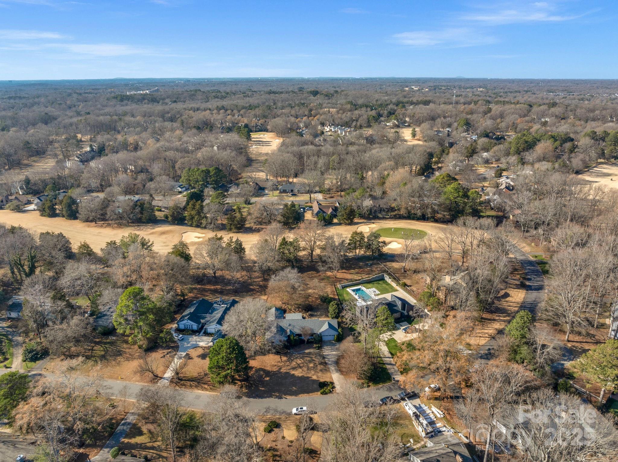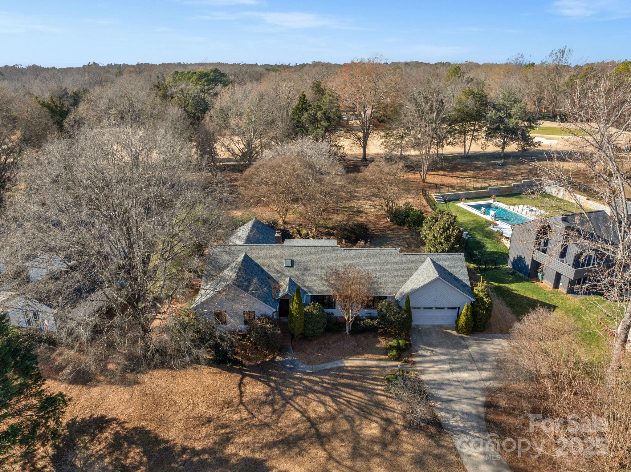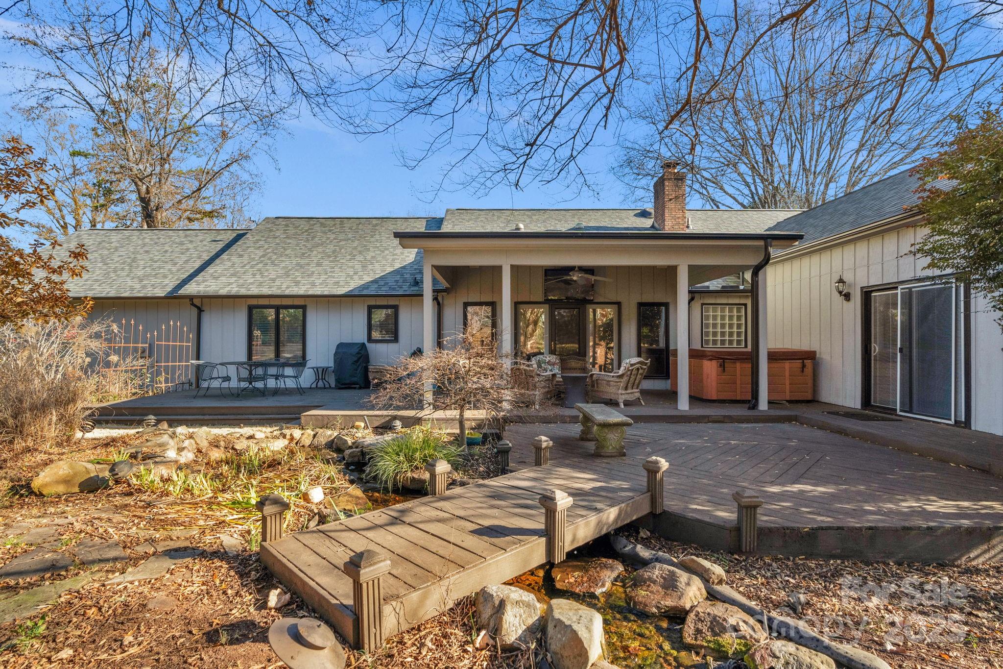 Nestled in the highly sought-after Raintree neighborhood, this exceptional ranch home offers golf course views overlooking Hole #8 of the North Course. Designed for both comfort and style, the home features vaulted ceilings accented with wood beams and a stunning stone gas fireplace that anchors the inviting living space. Entertaining is effortless with a built-in wet bar and a layout that flows seamlessly into the spacious kitchen, complete with a gas cooktop and granite countertops. Step outside to your own private retreat, where a peaceful waterfall feature, hot tub, and covered outdoor area create the perfect setting for relaxing or hosting guests while enjoying golf course views. The spacious primary suite is a true sanctuary, offering generous proportions and a large walk-in closet. With its prime location, timeless architectural details, outdoor living, and resort style community, this Raintree ranch home is a rare opportunity to enjoy golf course living at its finest. This home qualifies for the initiation to be waived at Raintree Country Club (a $30,000 value)—a rare perk per the HOA and Raintree CC. Don’t miss your chance to live in one of Charlotte’s most desirable golf communities! Joining Raintree CC is not mandatory.