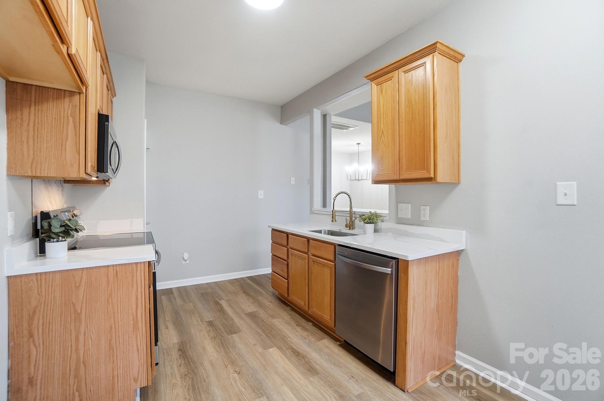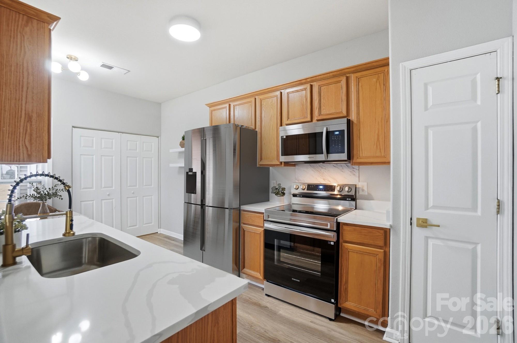 Beautifully updated 3 Bed, 2 FULL Bath END UNIT! 20ft vaulted ceiling in the living room with fireplace, primary bedroom on the main level w/ ensuite bathroom. Long list of updates include new flooring throughout, new quartz countertops, new Samsung stainless steel stove/range, dishwasher & microwave, new light fixtures, door hardware, faucets, and other cosmetics. This is a TURNKEY property, located 3 min. from Rivergate shopping center, 10 min. to Lake Wylie and just ~25 min. from CLT Int'l airport & Uptown. Hot water heater ('23), HVAC (Nov '24). Low HOA of $192 per month covers exterior maintenance, lawn care, Clubhouse & Pool! Property is eligible for a 0% down mortgage PLUS up to 20K in lender credits to cover closing costs. Great opportunity for anyone looking for a low maintenance property close to everything in the Southwest Charlotte!