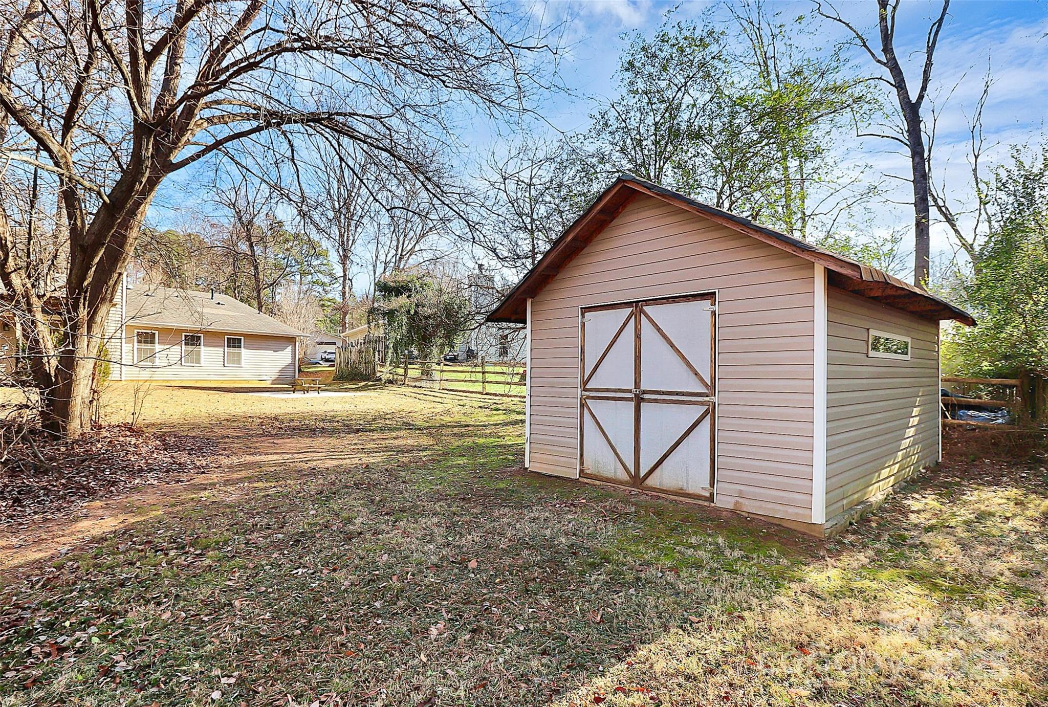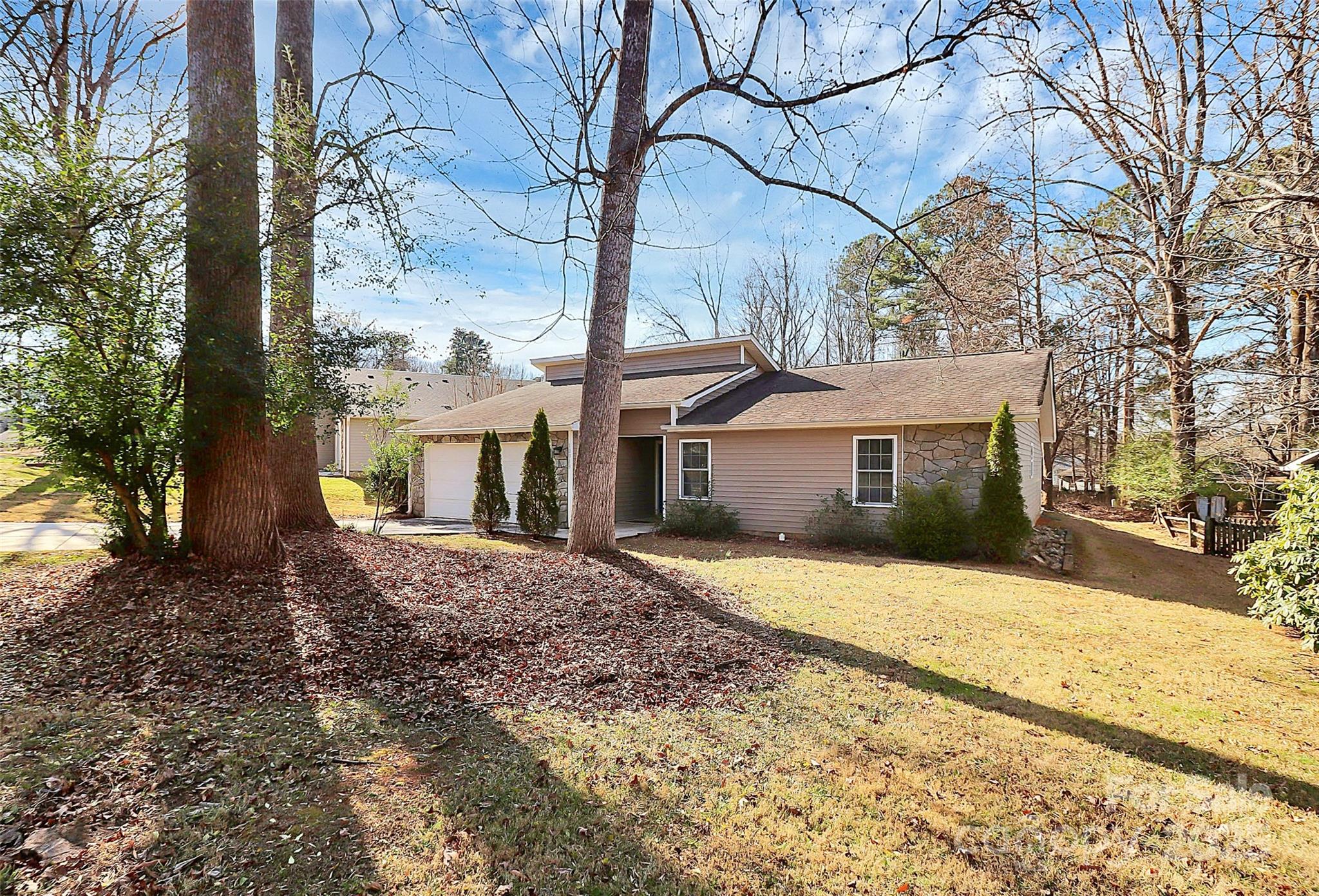 Adorable split-bedroom ranch ideally located in Mint Hill with easy access to I-485 and Uptown Charlotte. A welcoming tiled foyer features a built-in coat rack and a walk-in coat closet, providing excellent storage. Step into the spacious living room showcasing a vaulted ceiling, recessed lighting, and a stunning wood-burning stone fireplace. The living room opens seamlessly to the dining area, which flows outdoors to a large patio with pergola—perfect for entertaining—overlooking a partially fenced backyard. The previous owner updated the kitchen to include new cabinetry, stainless steel Whirlpool appliances (2017 / refrigerator to convey), granite countertops, custom tile flooring, and ample workspace. The spacious primary bedroom includes two walk-in closets, recessed lighting and a private en-suite bath with tile flooring (also updated by previous owner) On the opposite side of the home, two secondary bedrooms share a full bathroom(updated by previous owner ~ matching the kitchen and primary en-suite), creating a functional split-bedroom layout. A centrally located laundry closet adds everyday convenience (washer / dryer to convey). The two-car garage features a large closet currently set up as a workshop with cabinets and counter space. No carpet throughout—all rooms feature tile or vinyl plank flooring. Additional highlights include a 17' x 12' storage shed on a concrete pad for added storage or versatile function. A charming, well-maintained home in a prime location—don’t miss it! SELLER IS OFFERING UP TO $10,000 CREDIT FOR COSMETIC UPDATES WITH ACCEPTABLE OFFER.