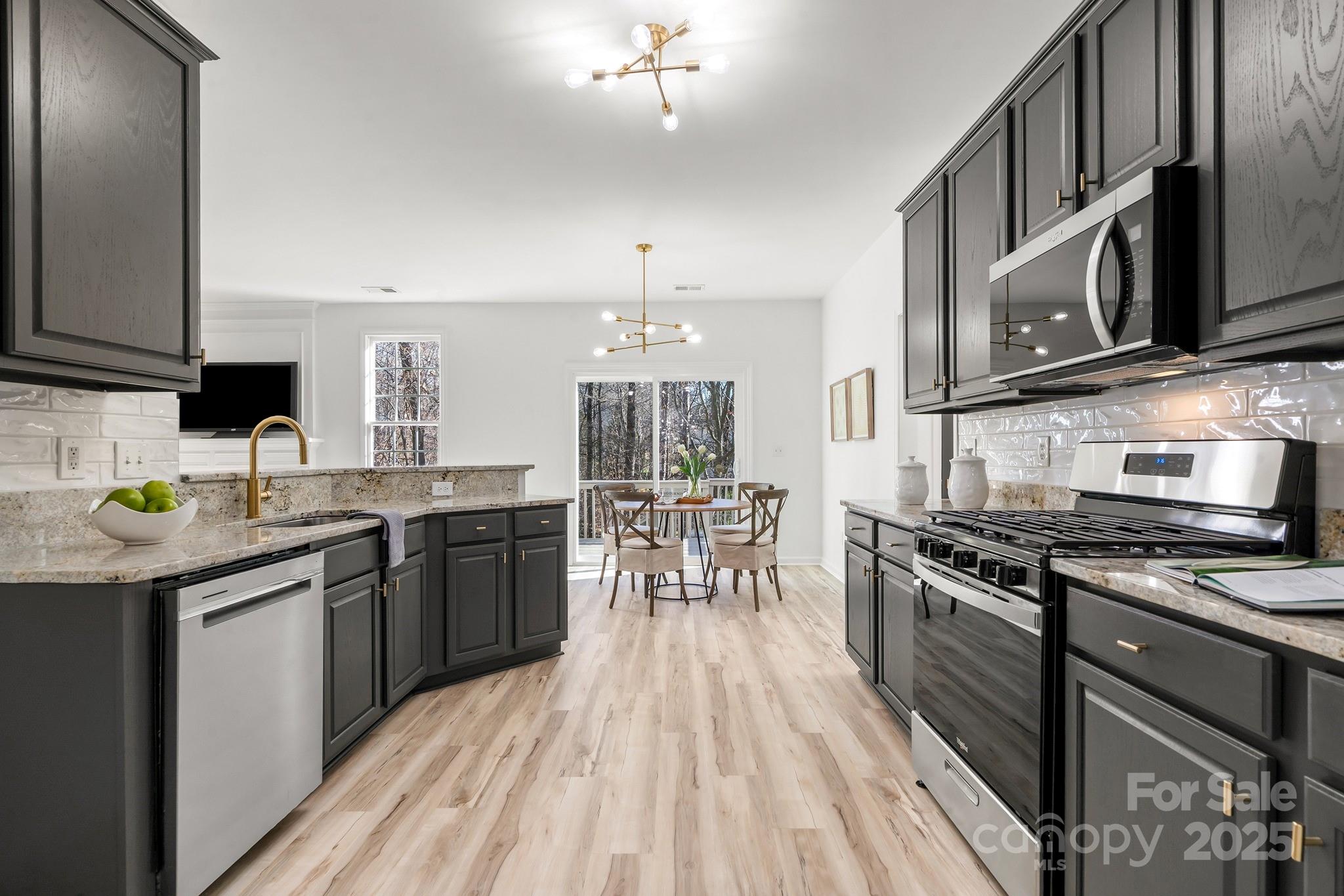 This incredible turnkey property checks all the boxes on your wish list - .54 acre cul-de-sac lot, brick and fiber cement exterior, attached two car garage, open floor plan, full finished walk out basement, over 3700+ SF, private wooded lot, and endless possibilities. Inviting two story foyer entrance leads your eyes in all directions to take in this beautiful and complete interior renovation. You will be greeted with brand new continuous LVP floors throughout the main and upper levels including staircase, fresh interior paint throughout, intricate double stacked crown molding, elegant picture molding accents, all new light fixtures, and sleek six panel Urban Bronze doors with new brushed gold hardware and hinges. Professionally staged to ensure a wonderful showing experience. The main level features a perfect combination of traditional formal rooms combined with a large open living room, kitchen, and breakfast nook area that is perfect for entertaining. Abundant natural light throughout with insulated windows, storm door, bay window, and brand new sliding glass door leading to relaxing raised deck. The transformed kitchen boasts granite countertops, refreshed cabinetry, new brushed gold hardware, new custom tile backsplash, new brushed gold faucet, stainless steel appliances with desirable gas range for cooking, breakfast bar for additional seating, and convenient pantry. The living room shines with a gas log fireplace as the focal point, wall of windows with private tree-lined view, and a rear hidden staircase leading to second floor. The oversized primary bedroom retreat is the "WOW" factor for the property - double door entry, perfect condition with separate sitting room, tray ceilings, brand new ceiling fans, and great natural light. The ensuite primary bathroom flaunts vaulted ceilings, brand new double vanity with LED lighted mirror, new chandelier, garden tub, shower stall, private doored water closet with dual flush commode, spacious walk-in closet, and walk in attic access. Three generously sized auxiliary bedrooms and updated second full bathroom complete the second story. Highly sought after full finished basement provides flexible space to meet your personal needs - second home office, bonus room, craft room, exercise room, guest area, endless possibilities. Brand new carpet, fresh interior paint, new light fixtures, new ceiling fans, and renovated half bathroom create a renovated blank slate in the basement for your imagination. The basement offers both interior access off the foyer and separate exterior access via walkway from driveway. Prime .54 acre cul-de-sac lot with private wooded views and easy to maintain yard. Ornate gate in backyard has stairs leading to lower tier of property and serene babbling creek for relaxing setting and wildlife/nature lovers. Great storage throughout home and basement. Finished attached two car garage with custom overhead storage racks, fresh paint, sealed/painted garage floor, and garage openers. Runners, walkers, cyclist, and outdoor enthusiast will appreciate the convenient neighborhood access to the Mallard Creek Greenway linking to miles of trails just footsteps away from home. AGENTS ARE OWNERS.