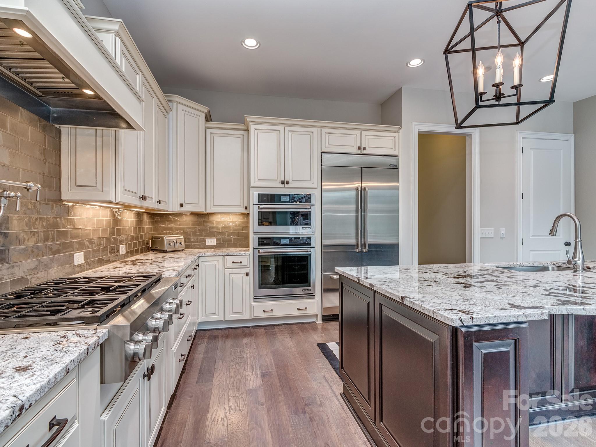 The primary suite on the main level offers a private retreat, with a recently renovated primary bathroom featuring upscale finishes and a serene atmosphere. The heart of the home is the stunning chef’s kitchen, showcasing top-of-the-line JennAir appliances and generous space for both everyday living and entertaining.