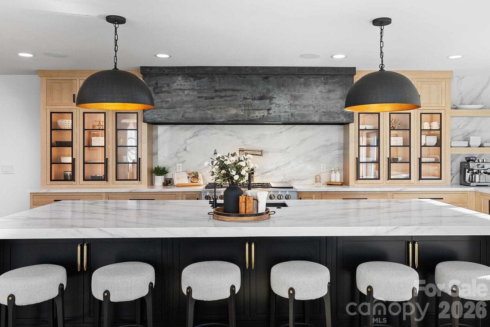 Set in South Charlotte’s Montibello neighborhood & convenient to prestigious schools in South Park & South Charlotte, along with Carmel Country Club & Quail Hollow Club, this 6BR/6.5BA home is intentionally designed w/ a focus on craftsmanship, flow, & livability—every detail thoughtfully laid out & intentionally designed. From the entry, custom modern molding, architectural millwork, decorative wood paneling, & wood-accented ceiling details establish a refined tone. 7.5” engineered white oak floors run throughout, paired w/ tile selections sourced exclusively from Queen City Stone & Tile & lighting curated by Lumi Lighting & Home Design. The kitchen anchors the home w/ custom rift-sawn white oak cabinetry, a 12’ black island, Calacatta Castana quartz 2.5” mitered waterfall countertops, pot filler, prep sink w/ reverse osmosis filtration faucet, & a concealed scullery w/ freezer & refrigerator drawers plus extensive pantry storage. A full suite of GE Monogram custom panel appliances is anchored by a 48” dual-fuel range w/ six burners & built-in griddle, accented by a Black Venetian plaster custom range hood. Built-in refrigerator/freezer & two fully integrated dishwashers blend seamlessly into the cabinetry, while a microwave drawer & 36” Kohler Whitehaven farmhouse sink complete the workspace. The kitchen transitions seamlessly into the great room w/ 24’ ceilings, anchored by a floor-to-ceiling Black Venetian plaster fireplace custom-crafted by a local artisan & framed by architectural beams. The dining room features custom millwork & is finished in SW Tricorn Black for a dramatic yet sophisticated setting. A wet bar/wine wall connecting the kitchen & dining room includes a Wine Sommelier refrigerator, Blanco Diamond SILGRANIT prep sink, & custom rift-sawn white oak cabinetry. The home features front & back staircases. Living spaces include a main-level primary suite & a secondary primary upstairs, offering flexibility for multi-generational living or guest retreat. The main-level primary features vaulted ceilings w/ architectural beams, a matchbook porcelain slab gas fireplace, soundproofing for privacy, & a spa-caliber bath w/ freestanding soaking tub, oversized shower w/ rain head + 2 additional heads, a two-person Sunlighten Signature infrared sauna w/ interior lighting & integrated speakers, & a fully customized closet w/ center island, 17 drawers, & laundry pullouts. The main-level office offers floor-to-ceiling built-ins, shiplap accent wall, integrated desk, & modern trim detailing. The pool house kitchen features Cristallo quartzite countertops w/ undercounter LED lighting, dishwasher, beverage fridge, & hydraulic bar window opening to the pool deck, along w/ indoor lounging space & full bath. Outdoor living includes a heated gunite saltwater pool w/ integrated spa, tanning ledges, water features, & custom leathered marble hardscaping, supported by landscape irrigation & outdoor audio speakers. A covered back porch adds a second gas fireplace & access to the main-level primary. Additional highlights include wiring in place for future porch heaters front & back, plus hot & cold exterior spigots for a future outdoor shower. Upstairs, white oak flooring continues, along w/ a built-in homework center w/ integrated desk, shelving, & storage. In addition to the secondary primary, there are four additional bedrooms, all w/ walk-in closets. Bedroom layout includes four ensuite baths, one direct-access bath, & one shared hall bath. Two upstairs bedrooms are soundproofed. Delta & Brizo fixtures throughout. Integrated surround sound throughout the main level & bonus room, w/ invisible architectural speakers in the kitchen, plus surround sound on both covered porches & a dedicated outdoor audio system serving the pool area.