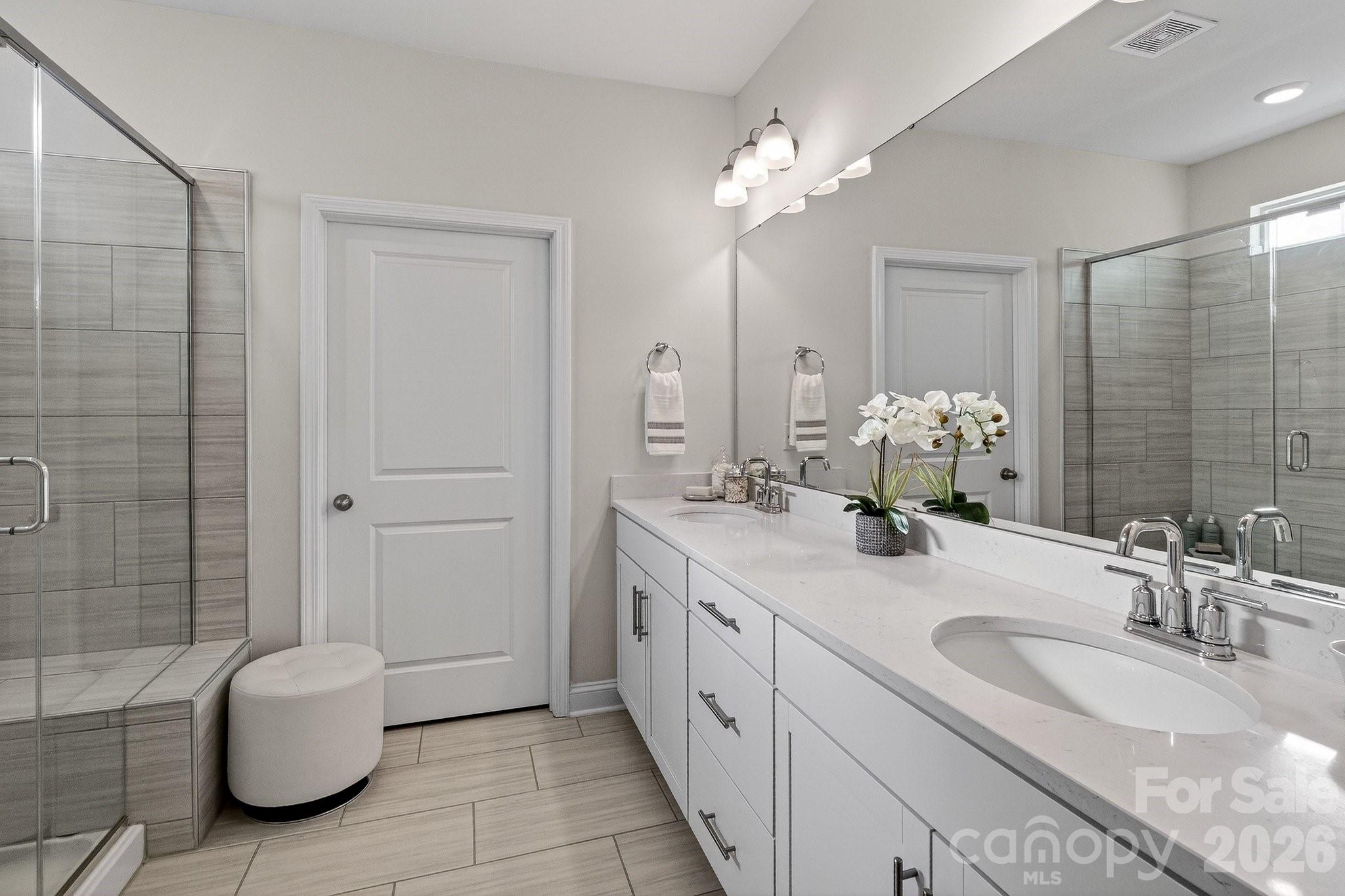 Quartz countertops, a generous island, and a gas range make the kitchen both practical and stylish, while RevWood flooring carries warmth and durability throughout the entire home. The primary suite is paired with a well-appointed bath featuring dual raised vanities, quartz surfaces, and a tiled walk-in shower with a built-in bench, plus an expansive closet to match!