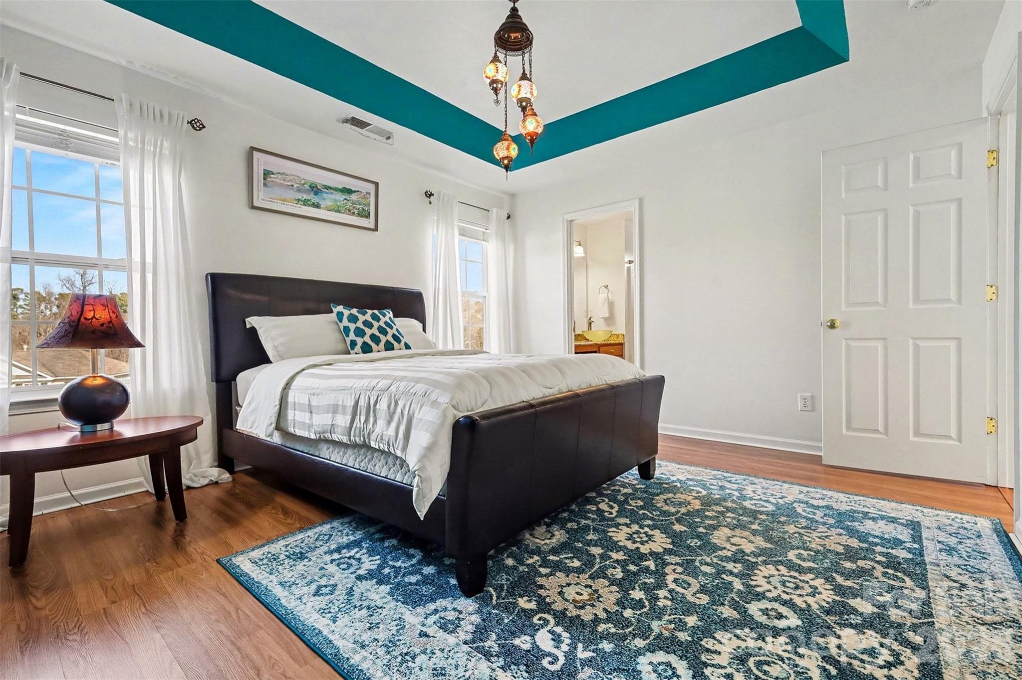 Upstairs, the primary bedroom offers a comfortable retreat with a private en-suite bath featuring a dual vanity and tub/shower combination. Two additional bedrooms provide flexibility for guests, office space, or additional living needs and share a full hall bath.