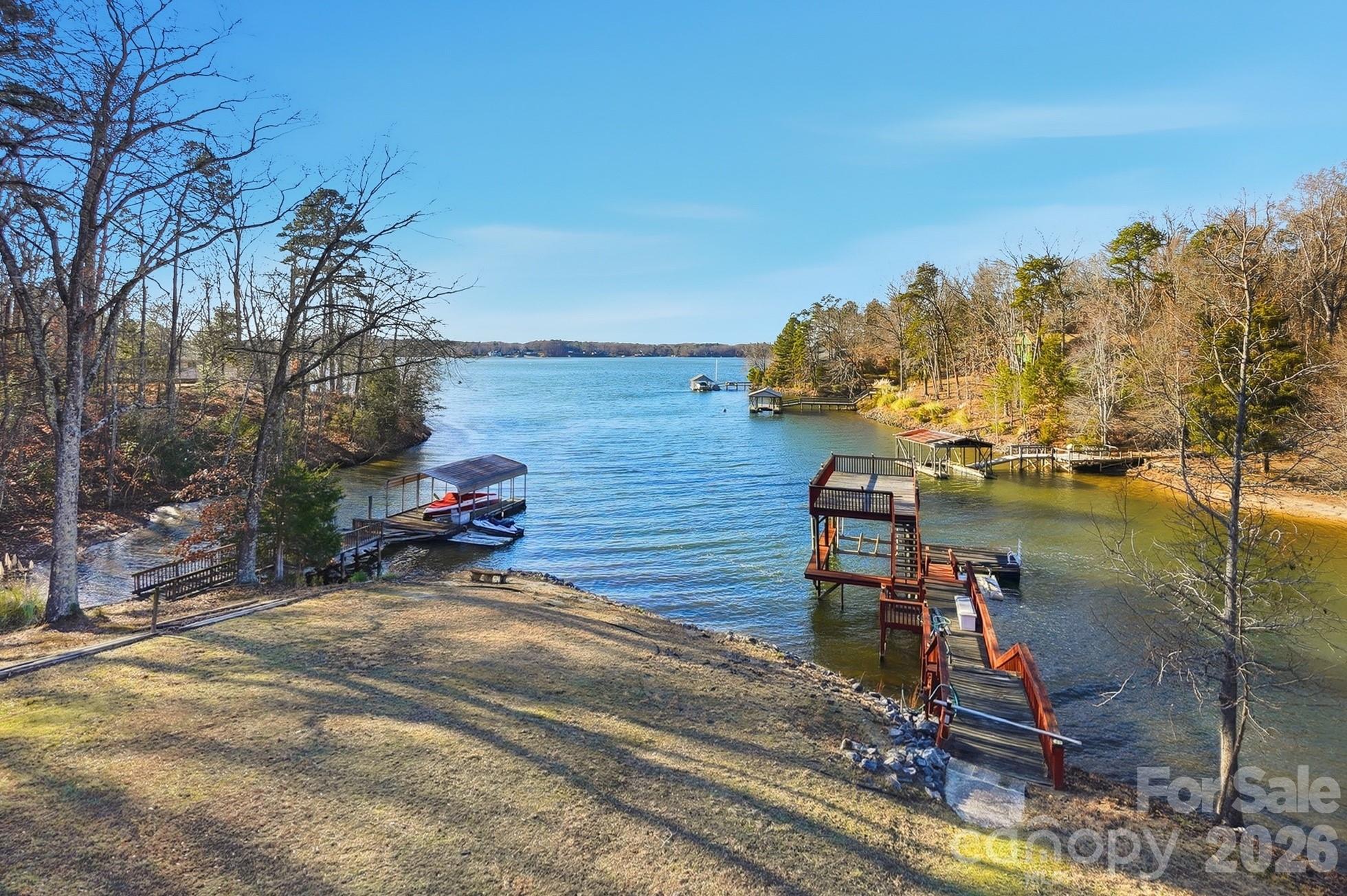 Discover the perfect blend of peace and play at this charming Lake Wylie retreat. Featuring a gently sloping lot in a quiet, protected cove with long range main channel views. Surrounded by mature hardwoods, the property offers privacy, natural beauty, and tons of space for outdoor enjoyment. Spend your days boating, fishing, or swimming from your covered dock with lift, then unwind on the sundeck while taking in tranquil lake views. Whether you’re seeking a serene weekend getaway or comfortable full-time living, this waterfront home delivers the best of lakeside living and is ready for your personal touches. Inside the home discover a spacious eat-in kitchen with stainless steel appliances, center island, pantry, and wet bar. A flex room(perfect for a home office), 2 bedrooms, 2 baths, dining room, and amazing 2 story great room with stunning lake vistas complete the main floor. The upper-level primary suite offers breathtaking lake views, dual vanities, a walk-in shower, jetted tub, and generous storage. The lower level provides a large recreation room, perfect for entertaining family and friends. Multiple decks create ideal spaces for grilling, hosting, or simply relaxing and enjoying the scenery. With its unbeatable value, versatile living spaces, and exceptional waterfront setting, this Lake Wylie gem offers endless potential. Great location- Palisades Country club nearby with golf, social, pool, and tennis memberships available.
