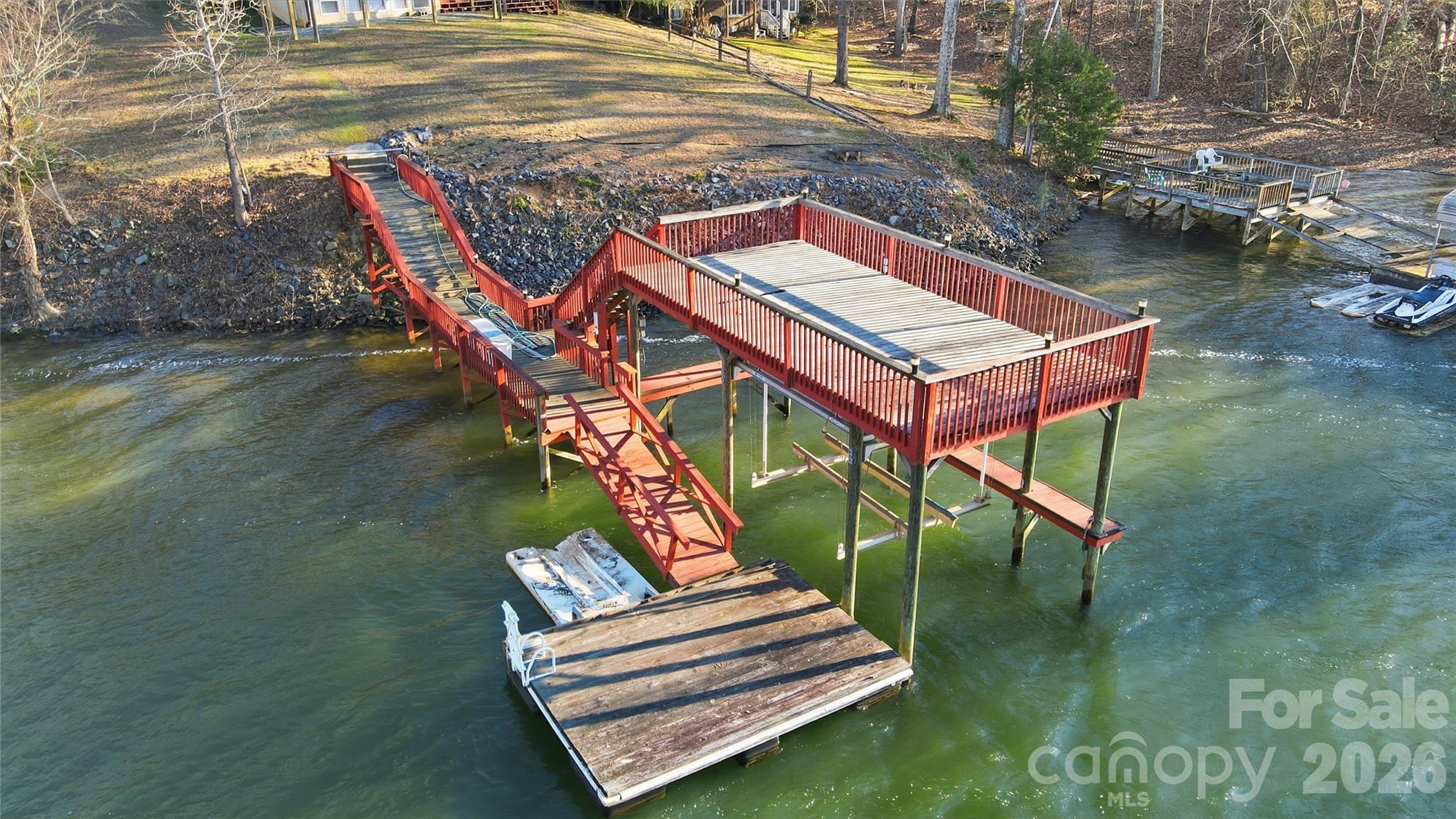 - Covered dock with lift, sundeck, floating dock, and jet ski ports