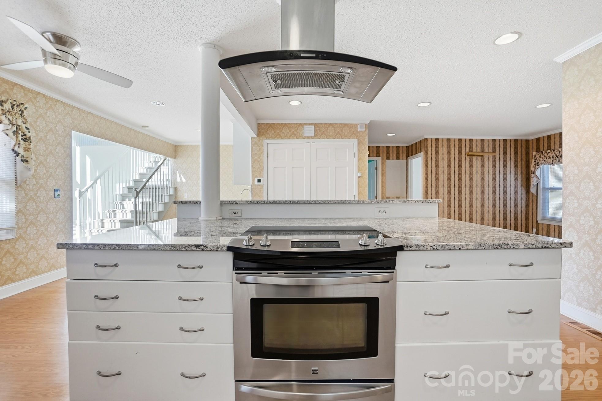 - Spacious eat in kitchen with ss appliances, granite counters, center island with ample seating space, pantry, and wet bar with built-in cabinetry