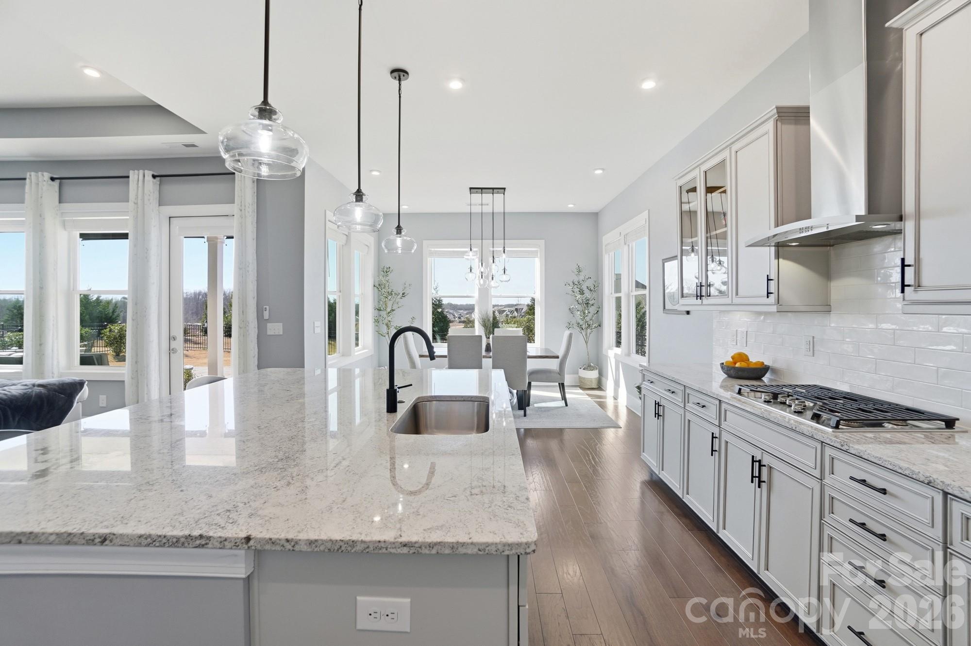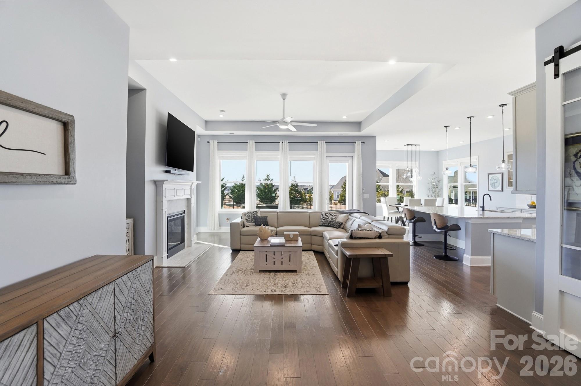 The bright, open floor plan is filled with abundant natural light, enhanced by 10-foot ceilings and 8-foot doors, creating an impressive sense of space and openness. Wood flooring flows throughout the main living areas, while a gas fireplace adds warmth and charm to the great room.
