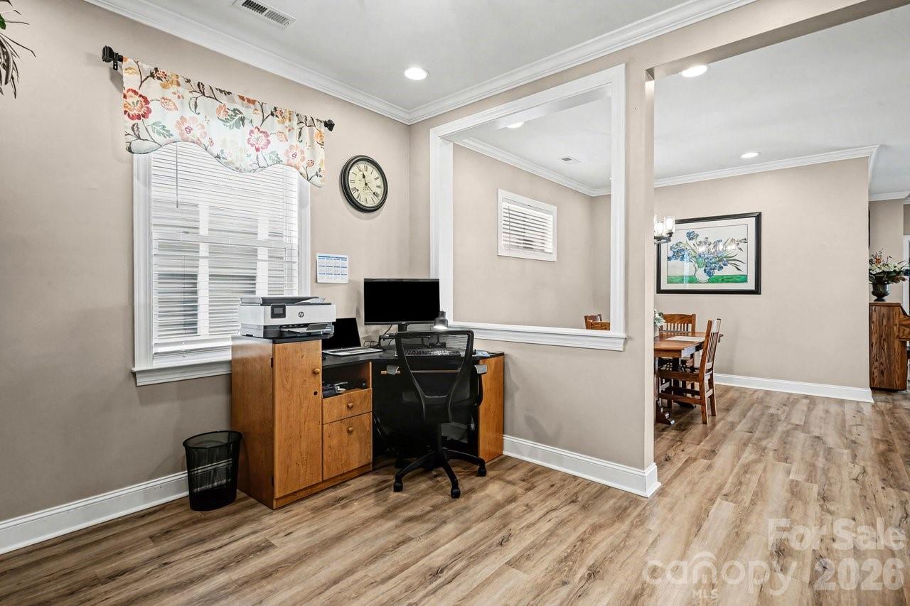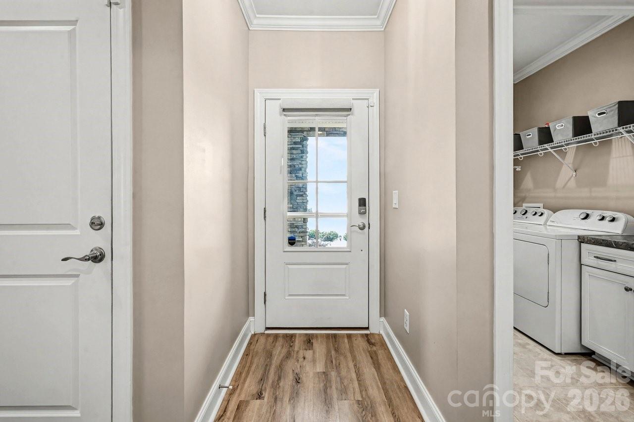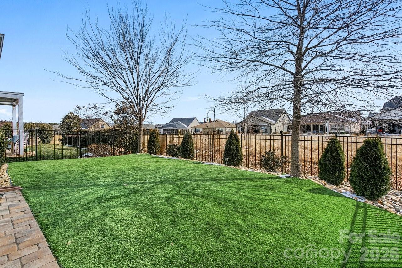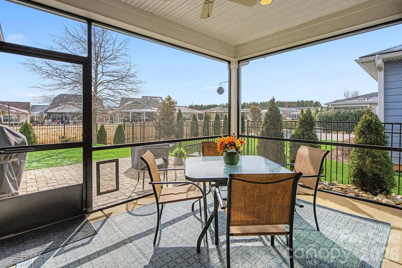 Watch the sun rise from this premium unobstructed common area view lot. Make yourself comfortable and enjoy the open concept Glory floorplan that has an amazing use of function and space. A well-appointed kitchen anchors the main living area and includes stainless steel gas appliances, granite countertops, tile backsplash, white cabinets, designer lighting and a large seating island. The adjacent great room is highlighted with a gas log fireplace flanked by custom cabinetry and wall of glass featuring electric shades, that flow on to the screened porch and patio extending in and outdoor entertaining areas. The rear fenced yard has a park-like setting, shade trees and synthetic turf for easy maintenance. Multiuse flex space adds versatility and the split bedroom plan offers privacy for guests. A serene master suite completes this home with dual sink vanity, tile floor in the bath with a generous walk-in custom closet and tiled shower. Low maintenance LVP and tile floors throughout the home. Trilogy Membership includes Freedom Boat Club on Lake Norman plus award winning amenities.