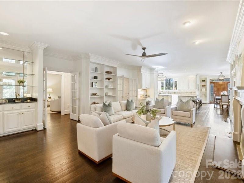 This beautifully built classic home welcomes you with an open foyer and a graceful, recessed staircase. The living room features a fireplace and sits opposite the formal dining room, creating an ideal layout for entertaining. A spacious kitchen with a breakfast bar opens to the family room, complete with a second fireplace. The primary suite is conveniently located on the main level and includes a well-appointed bath. A second staircase leads to a generous bonus room. Upstairs, you’ll find three secondary bedrooms and two full baths. Enjoy outdoor living in the beautiful backyard featuring a privacy wall and large patio. The wide side yard is also well suited for soccer play or croquet. Ideally located just minutes from the amenities of Phillips Place and SouthPark.