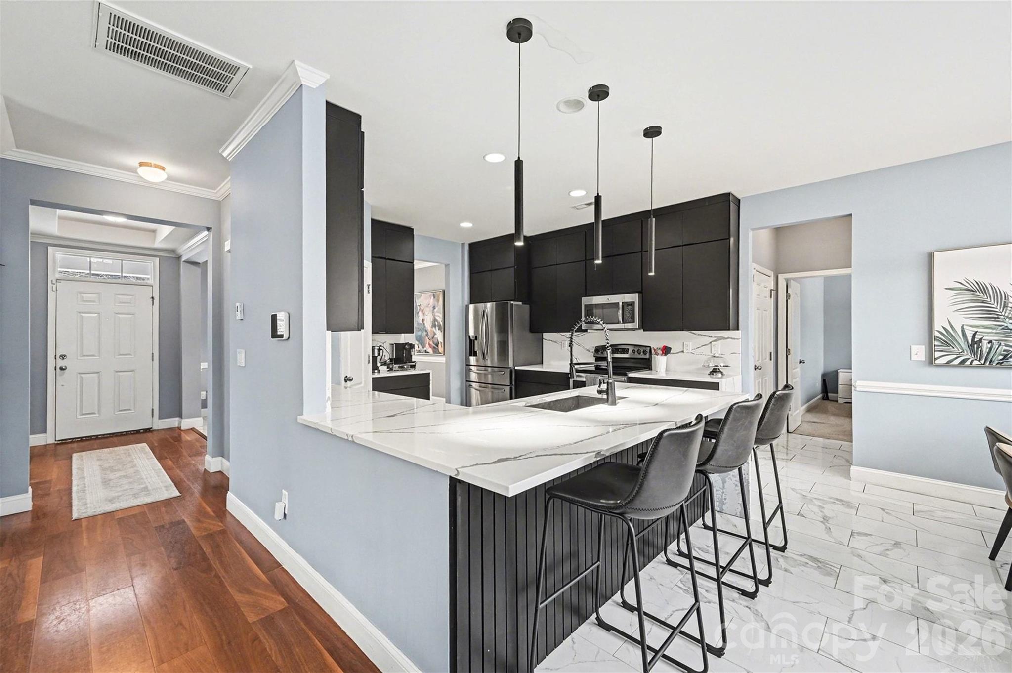 The heart of the home is a chef’s dream, showcasing meticulous custom work including sleek, dark cabinetry that perfectly complements the high-end quartz countertops. These stunning surfaces provide a sophisticated, seamless look as they transition directly into a matching quartz backsplash. The open floorplan flows effortlessly into the living areas, which are grounded by beautiful prefinished wood flooring and bathed in natural light.