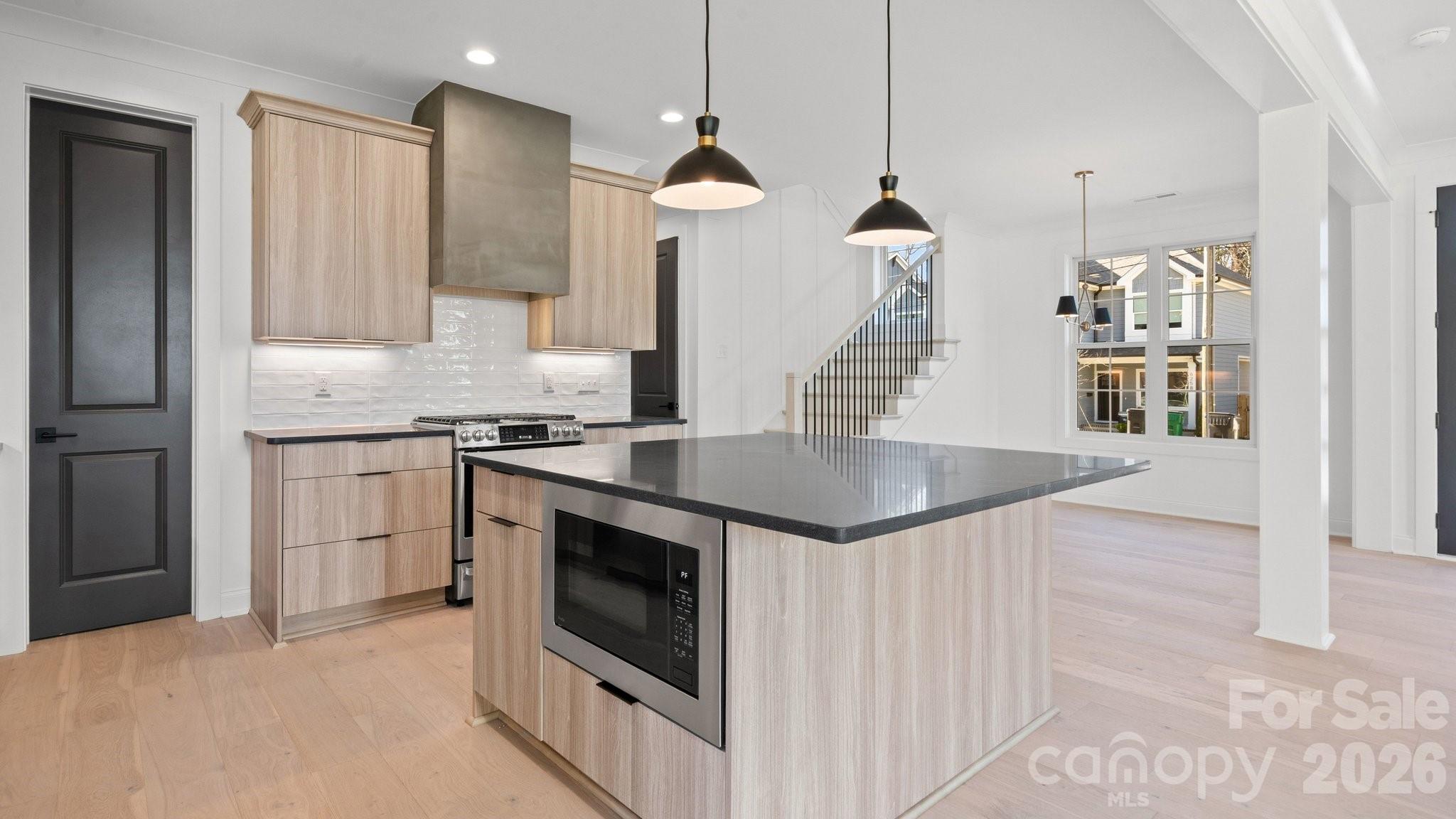 Beautifully crafted home with custom finishes throughout! Open-concept living area with engineered hardwood floors and gas fireplace. Kitchen features quartz countertops, gas range, Delta fixtures, and modern design. Upstairs loft offers flexible living space. Spacious primary suite with tile shower and Bluetooth speaker in bath. Gas furnace, electric water heater, and fenced backyard. No HOA and renter friendly. Minutes to Camp North End, Uptown, and NC Music Factory. Welcome Home!!