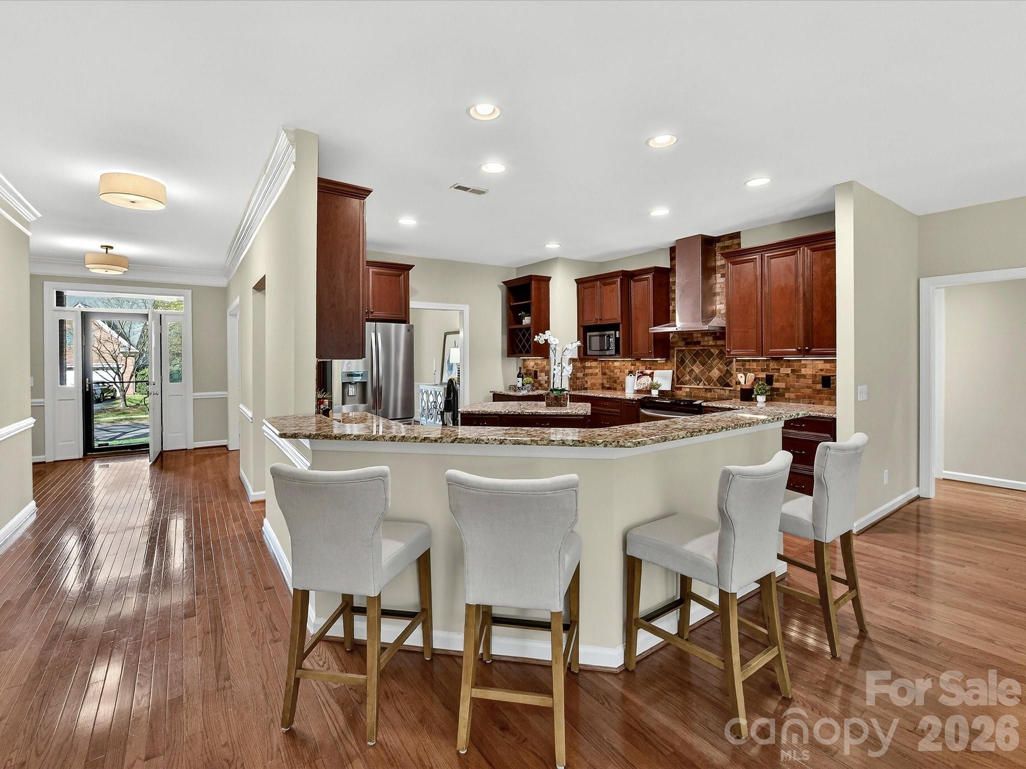 Warm hardwood floors welcome you at the entry, leading to a spacious home office and a bright dining room, both featuring beautiful hardwood inlay details. The dining room is further enhanced by a charming bay window that fills the space with natural light. The open kitchen features rich wood cabinetry, abundant storage, a center island, and a breakfast bar with seating for four or more—perfect for everyday living and entertaining.