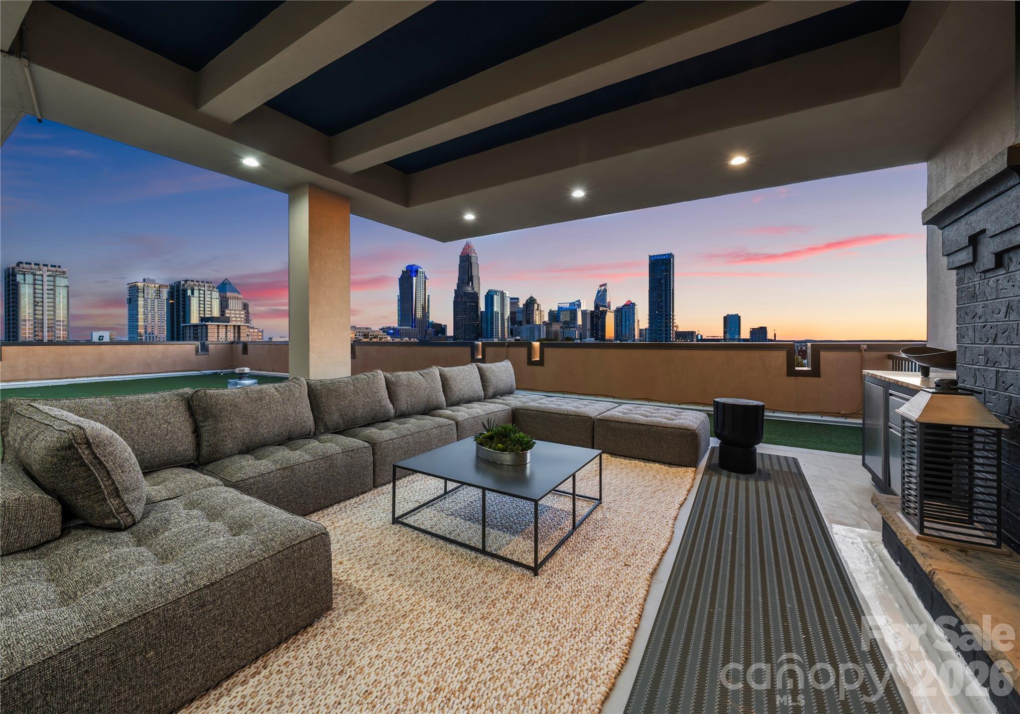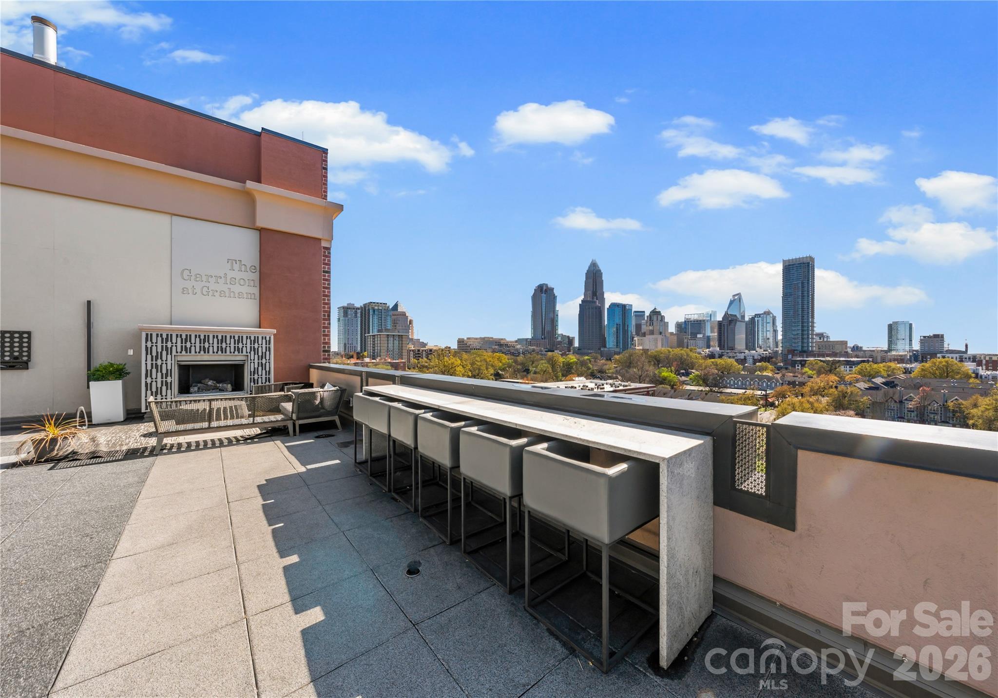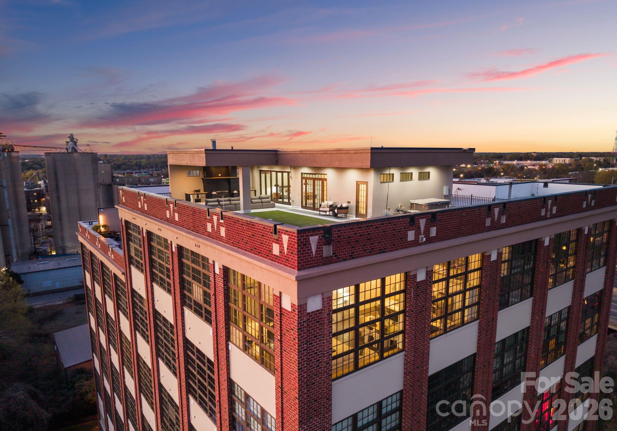 Welcome to The Penthouse at The Garrison at Graham—one of Uptown Charlotte’s most distinctive and architecturally striking residences. Occupying the prime top-floor corner of the building, this remarkable three-story penthouse spans approximately 2,750 square feet of sophisticated loft-style living and is framed by two dramatic walls of 12-foot floor-to-ceiling windows that flood the home with natural light while showcasing breathtaking panoramic views of the Uptown Charlotte skyline. With the touch of a button, motorized shades reveal sweeping city vistas that transform throughout the day—from morning light pouring into the living spaces to dramatic sunset and twilight skyline views. The main living level offers a truly impressive sense of scale with soaring two-story ceilings, expansive window walls, and rich wood flooring that flow throughout the open-concept living and dining areas. A gas fireplace anchors the living space, creating warmth and ambiance while maintaining a sleek modern aesthetic. The layout is thoughtfully designed for both everyday living and elevated entertaining. The chef’s kitchen serves as the heart of the home and features a massive center island with granite countertops, stainless steel appliances including gas range, oven, microwave, beverage refrigerator, dishwasher, and exhaust hood, along with abundant cabinetry and prep space ideal for hosting gatherings. The open floor plan seamlessly connects the kitchen to the living and dining areas, allowing guests to gather comfortably while enjoying the skyline views beyond the windows. The second level features two spacious guest suites or flexible office spaces, each with its own full en-suite bathroom, offering privacy and versatility for guests, work-from-home needs, or additional living space. A private sauna adds a spa-inspired element rarely found in Uptown residences. A mid-level flex space with an additional full bathroom offers even more versatility—perfect as a media lounge, secondary office, fitness room, or guest bedroom depending on your lifestyle needs. The top floor is dedicated entirely to the owner’s retreat, creating a private sanctuary above the city. This level features a generous primary suite, spa-like bathroom, and expansive walk-in closet, offering a quiet escape while still enjoying the dramatic skyline backdrop. The crown jewel of this penthouse is the extraordinary private rooftop terrace—your own “backyard in the sky.” Designed for elevated outdoor living, this expansive terrace includes a covered outdoor living room with gas fireplace, built-in stainless outdoor kitchen, and an artificial turf lounge area that creates a rare and inviting urban outdoor experience. Whether hosting sunset gatherings or enjoying quiet evenings overlooking the skyline, the terrace offers a truly unforgettable setting.Additional highlights include four assigned parking spaces in the secured garage (two primary spaces equipped with vehicle lifts), along with secure building access and gated entry, providing both convenience and peace of mind. The Garrison at Graham is a boutique luxury condominium building located in Uptown Charlotte’s historic Fourth Ward, known for its blend of modern loft-style architecture and neighborhood charm. Residents enjoy access to a shared rooftop social terrace featuring outdoor lounge areas, grilling stations, fireplaces, and sweeping city views, located conveniently on the same floor as the penthouse. Positioned along N Graham Street, the building offers exceptional walkability to Uptown’s vibrant lifestyle—including the NC Music Factory, professional sports venues, cultural attractions, restaurants, and nightlife—placing the very best of Charlotte’s urban energy just moments from your front door.