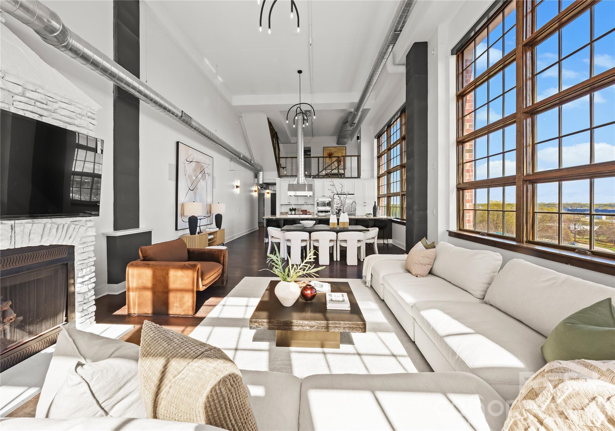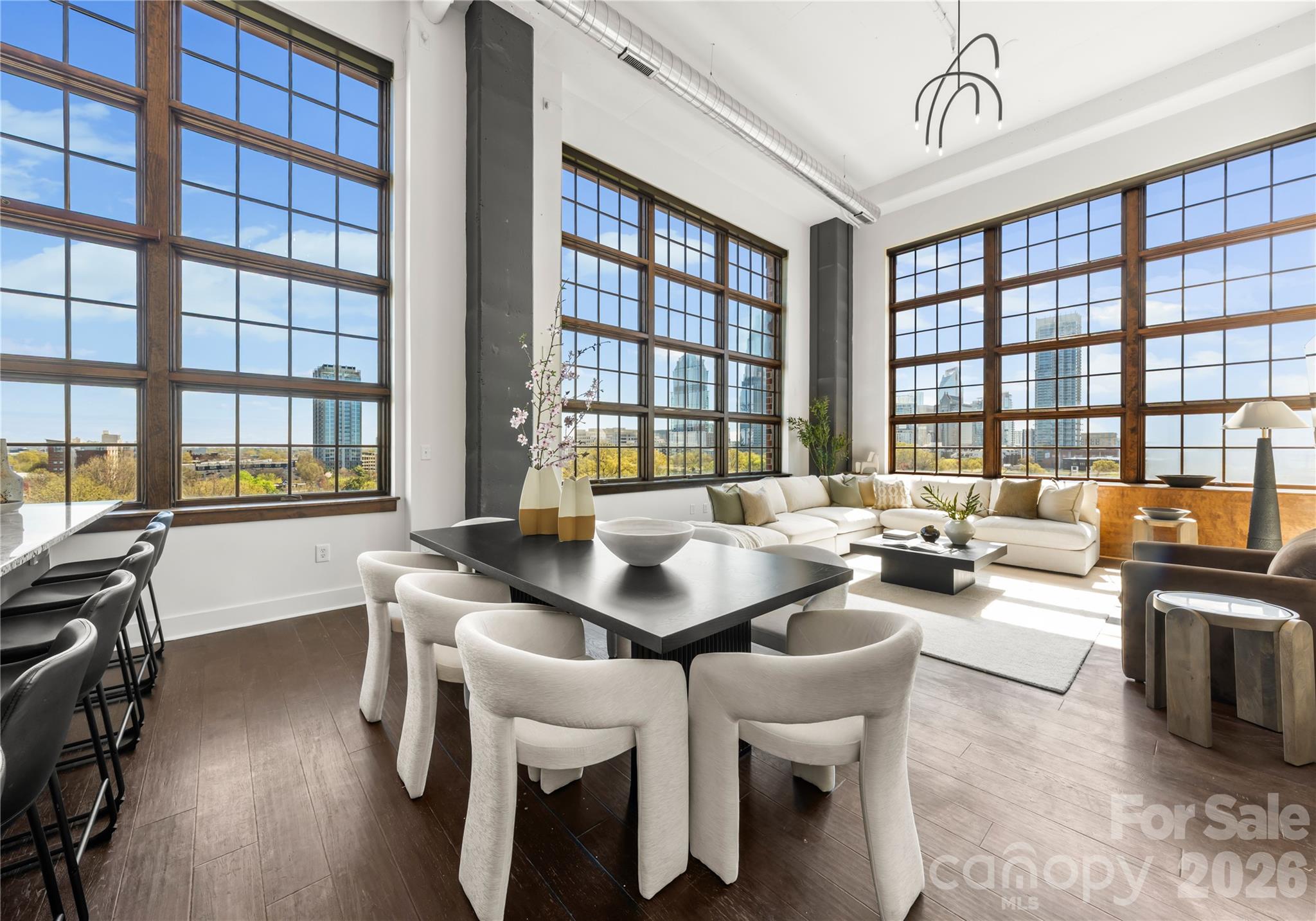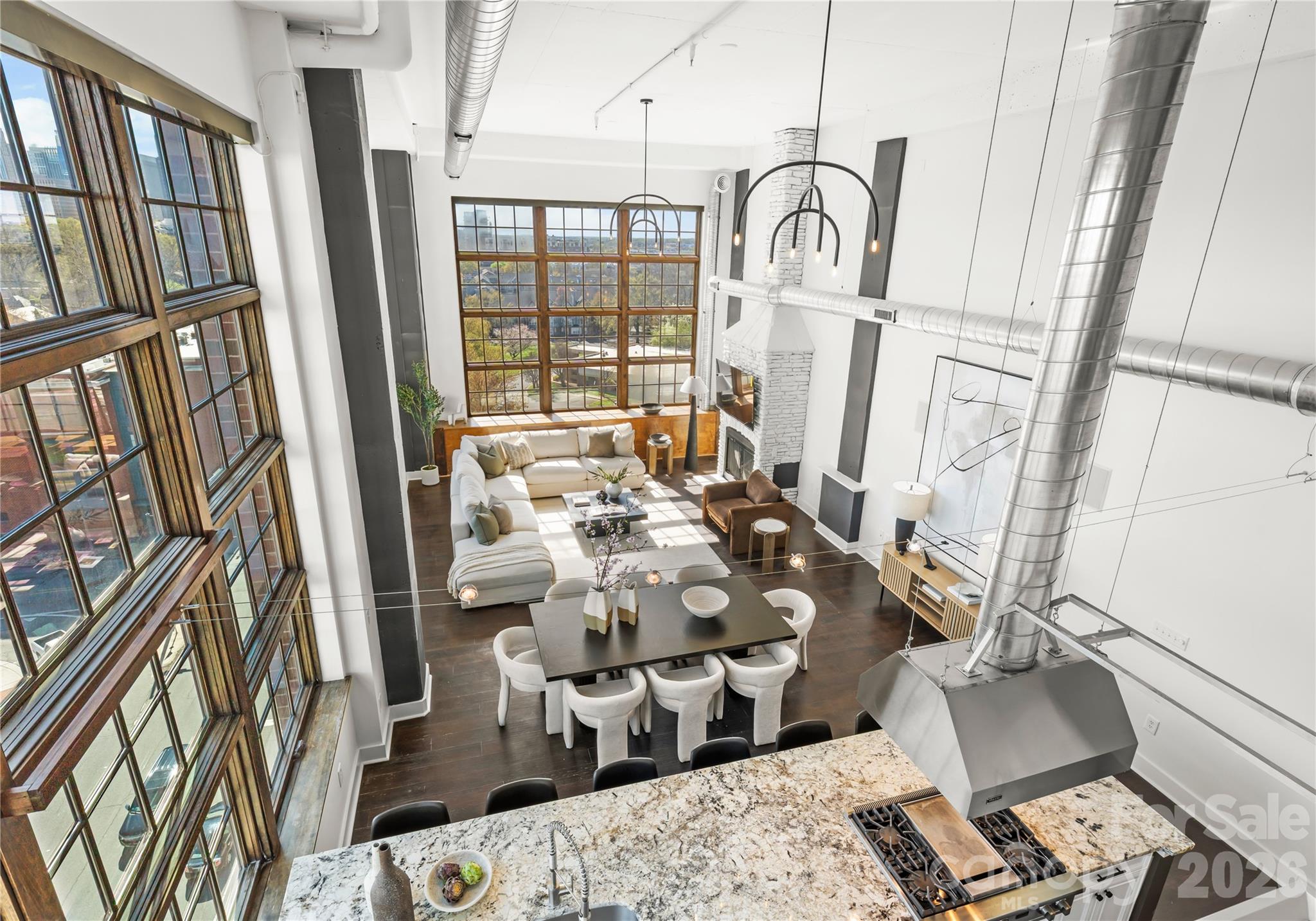 Welcome to The Penthouse at The Garrison at Graham—one of Uptown Charlotte’s most distinctive and architecturally striking residences. Occupying the prime top-floor corner of the building, this remarkable three-story penthouse spans approximately 2,750 square feet of sophisticated loft-style living and is framed by two dramatic walls of 12-foot floor-to-ceiling windows that flood the home with natural light while showcasing breathtaking panoramic views of the Uptown Charlotte skyline. With the touch of a button, motorized shades reveal sweeping city vistas that transform throughout the day—from morning light pouring into the living spaces to dramatic sunset and twilight skyline views. The main living level offers a truly impressive sense of scale with soaring two-story ceilings, expansive window walls, and rich wood flooring that flow throughout the open-concept living and dining areas. A gas fireplace anchors the living space, creating warmth and ambiance while maintaining a sleek modern aesthetic. The layout is thoughtfully designed for both everyday living and elevated entertaining. The chef’s kitchen serves as the heart of the home and features a massive center island with granite countertops, stainless steel appliances including gas range, oven, microwave, beverage refrigerator, dishwasher, and exhaust hood, along with abundant cabinetry and prep space ideal for hosting gatherings. The open floor plan seamlessly connects the kitchen to the living and dining areas, allowing guests to gather comfortably while enjoying the skyline views beyond the windows. The second level features two spacious guest suites or flexible office spaces, each with its own full en-suite bathroom, offering privacy and versatility for guests, work-from-home needs, or additional living space. A private sauna adds a spa-inspired element rarely found in Uptown residences. A mid-level flex space with an additional full bathroom offers even more versatility—perfect as a media lounge, secondary office, fitness room, or guest bedroom depending on your lifestyle needs. The top floor is dedicated entirely to the owner’s retreat, creating a private sanctuary above the city. This level features a generous primary suite, spa-like bathroom, and expansive walk-in closet, offering a quiet escape while still enjoying the dramatic skyline backdrop. The crown jewel of this penthouse is the extraordinary private rooftop terrace—your own “backyard in the sky.” Designed for elevated outdoor living, this expansive terrace includes a covered outdoor living room with gas fireplace, built-in stainless outdoor kitchen, and an artificial turf lounge area that creates a rare and inviting urban outdoor experience. Whether hosting sunset gatherings or enjoying quiet evenings overlooking the skyline, the terrace offers a truly unforgettable setting.Additional highlights include four assigned parking spaces in the secured garage (two primary spaces equipped with vehicle lifts), along with secure building access and gated entry, providing both convenience and peace of mind. The Garrison at Graham is a boutique luxury condominium building located in Uptown Charlotte’s historic Fourth Ward, known for its blend of modern loft-style architecture and neighborhood charm. Residents enjoy access to a shared rooftop social terrace featuring outdoor lounge areas, grilling stations, fireplaces, and sweeping city views, located conveniently on the same floor as the penthouse. Positioned along N Graham Street, the building offers exceptional walkability to Uptown’s vibrant lifestyle—including the NC Music Factory, professional sports venues, cultural attractions, restaurants, and nightlife—placing the very best of Charlotte’s urban energy just moments from your front door.