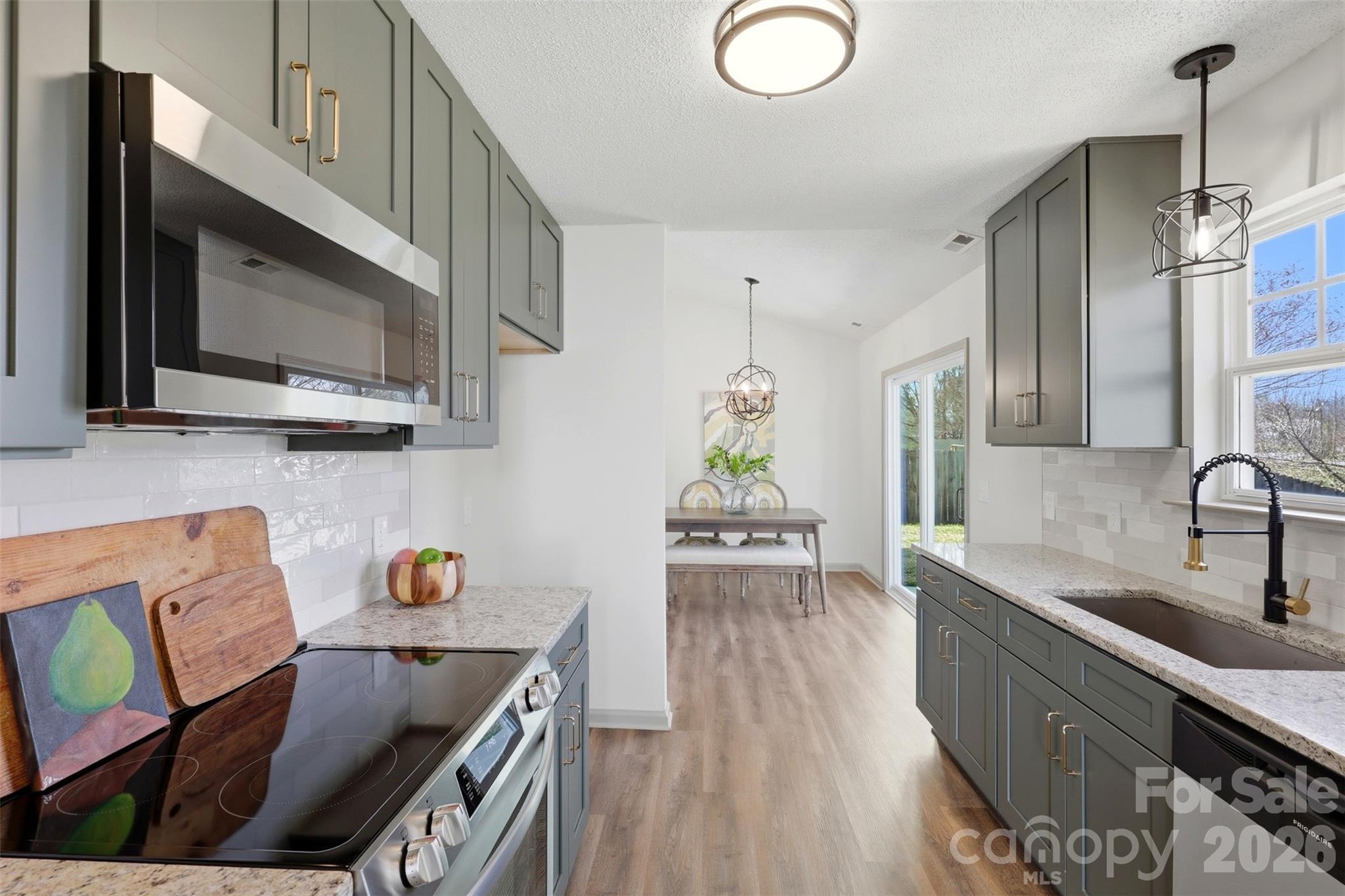 Renovated to perfection, this 3-bed, 2-bath home offers modern updates and incredible value, located less than 15 minutes from Uptown Charlotte. Upon entry, you’re welcomed into a bright and inviting main living area with vaulted ceilings that create an open, airy feel. The living room flows seamlessly into the dining area just off the kitchen, creating an open-concept plan, perfect for everyday living and entertaining. The beautifully updated kitchen features rich forest green cabinetry, granite countertops, tile backsplash, gold hardware, and stainless steel appliances—Bringing a designer touch to the heart of the home! Thoughtful upgrades include fresh interior paint, new LVP flooring & carpet, and modern light fixtures that elevate the space. Both bathrooms have been refreshed with new vanities, updated hardware, and upgraded design touches; making for a completely move-in ready home. The primary suite features an ensuite bath with walk-in shower & two additional bedrooms share their own bath. Rear concrete patio overlooks the backyard— Perfect for enjoying NC weather year-round! Major 2026 updates include a new roof & HVAC, bringing peace of mind for years to come. Priced at just $285K, this home offers an incredible opportunity for affordable homeownership while still being close to everything Charlotte has to offer. Through preferred lender, this property qualifies for up to $10,000 in incentives—up to $5,000 toward closing costs, $5,000 to reduce down payment AND no PMI (subject to lender approval and buyer qualification). Contact listing agent for details!
