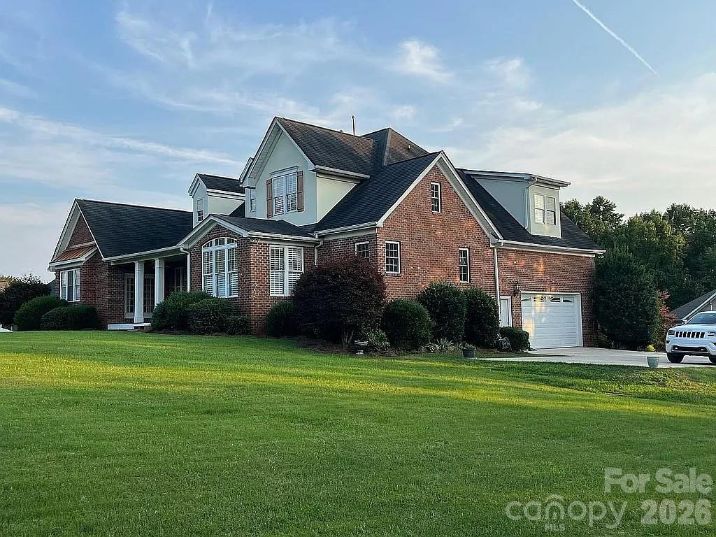 This beautiful custom home is located in the desirable Larkin Golf Club community in Statesville, offering spacious living areas on a large lot backing up to the 9th fairway. This all-brick home with stucco dormers features cathedral ceilings in the entryway and living room, custom crown molding, plantation wood blinds, and ¾" tongue-and-groove hardwood floors throughout much of the main level. The living room showcases skylights and a gas fireplace, creating a warm and inviting gathering space.