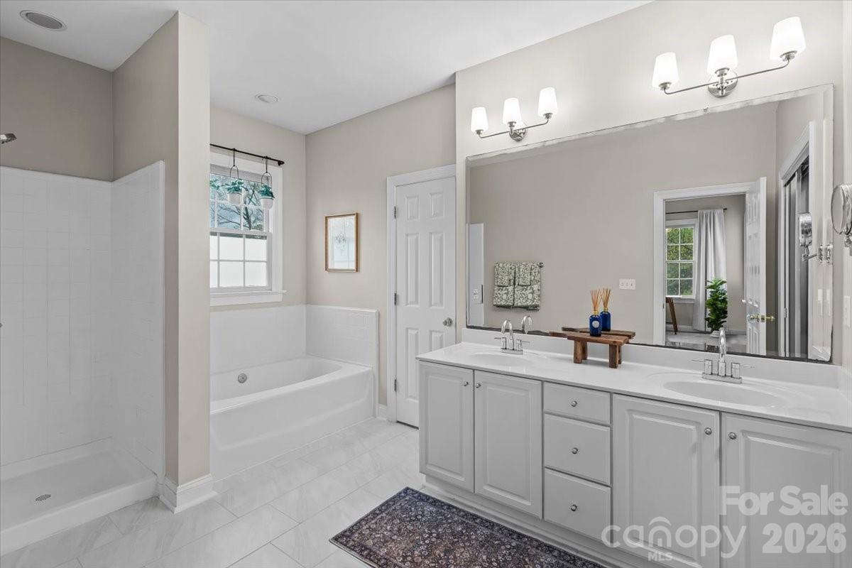 All bedrooms are located upstairs, including an oversized primary retreat with a vaulted ceiling and abundant natural light. The en-suite bath features dual vanities, a soaking tub, and a separate shower. Two secondary bedrooms offer flexibility for guest space, office, or additional living needs, while the bonus room with vaulted ceilings can function as a fourth bedroom, media room, or play space.