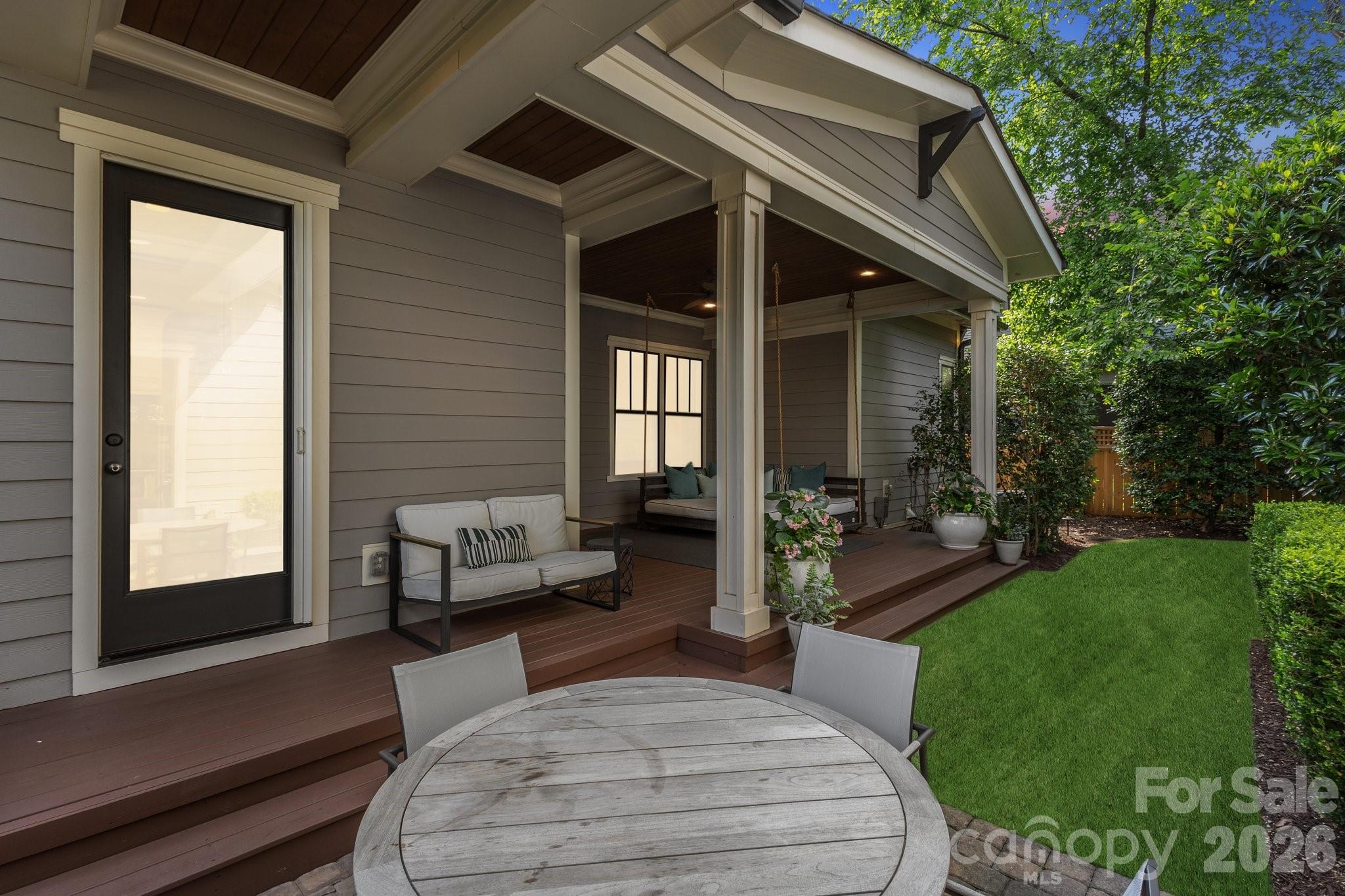 Glass doors open to a covered deck alcove with a king-size hanging bed and wall-mounted television, extending the living area outdoors. A pantry and mudroom provide additional storage and a convenient transition space between the kitchen and the outdoor courtyard. The main-level primary suite includes a custom walk-in closet and private bath. Upstairs, a large central media loft connects four bedrooms, including the second primary suite with a spacious bath. Secondary bedrooms are generously sized and include walk-in closets. Laundry rooms are located on both the main and upper levels.Outdoor living includes several comfortable gathering areas. A covered courtyard features a stone gas fireplace and connects to a landscaped backyard with artificial turf, attractive shrubbery, privacy fencing providing a safe place to play. A wraparound back porch leads to a breezeway connecting the home to a detached two-car garage. Above the garage is a fully equipped apartment. The suite includes a kitchen, bath, laundry, and living space, ideal for guests, office, nanny or rental income. An elevated front yard with a stone stairway leads to the front porch overlooking the neighborhood.This home offers a rare opportunity to own a spacious and flexible Craftsman-style residence with guest quarters in one of Charlotte’s most desirable and connected neighborhoods.