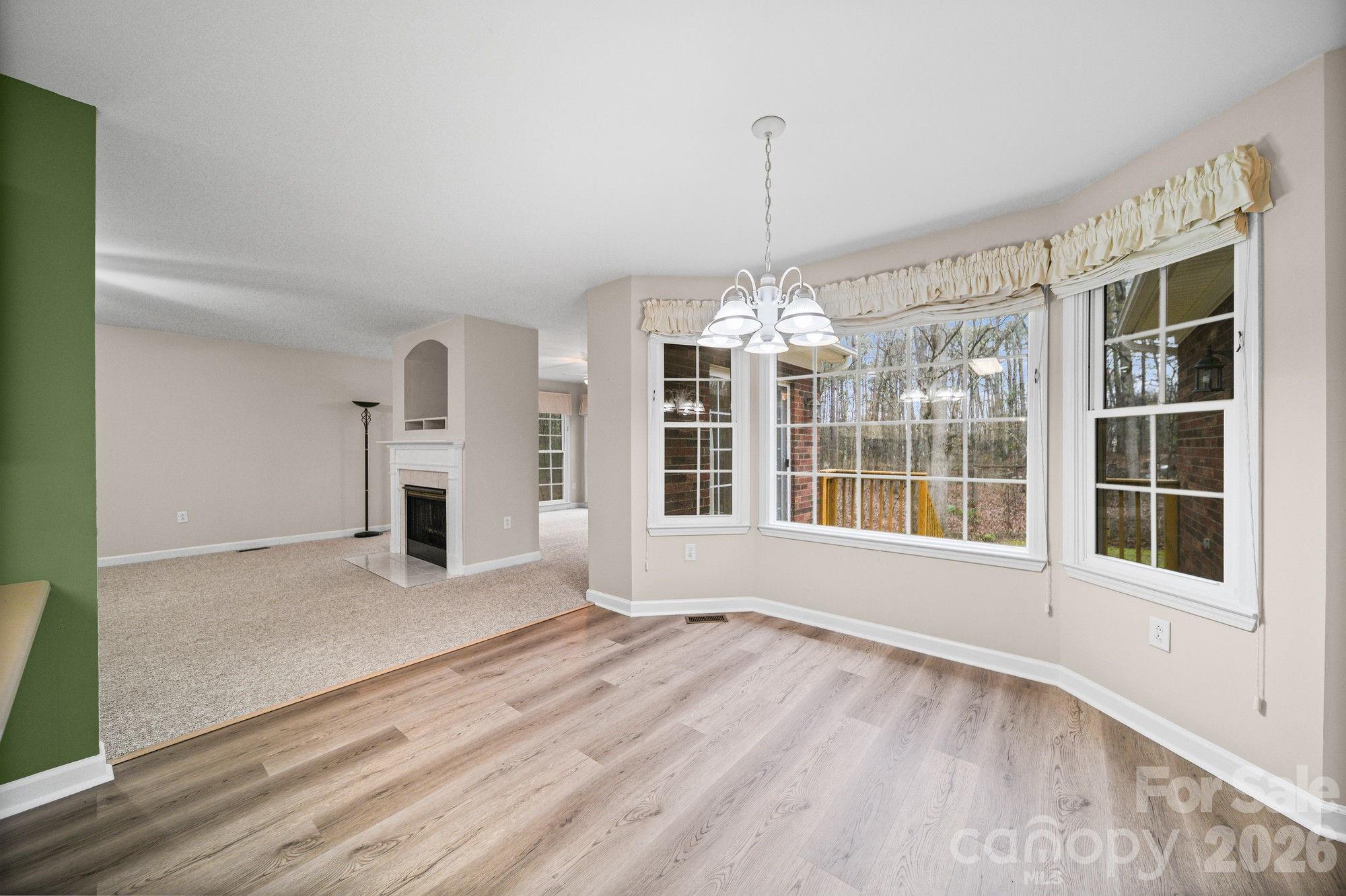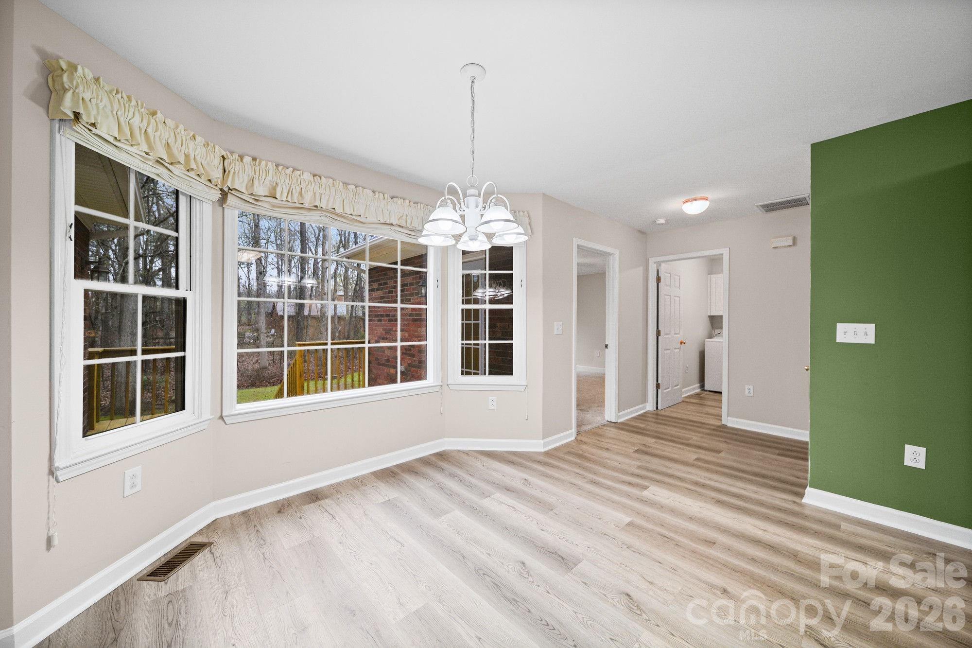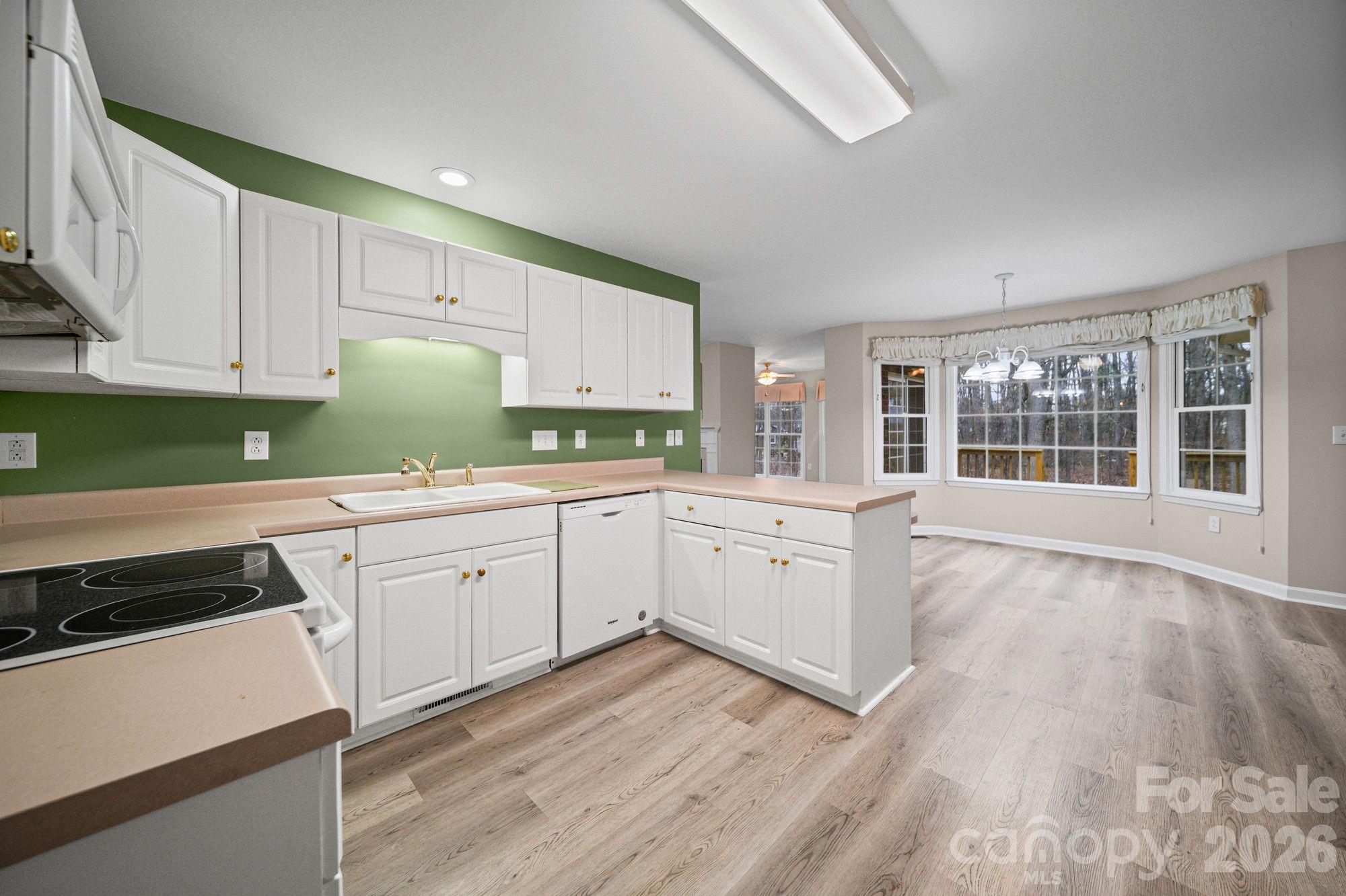 The kitchen flows seamlessly into a bright breakfast nook, while a dedicated dining room sets