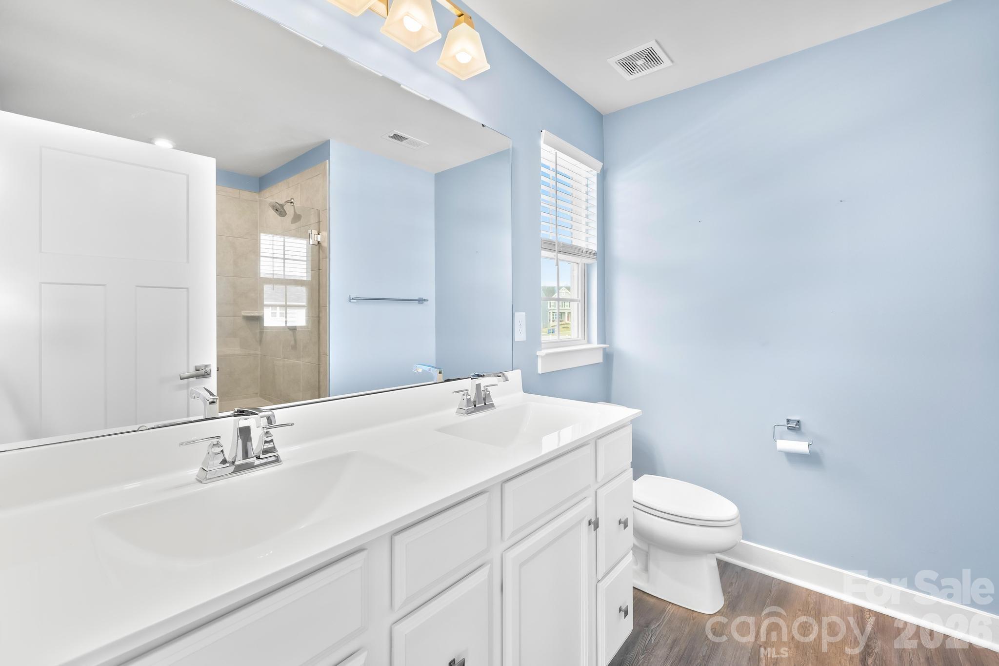 Upstairs, the primary suite offers plenty of space for a king-size bed and includes two walk-in closets. The primary bath features a dual-sink vanity and a beautifully tiled shower with dual shower heads and a built-in bench. Three additional bedrooms—all with ceiling fans—provide flexibility for family, guests, or home office needs. The laundry room stands out with decorative wallpaper and added shelving for both style and function.