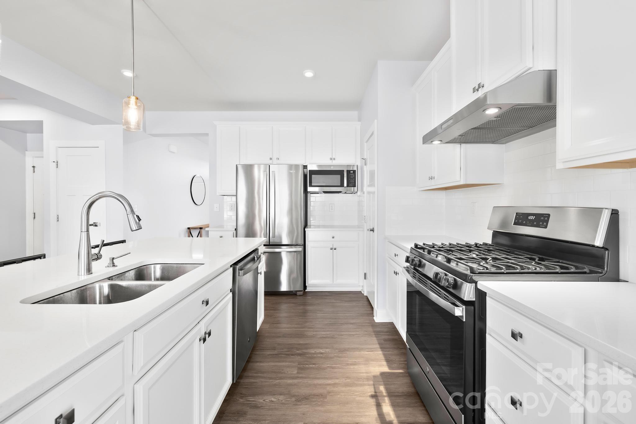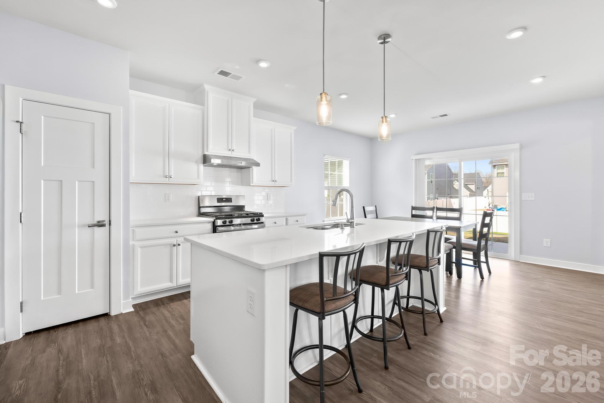The open-concept kitchen, dining area, and family room are designed for both everyday living and entertaining. The kitchen features 42" white cabinets with a convenient trash can rollout, quartz countertops, subway tile backsplash, stainless steel appliances, a gas range, pantry, and a spacious island with seating for casual meals. A roomy dining area and comfortable family room create a seamless flow for gatherings.