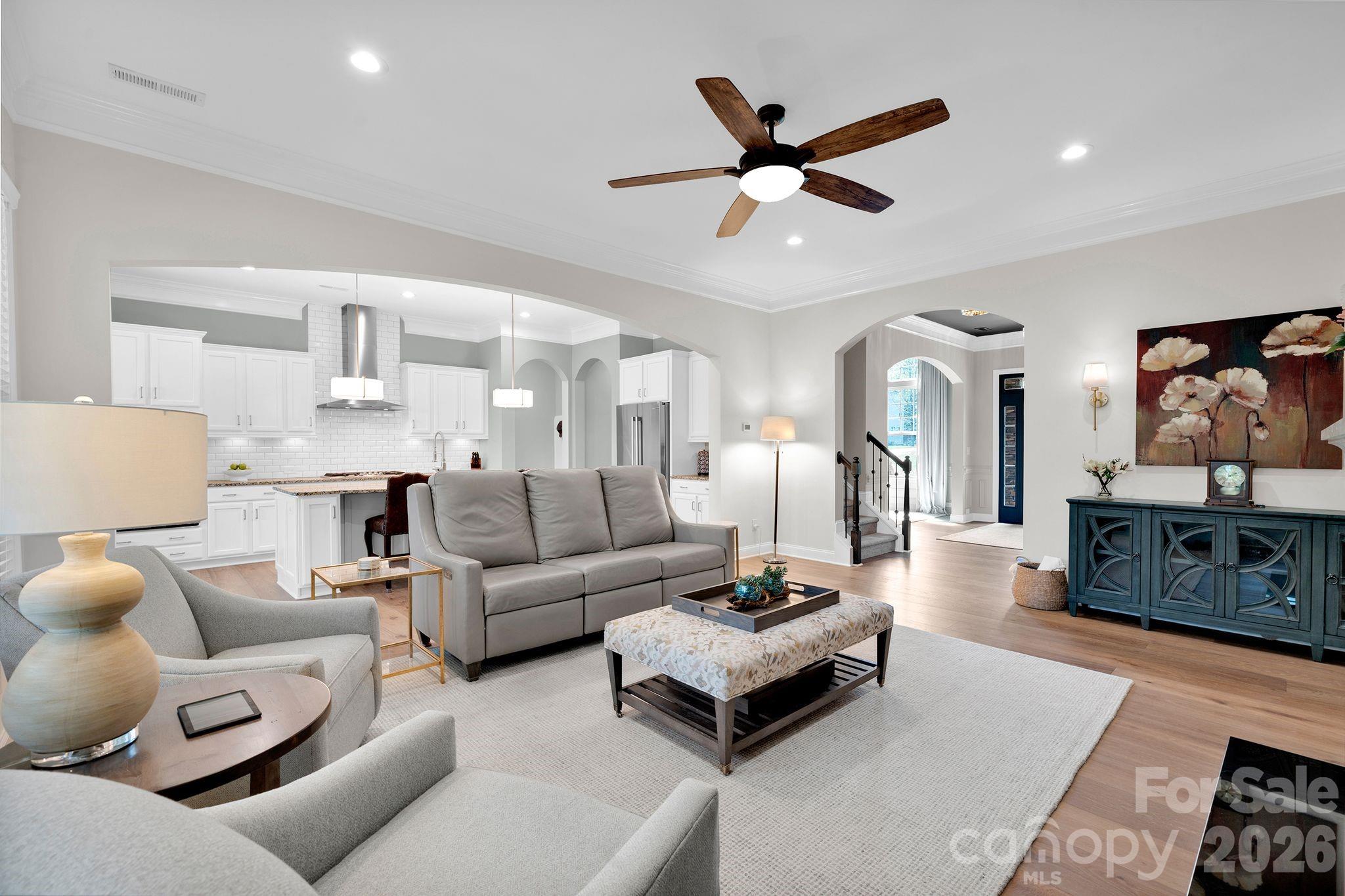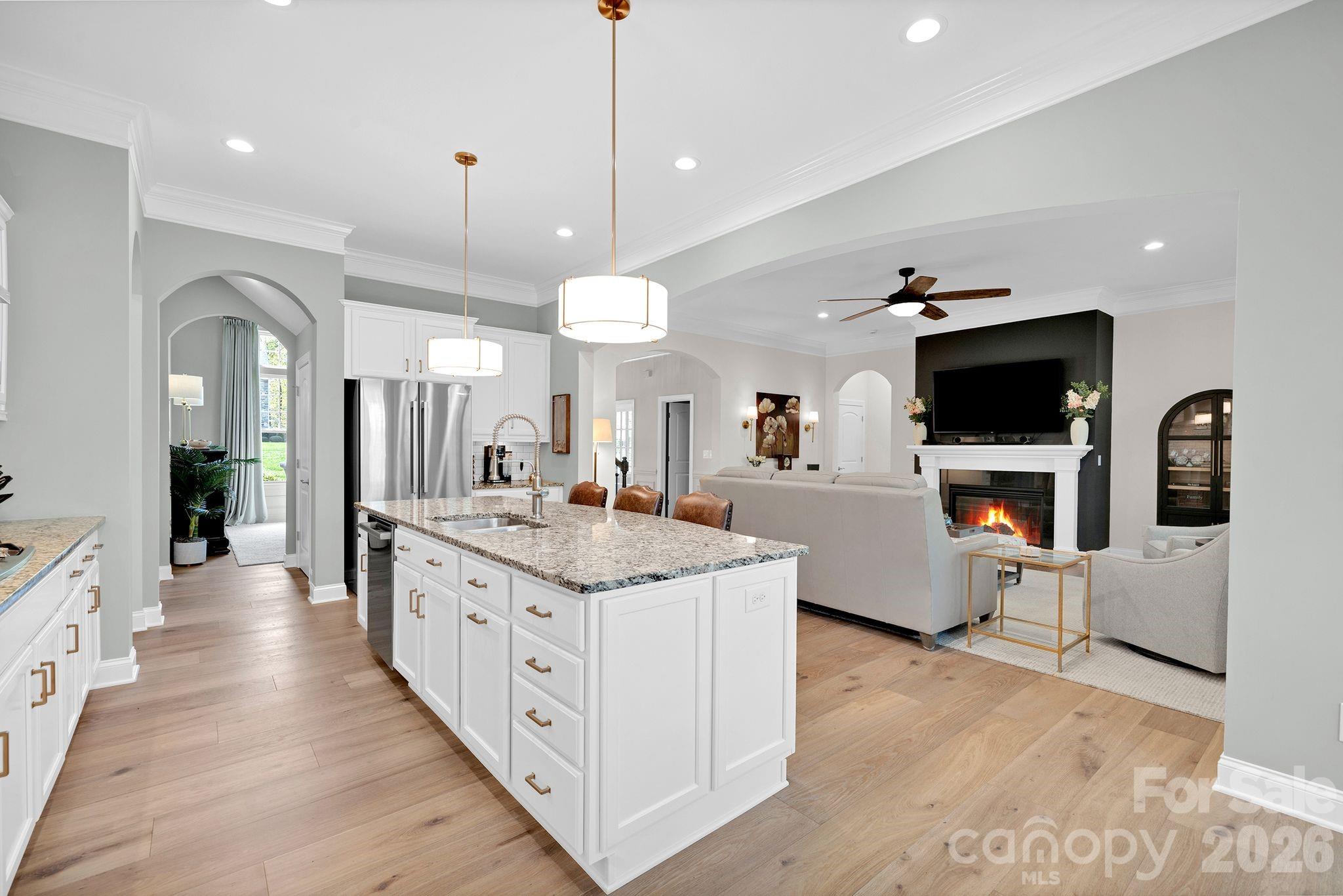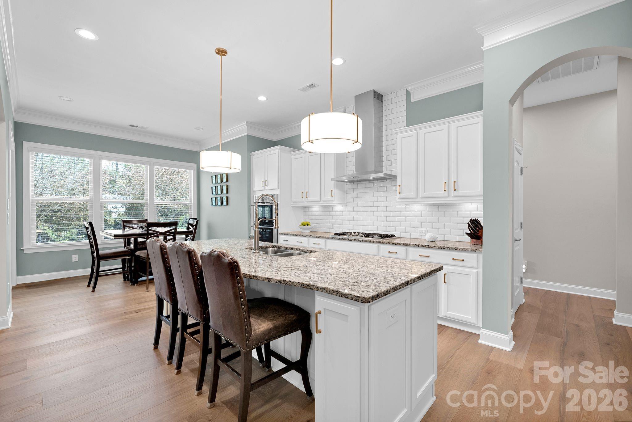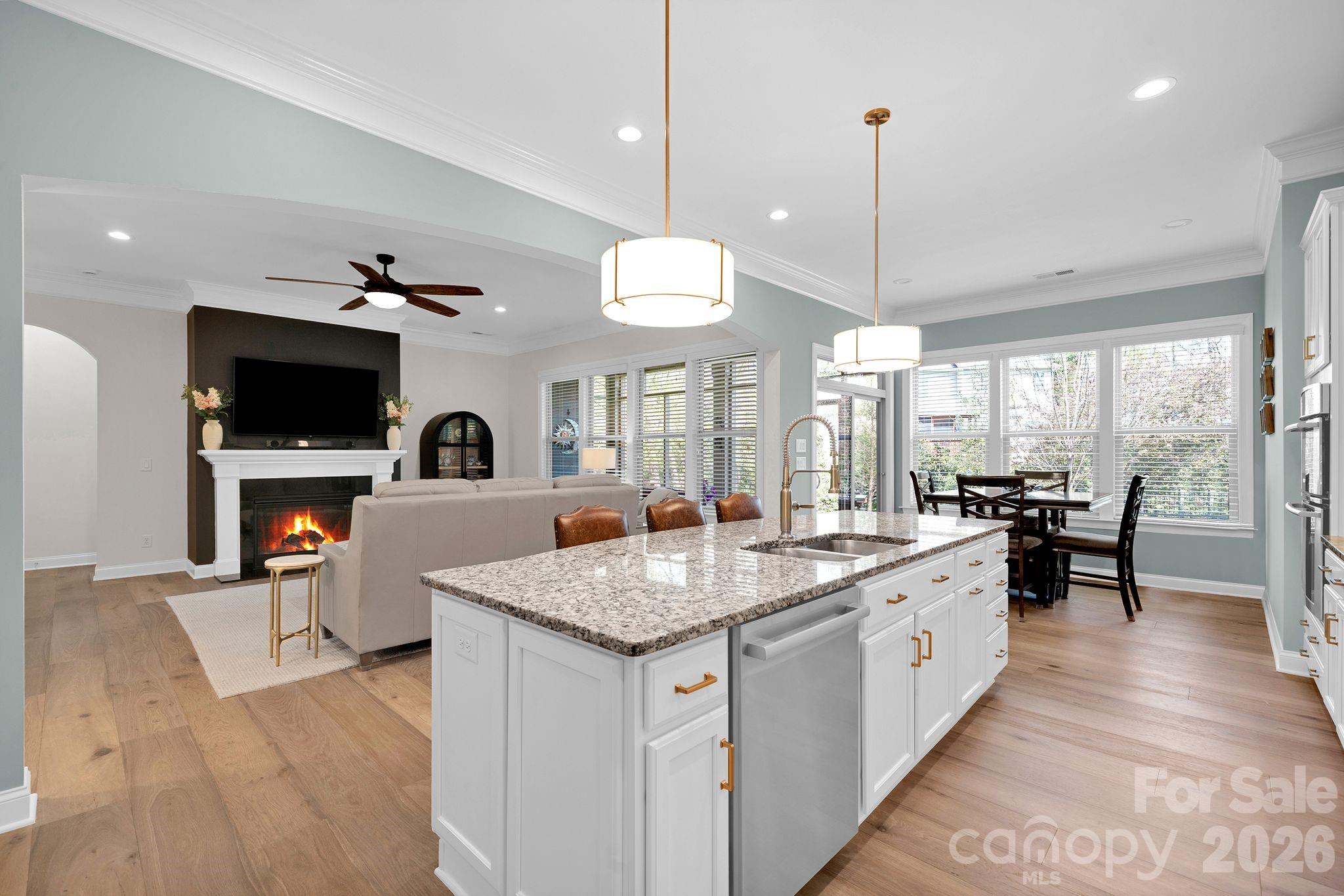 Recent upgrades include new engineered-hardwood flooring (2024), Bosch dishwasher & Bosch refrigerator (2024), updated lighting, garage springs and tracks (2024), water heater (2022), exterior paint (2024), interior paint (2026), and freshly painted cabinets (2026). Custom ShelfGenie pull-outs add convenience and organization throughout the kitchen.
