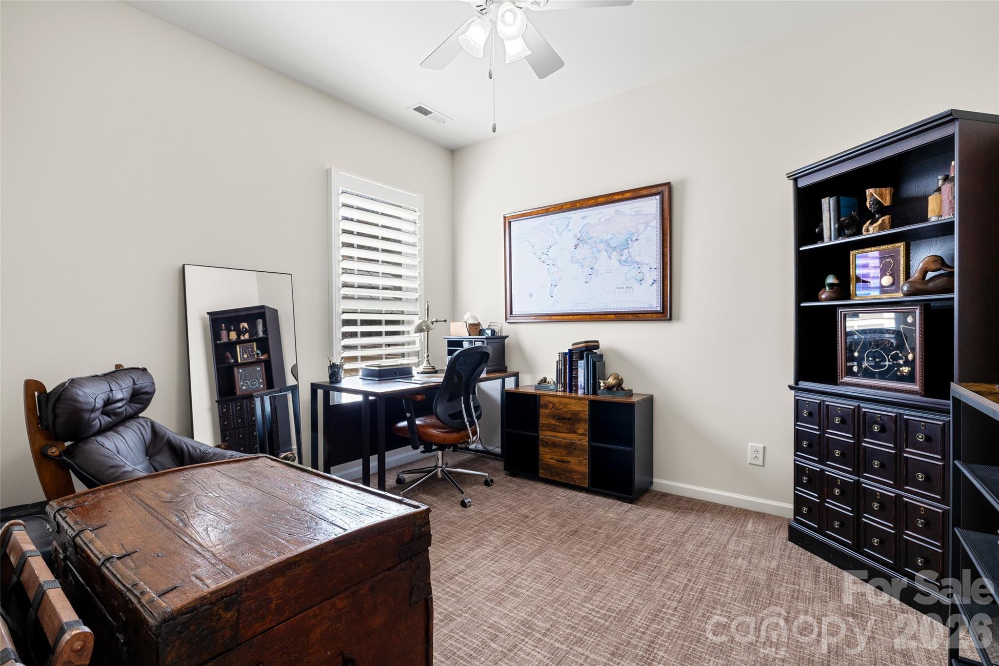 The private primary suite at the rear of the home offers a custom walk-in closet with custom panels, shoe storage, and drawers, along with an en-suite bath featuring dual vanities, a glass shower, and upgraded tile flooring. Two additional bedrooms provide flexibility for guests, hobbies, or office space and share a full bath with updated tile flooring. Recent updates include a 2024 HVAC system and new carpet in the primary and one guest bedroom. The washer and dryer remain with the home. Additional highlights include plantation shutters, custom closet systems, and a widened driveway.