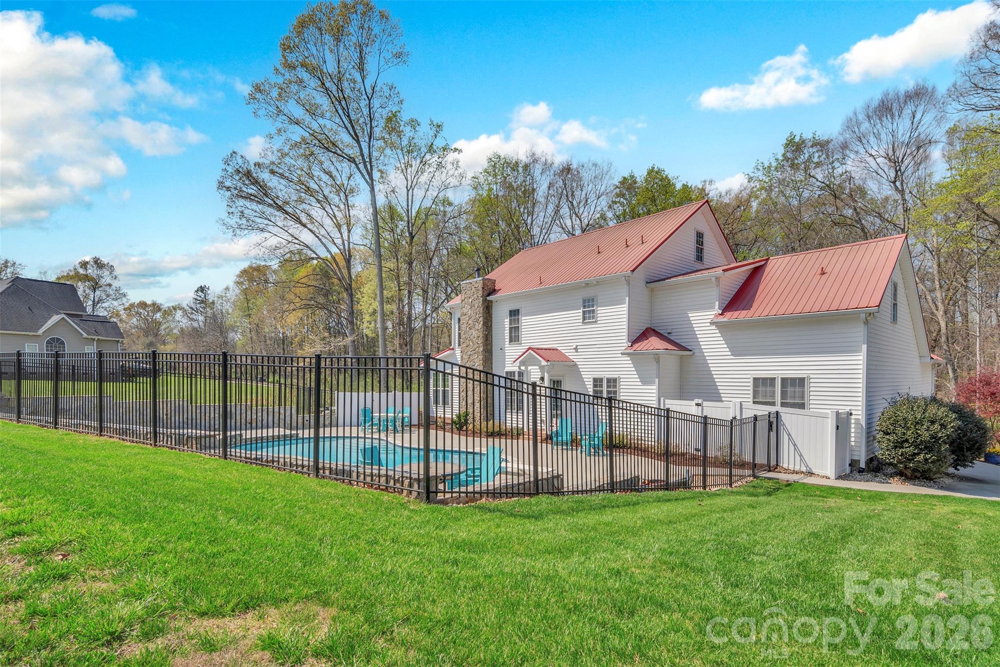 Custom Farmhouse in Mt Holly, NC. Private setting with amazing outdoor spaces. Stunning wrap around front porch with composite decking overlooking a serene, wooded area adorns the front. The back features a show stopping resort quality inground pool complete with outdoor lighting, ReVamp concrete coating in both the pool area (as well as the garage), adjustable cascading waterfalls, knee ledges, and a beautiful built-in outdoor fireplace. The pool area is fenced with tasteful black aluminum fencing while the side yard features a separate fenced pet area. Immaculate interiors spotlighting well over 3000 sq ft. Hardwood floors, supreme chef’s kitchen with oversized island and walk-in pantry, main floor bedroom/flex space, separate living room, family room, office, and 17 ft sunroom room all on main. Home features 3.5 baths. Upstairs you will find the expansive primary suite up along with 2 additional bedrooms, loft and bonus room. No HOA, no city tax, 0.68 acres, spacious workshop. This home is a dream, make it your reality!