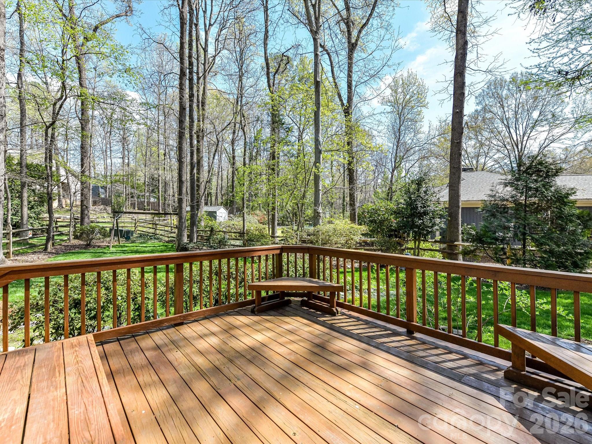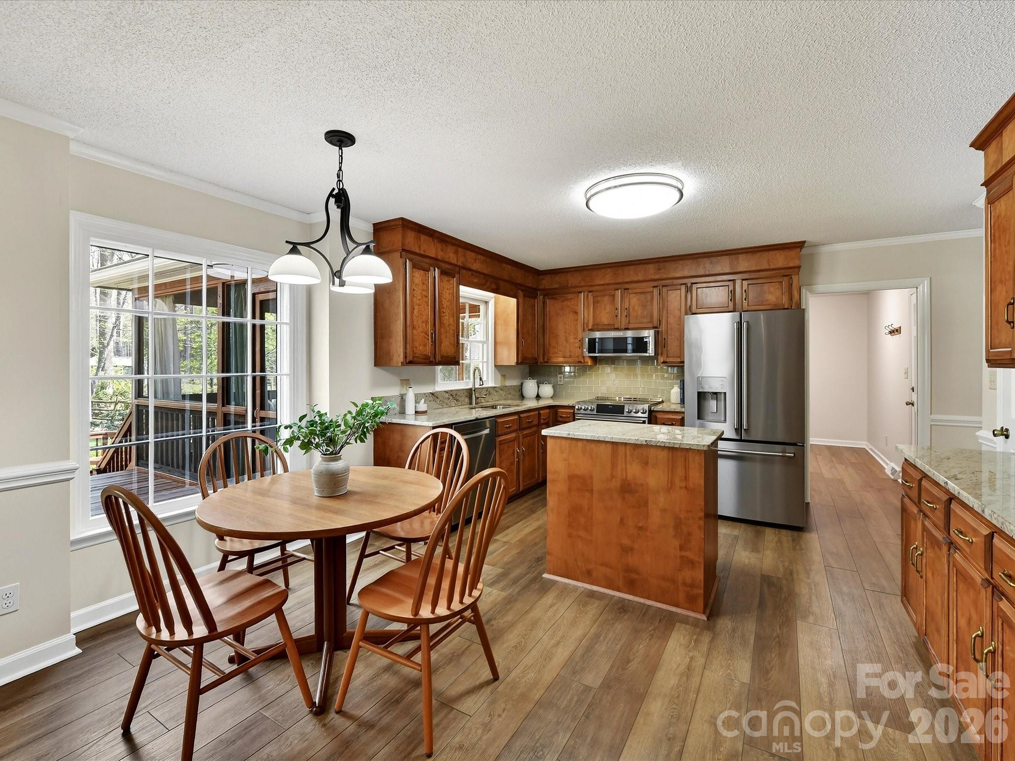 Charming 4-bedroom home in Hampton Leas with plantation shutters throughout and LVP flooring on the main level. A welcoming foyer opens to a spacious living room and formal dining room. The open kitchen features granite countertops, an island, GE Café induction range and refrigerator, KitchenAid microwave, Bosch dishwasher, and a large pantry. The kitchen flows seamlessly into the family room with a wood-burning fireplace, built-ins, and views of the tree-lined backyard. The primary suite offers a walk-in closet and en-suite bathroom with quartz countertops and a tiled shower. Bedrooms 3 and 4 also include walk-in closets, with a hall bathroom featuring a quartz vanity and tub/shower combo. Enjoy outdoor living on the deck or screened porch overlooking the serene and private backyard. Additional highlights include a 2-car garage with storage room, laundry room with cabinets, attic storage with new extra-wide aluminum folding stairs, and patio wiring and plumbing ready for a hot tub on the patio. Ideally located off Providence Road with easy access to SouthPark, Uptown, and The Arboretum!