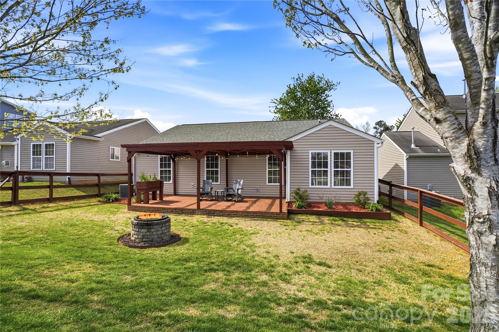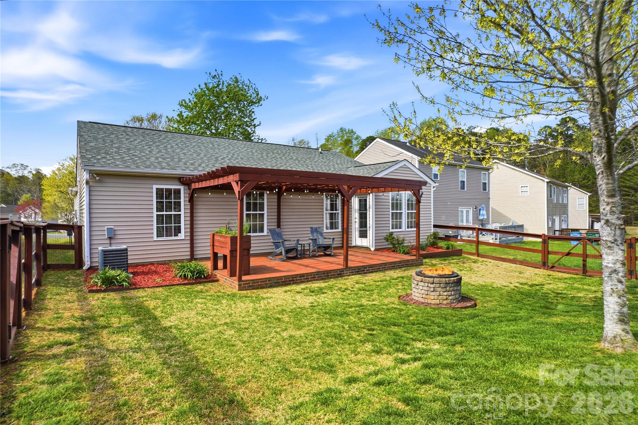 Multiple offers received. Any and all offers due by 2pm Sunday, March 29th. Offers will be reviewed within 24 hours. Immaculate and well maintained 3 bedroom, 2 full bath home featuring vaulted ceilings and tile flooring throughout, creating a bright, open feel with easy maintenance. A welcoming entryway fills the home with natural light and leads into a spacious living room with a built in electric fireplace, offering a warm and inviting focal point. Kitchen showcases freshly painted cabinets, ample counter space, a dedicated coffee area, and an eat in kitchen space, making it both functional and inviting. The primary suite offers a private retreat with an en suite bath featuring a garden tub, while both bathrooms have updated vanities for a clean, modern touch. The backyard is a standout feature, fully fenced and thoughtfully designed with a raised bed garden, firepit, and a beautifully finished brick patio with pergola, creating the perfect setting for outdoor living, entertaining, or simply unwinding. Pride of ownership shows throughout, with sellers who have meticulously cared for and updated the home, including a new roof that adds peace of mind and true move in ready appeal. The home is conveniently located near a cul de sac, offering a desirable setting within the neighborhood. Community amenities include a poolhouse, outdoor pool, playground, and walking trails, adding to the overall lifestyle this home provides. Ideally located with easy access to Interstate 485, Uptown Charlotte, Charlotte Douglas International Airport, and U.S. National Whitewater Center.