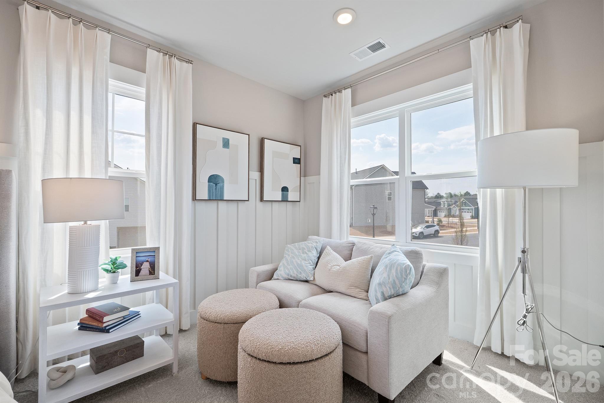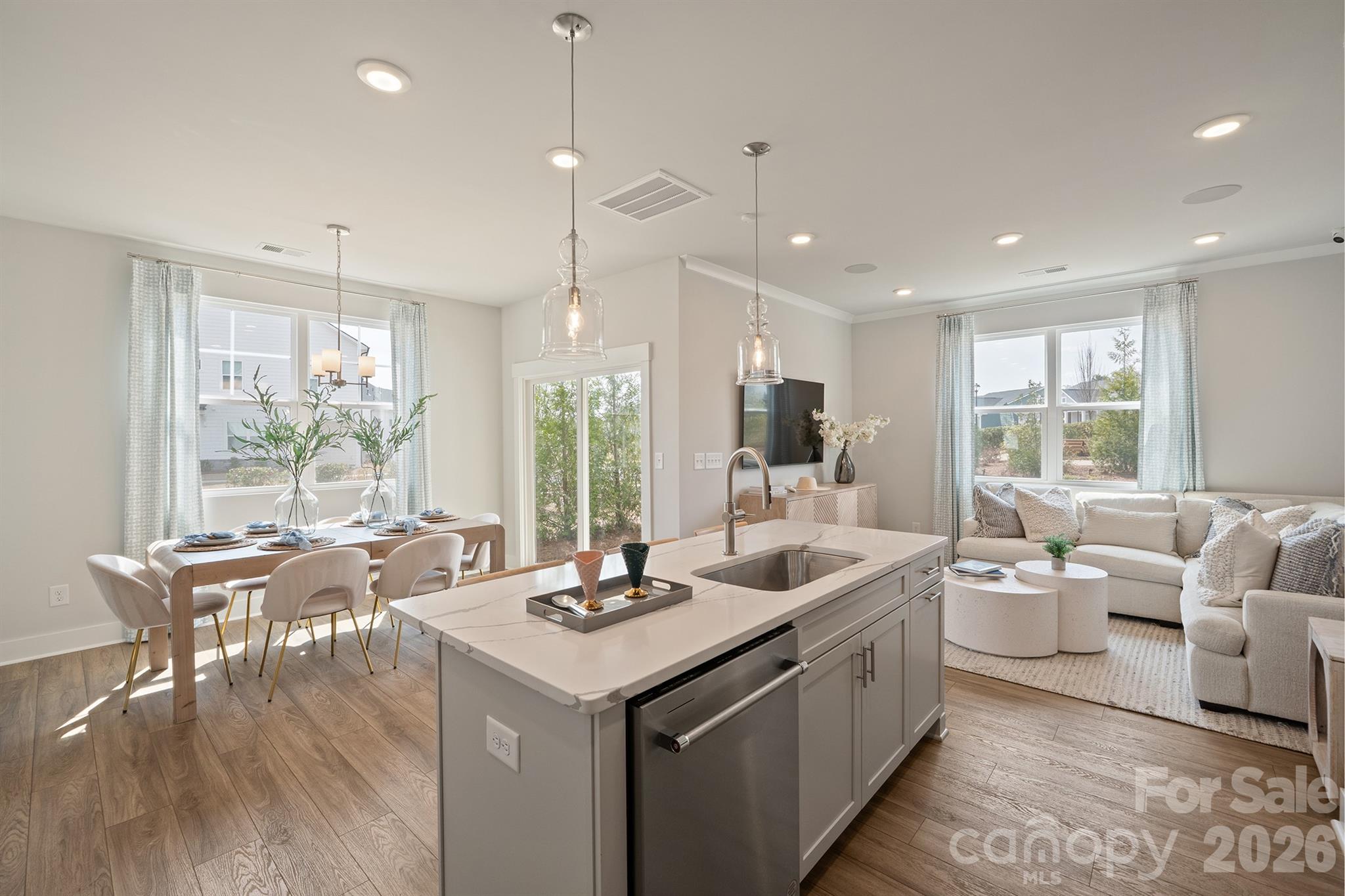 Fully-furnished model home in popular Griffith Lakes is now available for sale! This end-unit townhome on a corner lot is loaded with tons of updates. Starting with the exterior, find professional landscaping, Hardie plank siding, covered back patio with extension and firepit, and a 1-car attached garage. Step inside to beaming LVT flooring throughout living spaces on the main level, a home office with glass door, dining space, and a DREAM kitchen - white cabinets with soft close functionality, tile backsplash, stainless steel appliances (including gas range), quartz counters, center island, and pantry! 2nd level features loft area, 2 guest bedrooms, a guest bath with dual vanities, and a soaring master suite with sitting area and an ensuite bathroom - tile walk-in shower with bench, dual vanities, and an oversized walk-in closet. Laundry on 2nd level as well. Third level has bonus room/4th bedroom, and an additional loft. Full bath and unfinished attic space for additional storage. HOA includes lake access/kayak launch, fishing, walking trails, dog park, and playground. There will be an additional ability to opt-in to the amenity center upon it's completion later this year - clubhouse, pickleball, gym, pool, and bocce ball will be available. Great proximity to highways, uptown, UNCC, and local dining and shopping options! All furniture, decor, tv's, security cameras and appliances convey with the property - buy it and move right in!