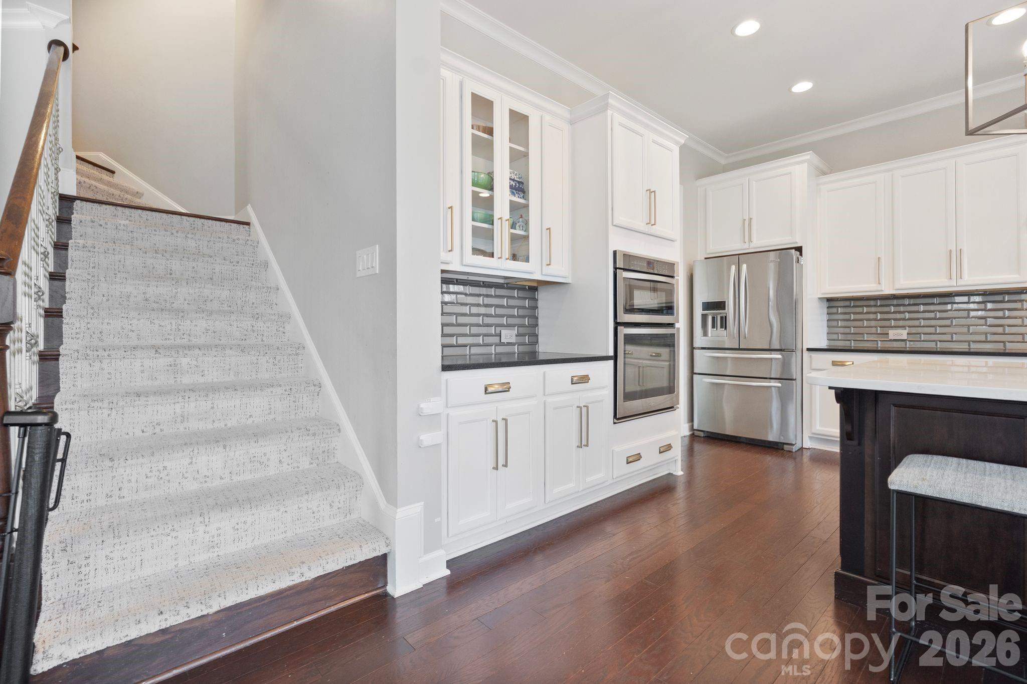 The open floor plan offers an ideal layout for everyday living and entertaining. The kitchen features leathered countertops along the perimeter, a beautiful white quartz island, stainless steel appliances including the refrigerator and an impressive tile backsplash.