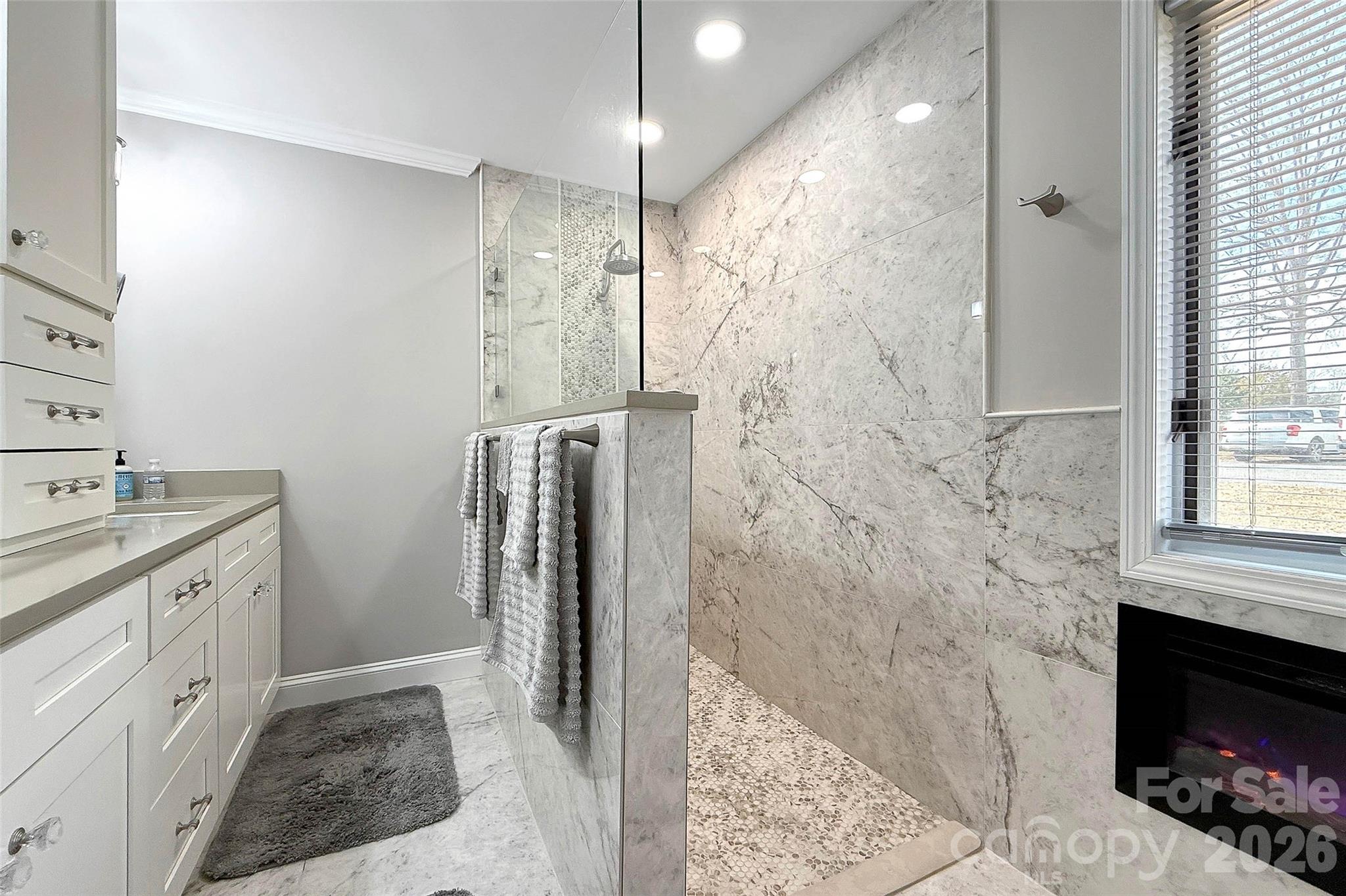 The owner’s suite is a retreat of its own, featuring double vanities, a spacious walk-in shower with open design, and a rare, standout feature—a fireplace in the bathroom, bringing a level of comfort and luxury that’s hard to find.