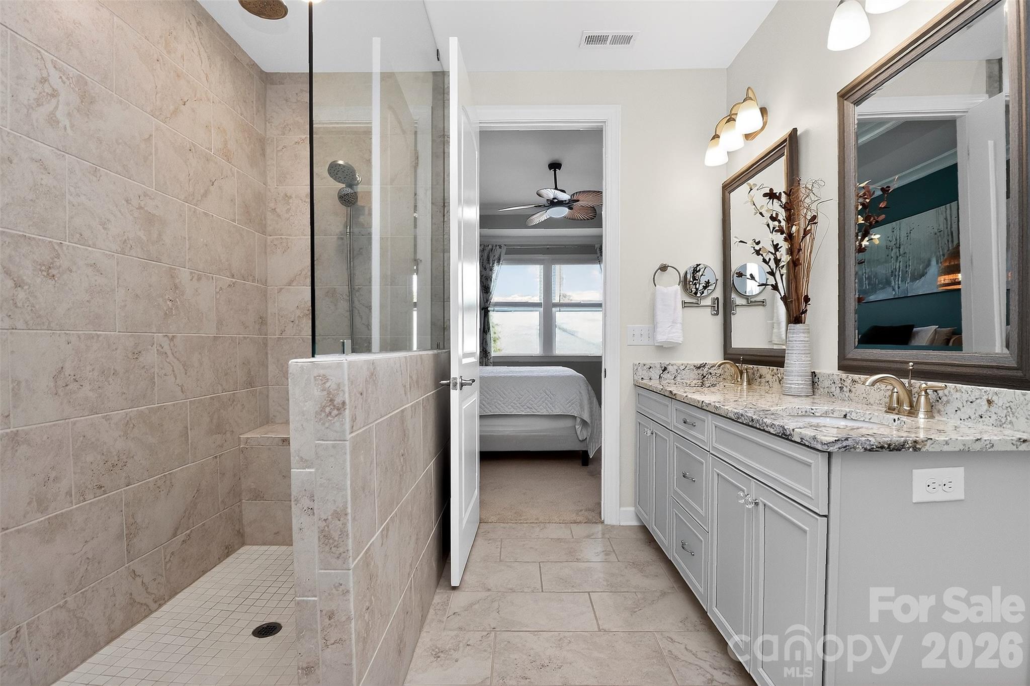 The private primary suite is tucked away at the rear of the home and offers a relaxing retreat with a spa-like en-suite bath complete with a zero-entry shower, dual vanity, and a generous walk-in closet. An accent wall adds a designer touch, elevating the overall feel of the space. A secondary bedroom and full bath are positioned at the front of the home, providing ideal space for guests. The flex room is perfect for a home office, hobby space, or additional living area.