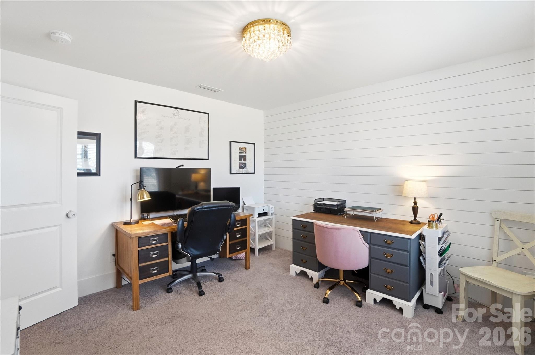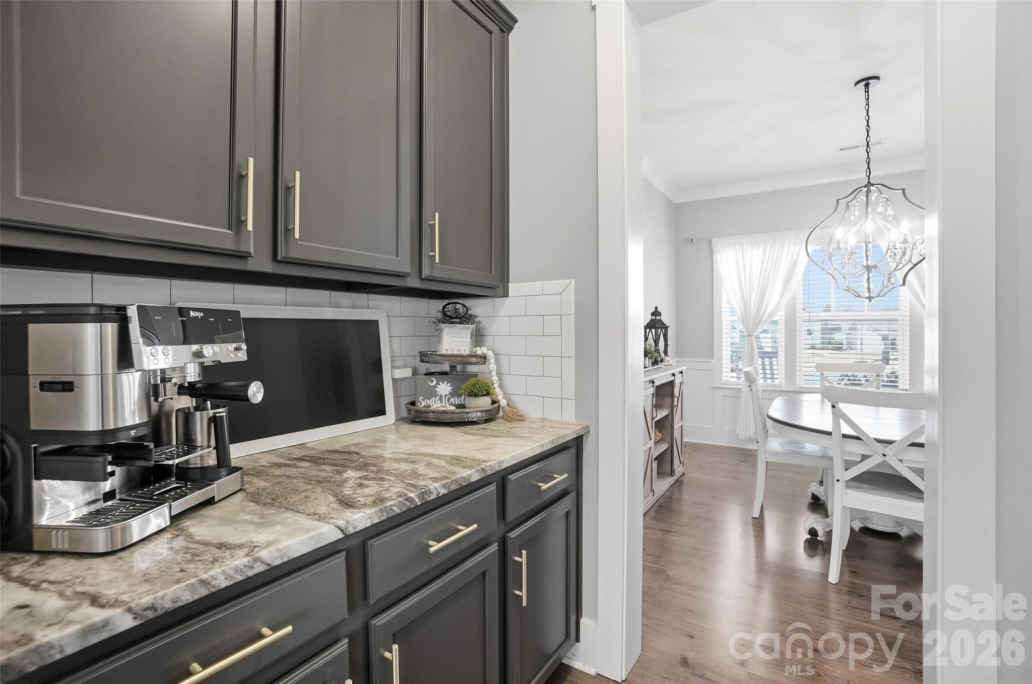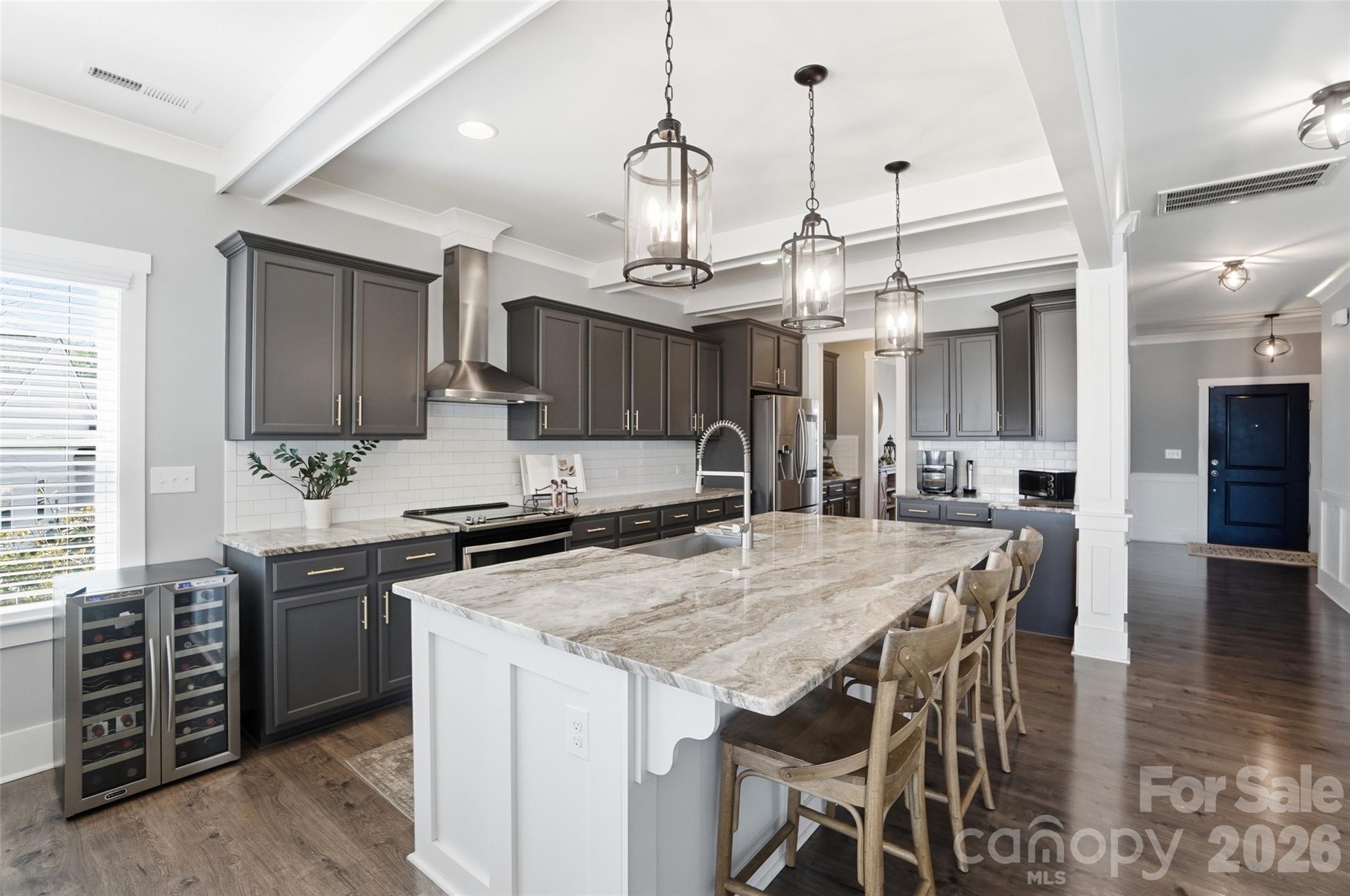 - Crown molding, beautiful flooring, wainscoting, barn doors, built-in cabinetry
